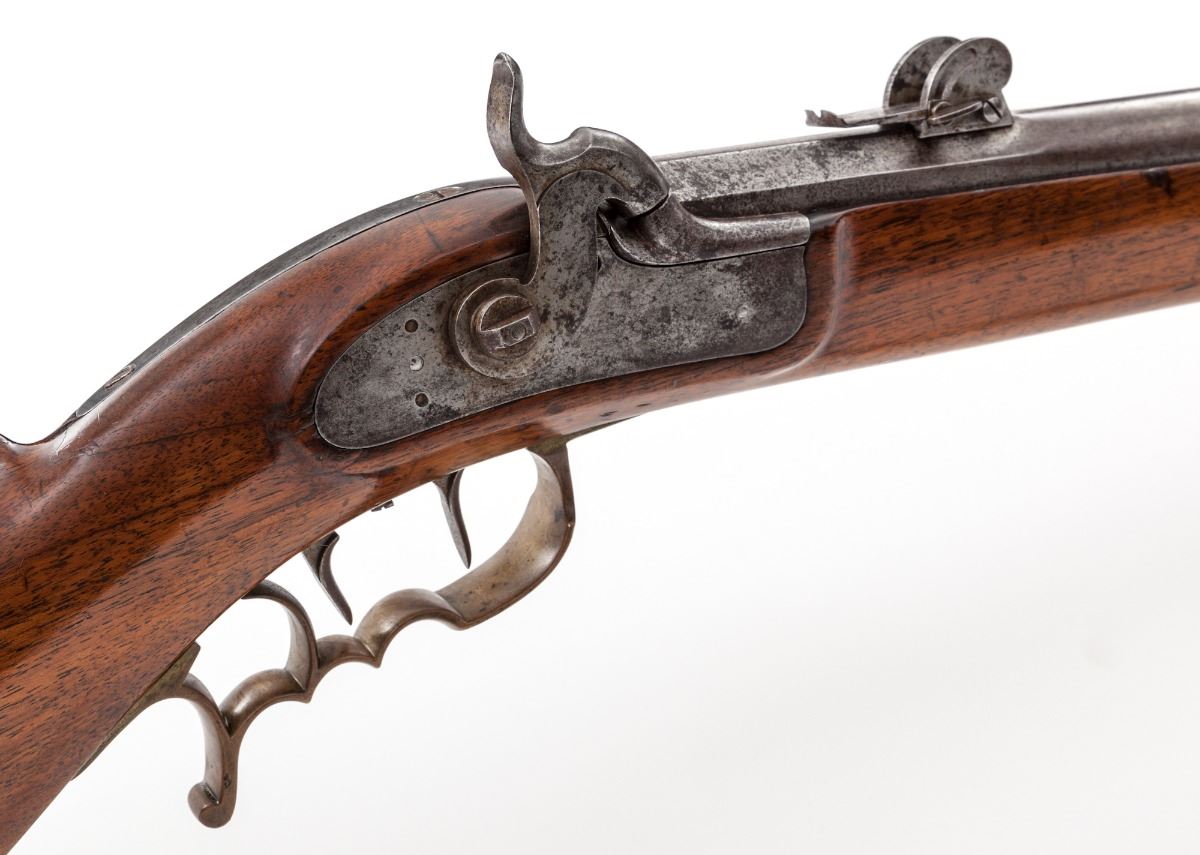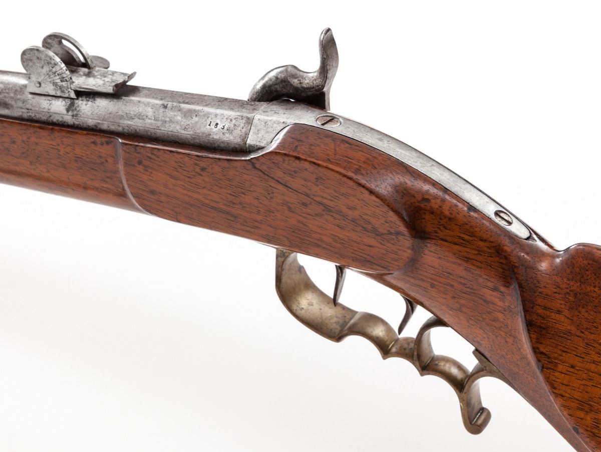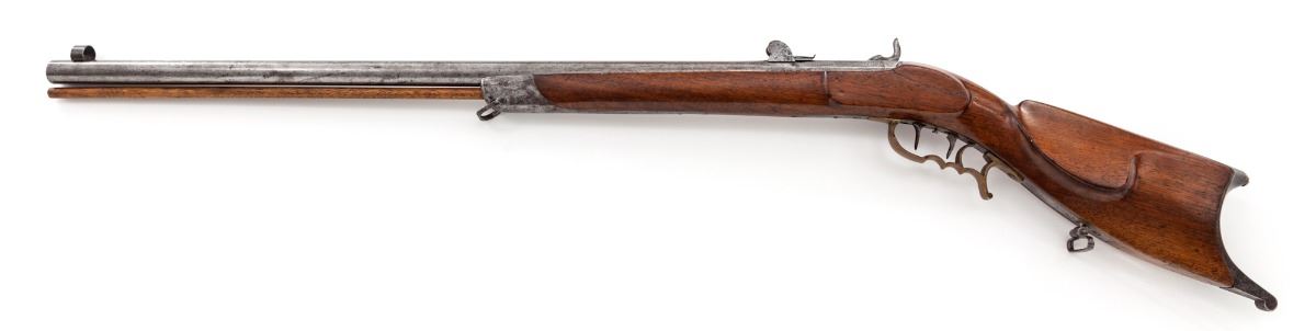 Antique Old Model Swiss Federal Military Rifle, #183, .64 cal., 35'' bright round barrel, Swiss cheekpiece half-length walnut stock, with brass triggerguard, double set triggers, dowel type ramrod, hooded front and Swiss style rear sights. Condition is very good to near fine. Metal components with light to moderate carbon spotting, more pronounced near percussion nipple. Repaired fissures to stock. Stock shows additional coat of varnish. Good working set triggers, very good bore. Est.: $800-$1,200. (Antique)