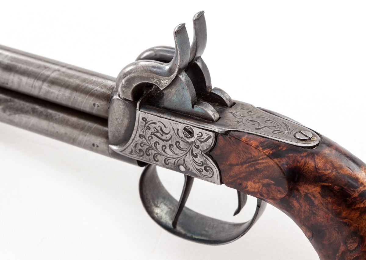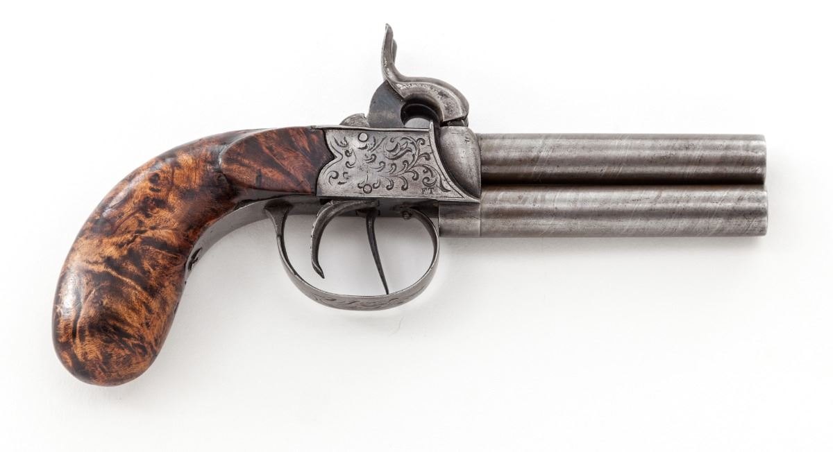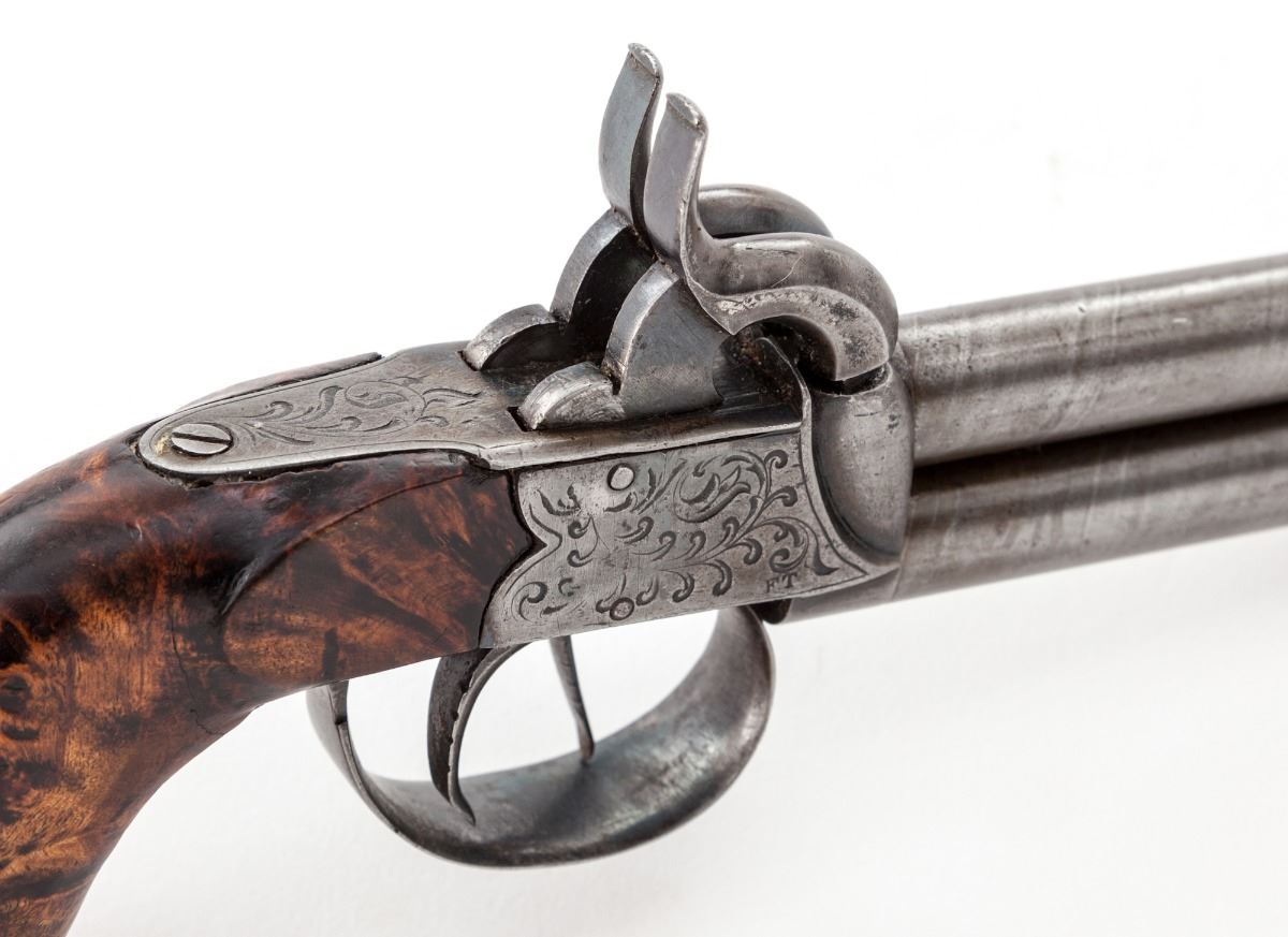 Continental Over/Under Percussion Pistol, NVSN, .36 cal., 3-1/2'' twist steel barrels, engraved frame and triggerguard, fancy burl bag-style grips. Condition is fine. Finish has thinned to approx. 40%. Barrel exhibits ''(crown)/V'' proofmarks to left side, with Liege proof between hammers. Grips, action and bore are good. Est.: $400-$600. (Antique)