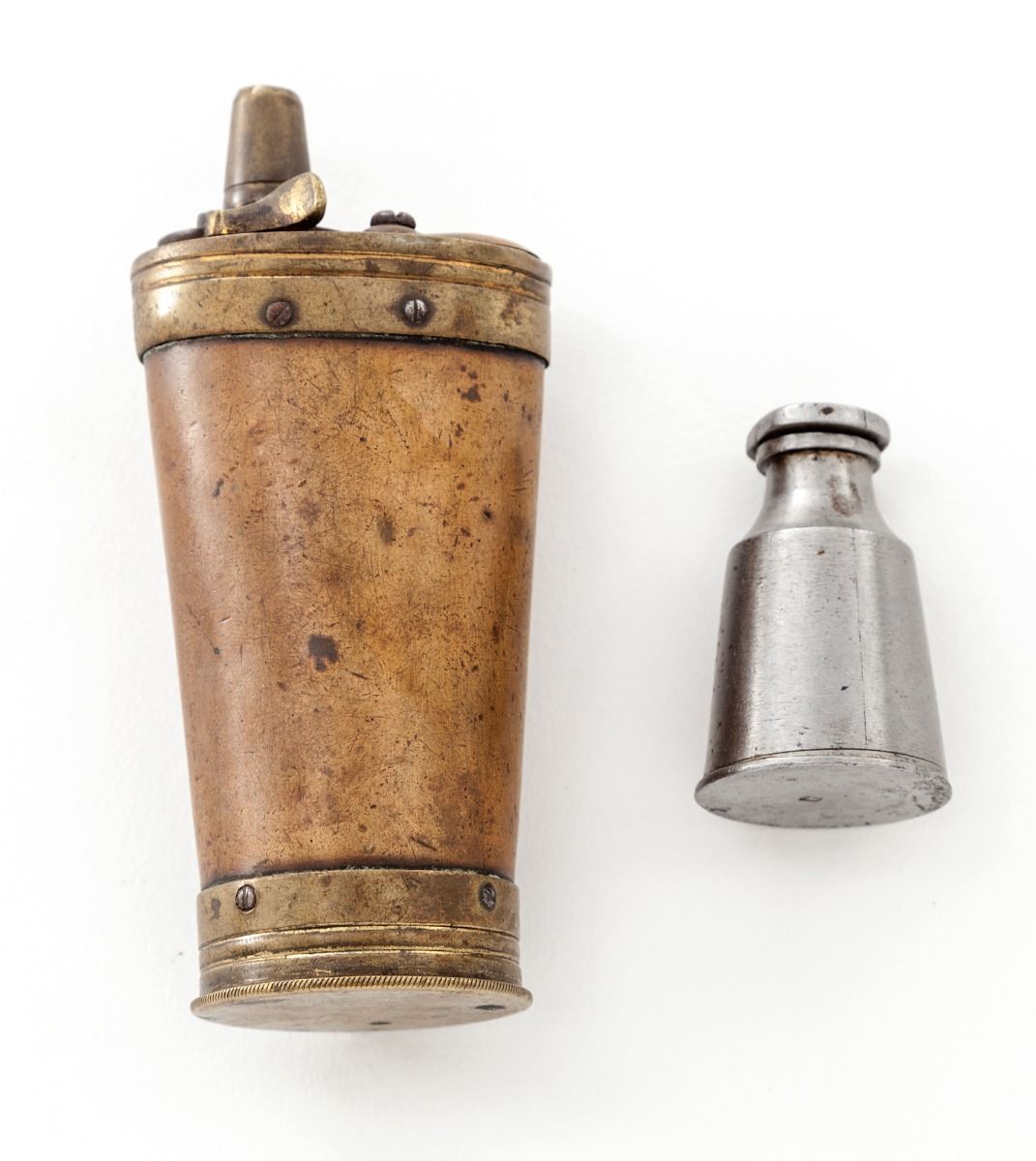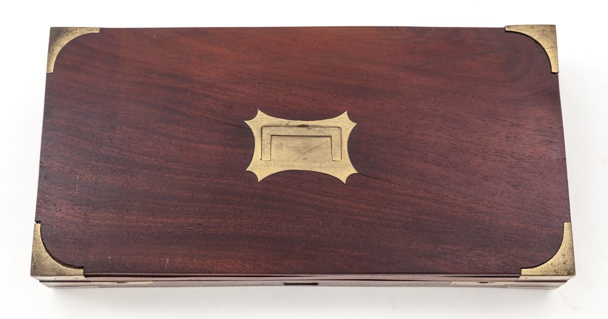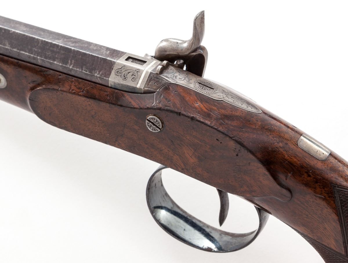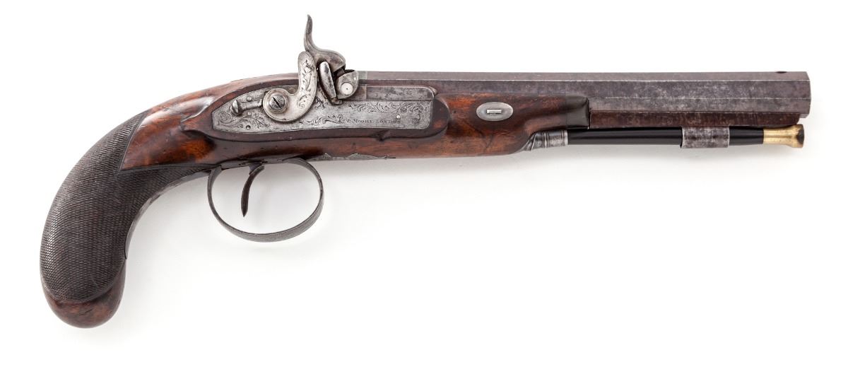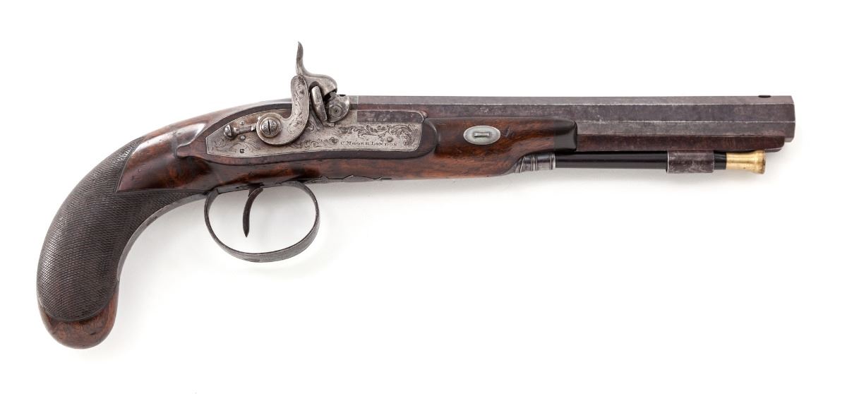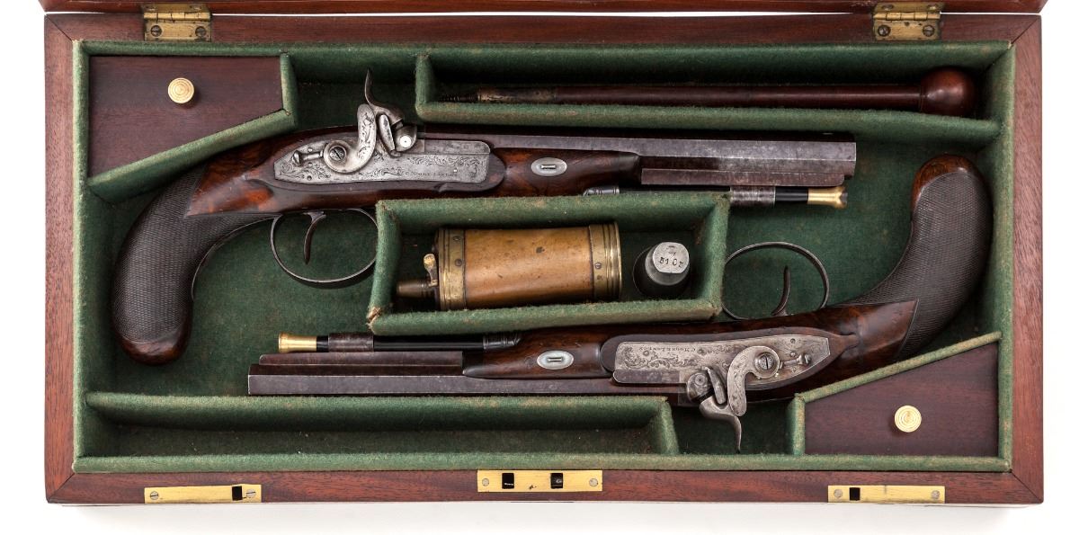 Fine Pair of Percussion Dueling Type Pistols, by Charles Moore, London, ca. 1830-1845, #988, .54 cal., 9'' platina banded octagonal barrels, inscribed ''77 St. James's Street / St. James's''; lockplates, hammers, upper tangs, and breech plugs show light vignette engraving, with clipped cornered square silver escutcheons at top of wrist areas. Lockplates additionally features hammer locks, and nipple bolsters with platina gas checks. Horn-tipped half-length checkered walnut bag-type stocks, with floral spay engraved blue triggerguards and pineapple finials; bottom of barrels beneath stocks marked ''C.M.-988'', and stock channels are marked ''IS''. In green baize-lined mahogany case with brass bands, corners, hardware, and flush-mounted handle; interior retailer's label marked ''Harvey & Son, Gunmakers, 68 South Street, Exeter''. Condition is near fine. Lightly swamped barrels have thinned and toned; addresses remain crisp. Bluing to triggerguards has thinned to approx. 75%. Stock with light general marks from handling, scuffs and scratches, with impressions and minor interruptions to check patterns. Actions are good, although one hammer stays back intermittently and probably needs a cleaning and re-oiling. Case remains in near excellent condition. Retailer label is in fact a known gunmaker and may be a later addition. Missing brass key and escutcheon. Partitions surrounding combination flask have come loose. Est.: $3,500-$5,000/pair. (Antique)