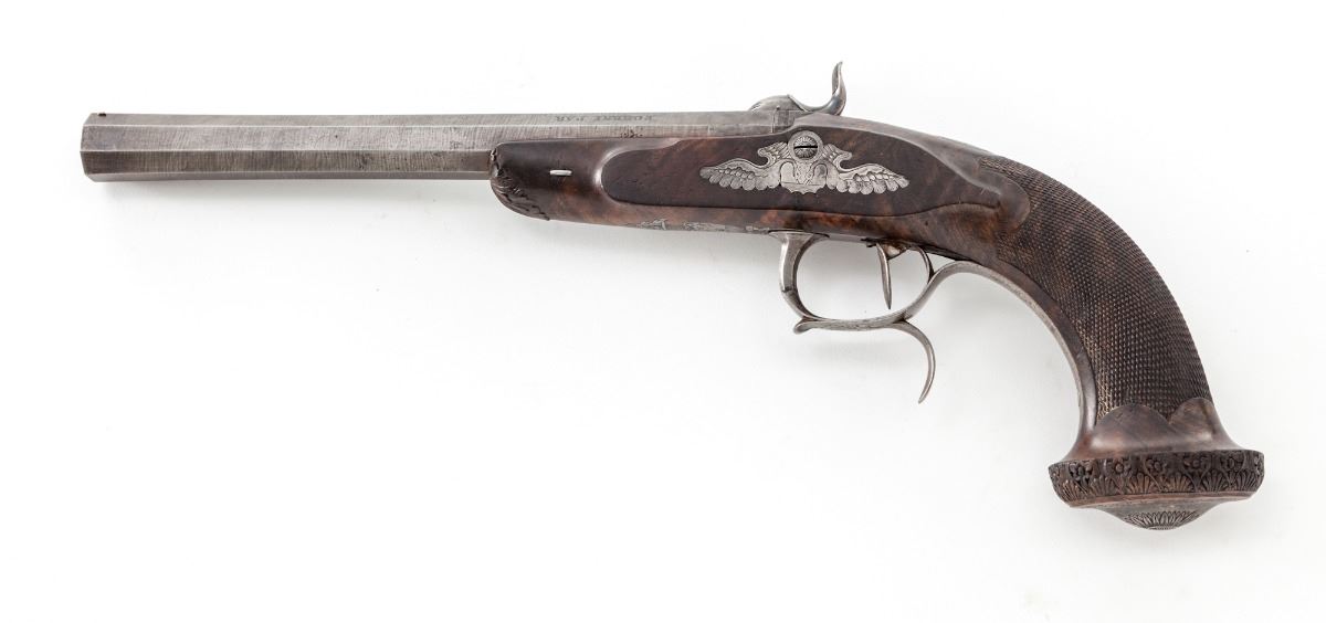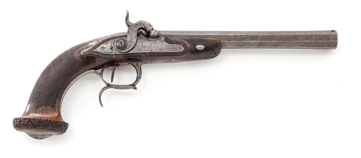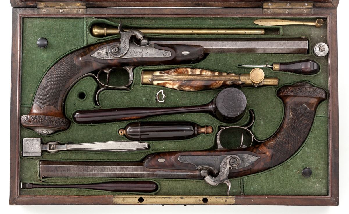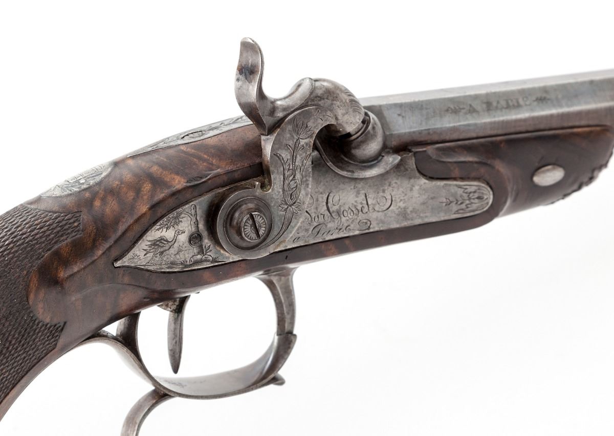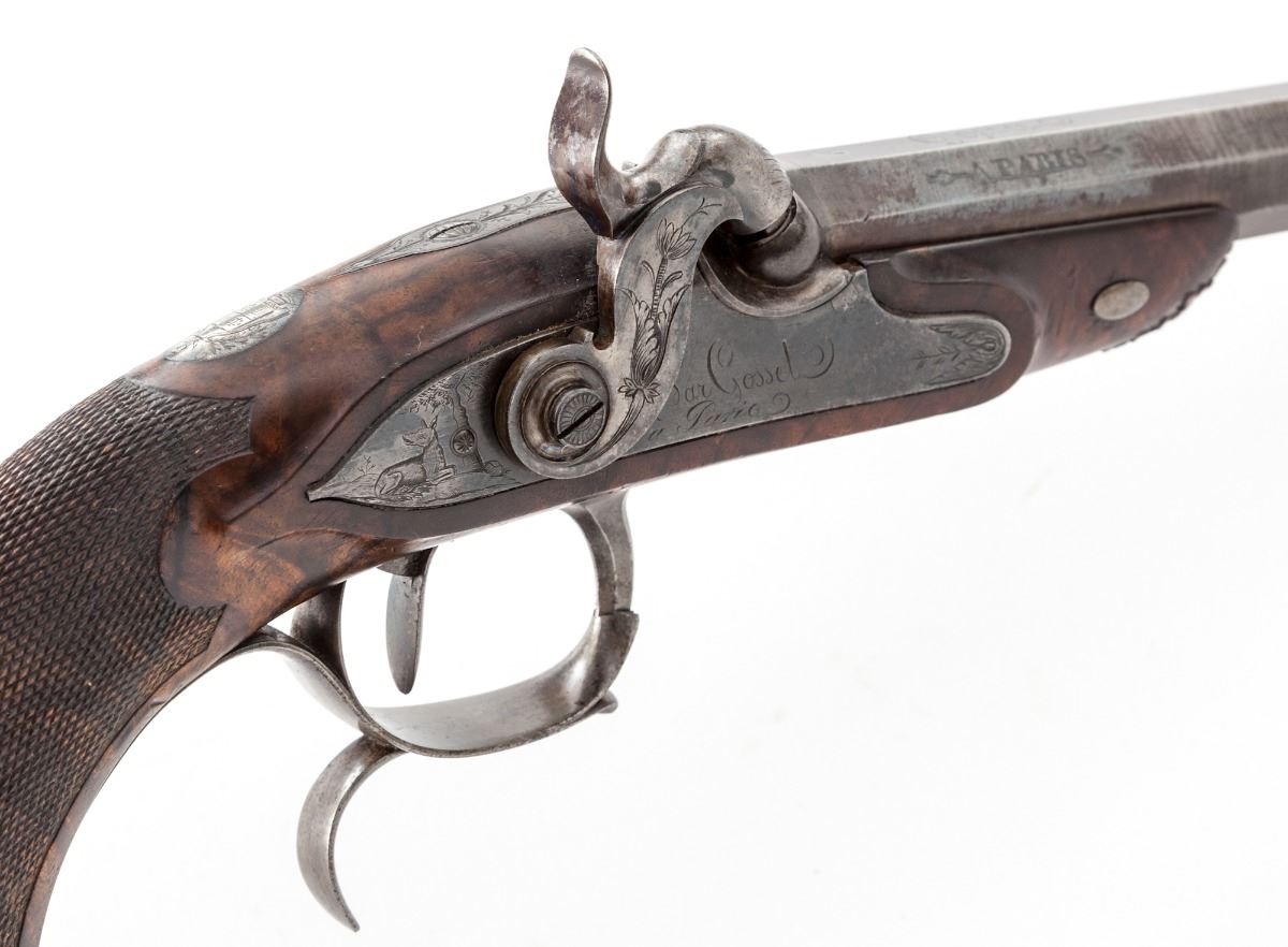 Cased Set of French Gosset Dueling Pistols, individually numbered 1 and 2, .54 cal., 8'' octagonal Fine Twist barrels marked ''Fourni Par / Gosset / A Paris'', case colored locks marked ''Fni Sar Gosset / a Paris'', with lightly decorated floral motif to hammers and lockplates, floral spays to fingerrest triggerguards. Barrel flats marked ''1'' and ''2'' respectively in applied gold; coat of arms escutcheons at top of wrist area are similarly numbered. Carved and checkered walnut halfstocks with floral motifs at exaggerated butt caps. Finely executed twin swans grace right sideplates. Case colored steel butt caps are decorated with fine border and circular fern leaf engraving. Green baize-lined French-fitted walnut case contains a fine horn powder measurer, combination turnscrew/pin punch, oiler, finely made articulated case colored bullet mold, large and small hammer. Dating from the 1820s-1840s. Condition is very good. Pistols show some thinning and toning to finish. Pistol #1 shows light fissure emanating from forward triggerguard post. Case colored components with some toning and graining. Stocks show little use. Actions are crisp, micro-groove bores are fine. Case accoutrements show light use; large hammer with moderate knackering to both faces. Interior of case with losses, separation to interior of lid, and some light mothing; exterior of case with scuffs and scratches to dark varnish, some separation to edges, and tape residue that should easily clean. Est.: $7,500-$10,000/set. (Antique)