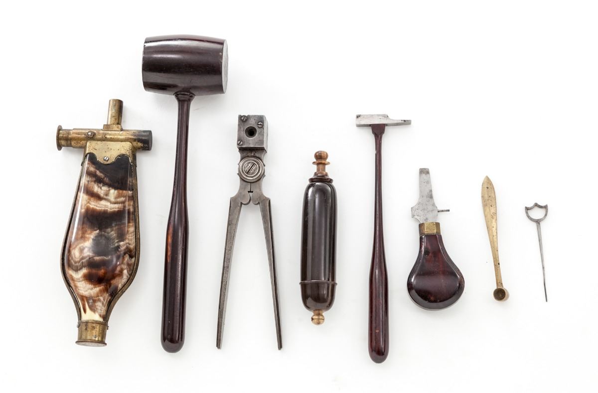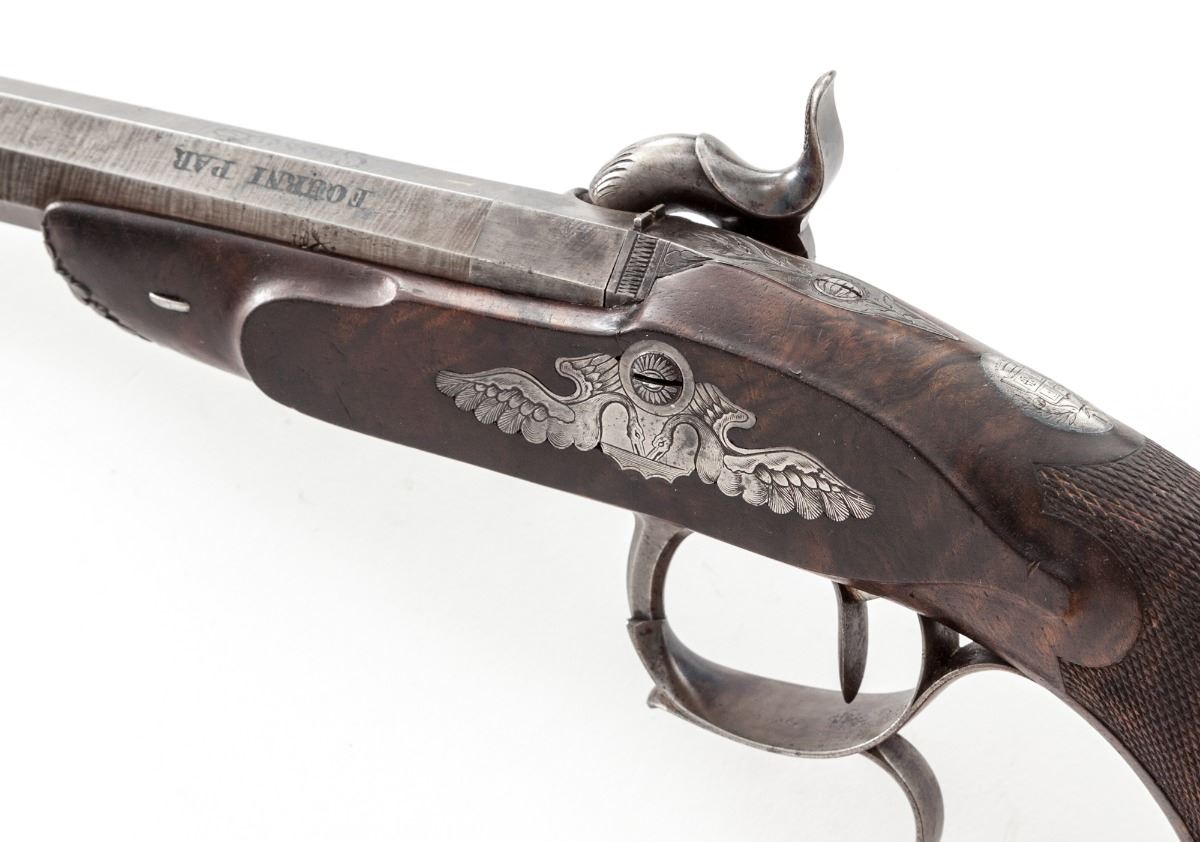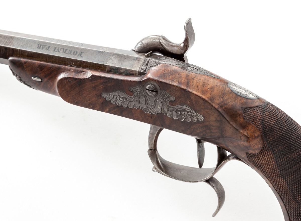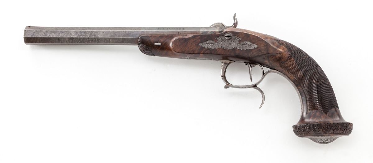 Cased Set of French Gosset Dueling Pistols, individually numbered 1 and 2, .54 cal., 8'' octagonal Fine Twist barrels marked ''Fourni Par / Gosset / A Paris'', case colored locks marked ''Fni Sar Gosset / a Paris'', with lightly decorated floral motif to hammers and lockplates, floral spays to fingerrest triggerguards. Barrel flats marked ''1'' and ''2'' respectively in applied gold; coat of arms escutcheons at top of wrist area are similarly numbered. Carved and checkered walnut halfstocks with floral motifs at exaggerated butt caps. Finely executed twin swans grace right sideplates. Case colored steel butt caps are decorated with fine border and circular fern leaf engraving. Green baize-lined French-fitted walnut case contains a fine horn powder measurer, combination turnscrew/pin punch, oiler, finely made articulated case colored bullet mold, large and small hammer. Dating from the 1820s-1840s. Condition is very good. Pistols show some thinning and toning to finish. Pistol #1 shows light fissure emanating from forward triggerguard post. Case colored components with some toning and graining. Stocks show little use. Actions are crisp, micro-groove bores are fine. Case accoutrements show light use; large hammer with moderate knackering to both faces. Interior of case with losses, separation to interior of lid, and some light mothing; exterior of case with scuffs and scratches to dark varnish, some separation to edges, and tape residue that should easily clean. Est.: $7,500-$10,000/set. (Antique)