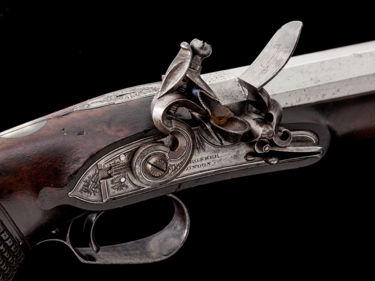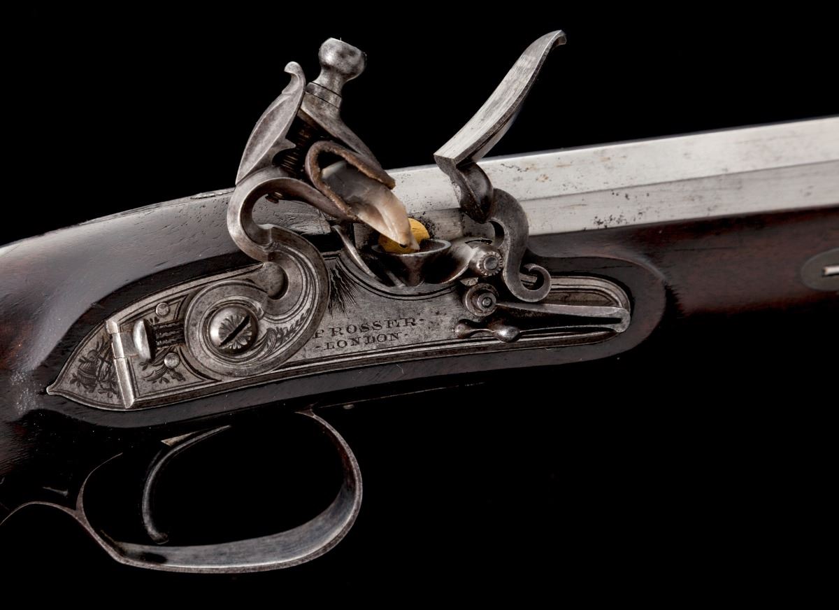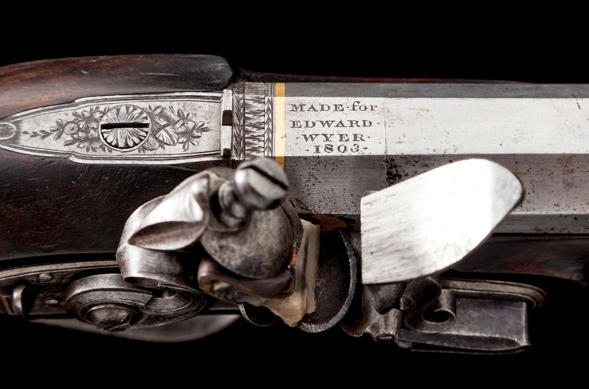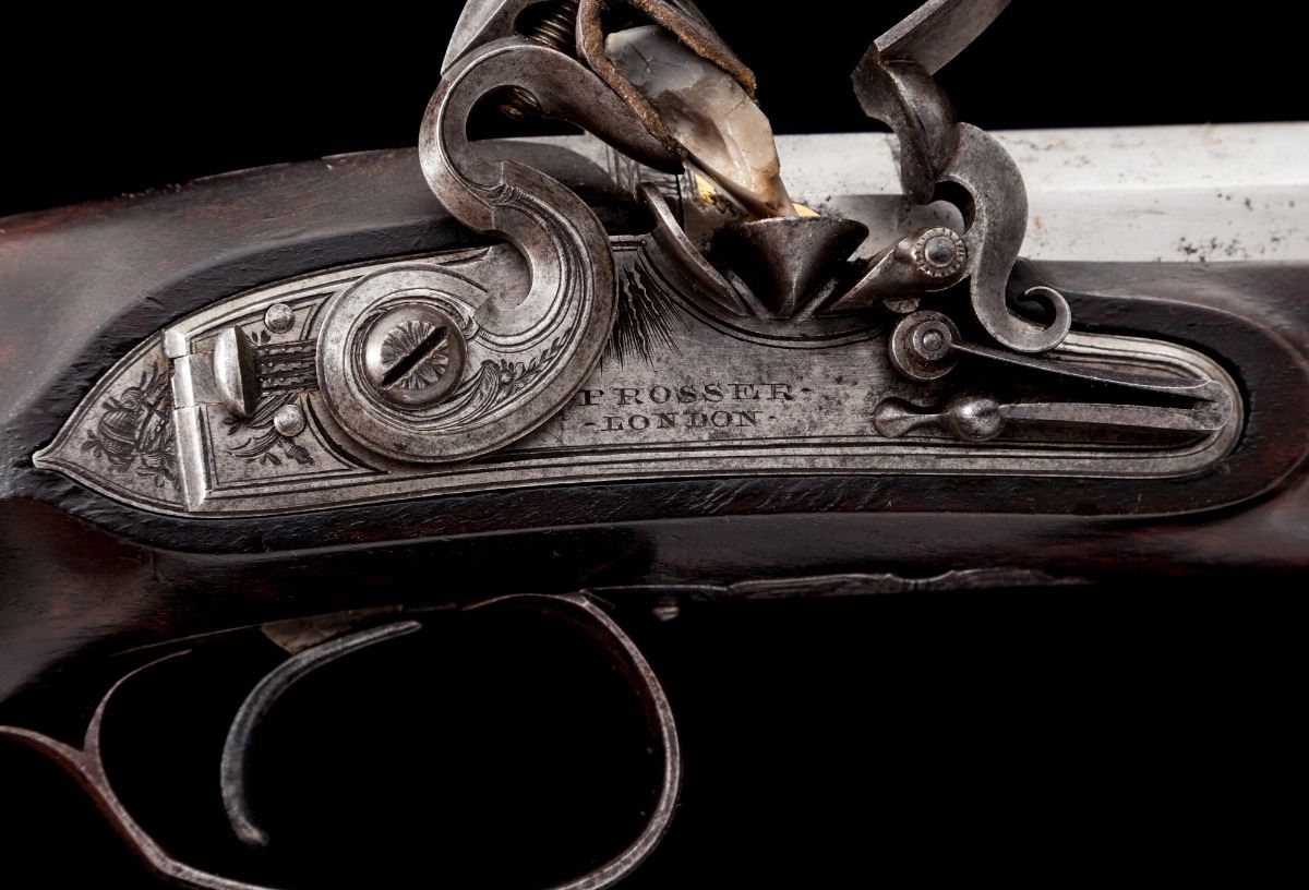 Exceptionally Fine Cased Pair of Early 19th Century Flintlock Dueling Pistols, by John Prosser, made for Edward Wyer (1803), .58 cal., 9-1/2'' bright octagonal barrels with gold bands, gold touch holes, and front sight blades; lightly engraved lockplates marked ''Prosser / London'' and are fitted with hammer safeties and frizzen roller springs; both hammers and frizzens with light border detail; breech plugs and upper tangs are finely engraved with reeding, Stand of Arms, and floral design, with top barrel flats just above touch holes marked ''Made for Edward Wyer 1803''. Fine half-length saw-handled walnut stocks with coarse style pineapple checkering; silver butt caps engraved ''Prosser's Improvement'' with decorative borders and central screw areas; blank silver ovoid escutcheons to top of saw handles. Fine English blue triggerguards engraved with nicely detailed Stand of Arms, reeded edges, with forward portions engraved in a pumpkin-shaped finial. Finely swept-back forend caps exhibit sunburst motifs, as well as vine style termination to rear points. Nicely cased in an early 19th Century furniture-grade mahogany case with black cotton velveteen lining, one oiler, 24 bore bullet mold, Dixon & Sons bag flask, cleaning rod, and two compartments containing both balls and flints. Condition is excellent to both pistols, with one pistol missing the actual safety tab to the hammer lock, bluing on triggerguards has thinned to approx. 50%, and ramrods being slightly different types, one with worm end. Bottom barrel flat at breech plug with ''(crown)/V'', ''(crown)/CP'', and the number ''82'' to both pistols. Stocks show minor impressions near wedge escutcheons and very light general marks from handling. Lockplate screws to left side of both pistols with mild corrosion from storage. Interior of case with light soiling and minor impressions, but no real losses to lining. Key is missing. Exterior of case with several well-accomplished repairs, probably done during the service life of these pistols, with recessed brass Regency style pull to lid. These particular pistols may have been made for Edward Wyer (1777-1839), who entered the U.S. Naval Academy in 1800 and resigned his commission in 1805. He served as U.S. Consulate to Riga, Lativa, Hamburg, Germany, and was the assistant doorkeeper of the U.S. Senate until his death. Prosser was active from about 1797-1860, having shops at several addresses throughout his career. His work is encountered with less frequency than the more well-known makers, such as Egg, Moore, and Nock, but when found, it is often of finer quality. Est.: $18,000-$24,000/pair. (Antique)