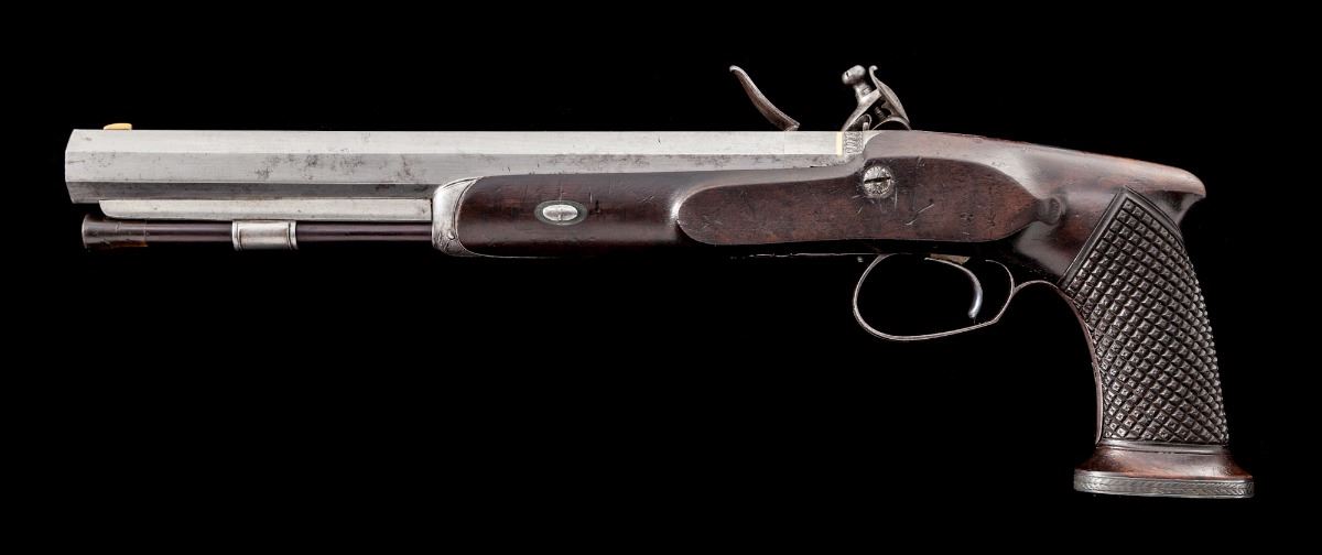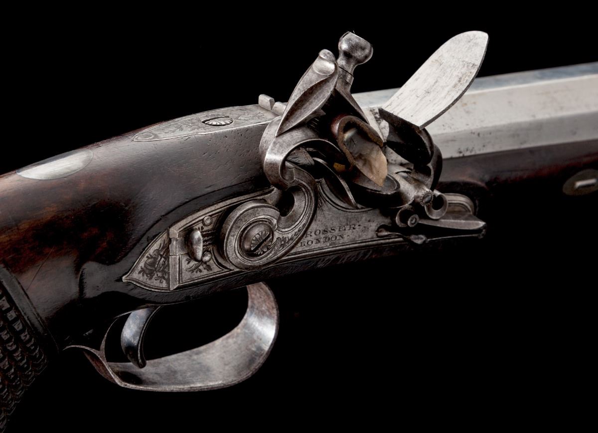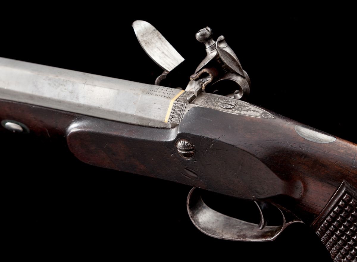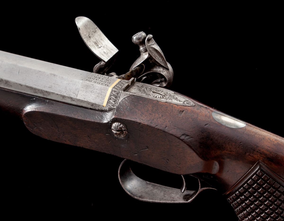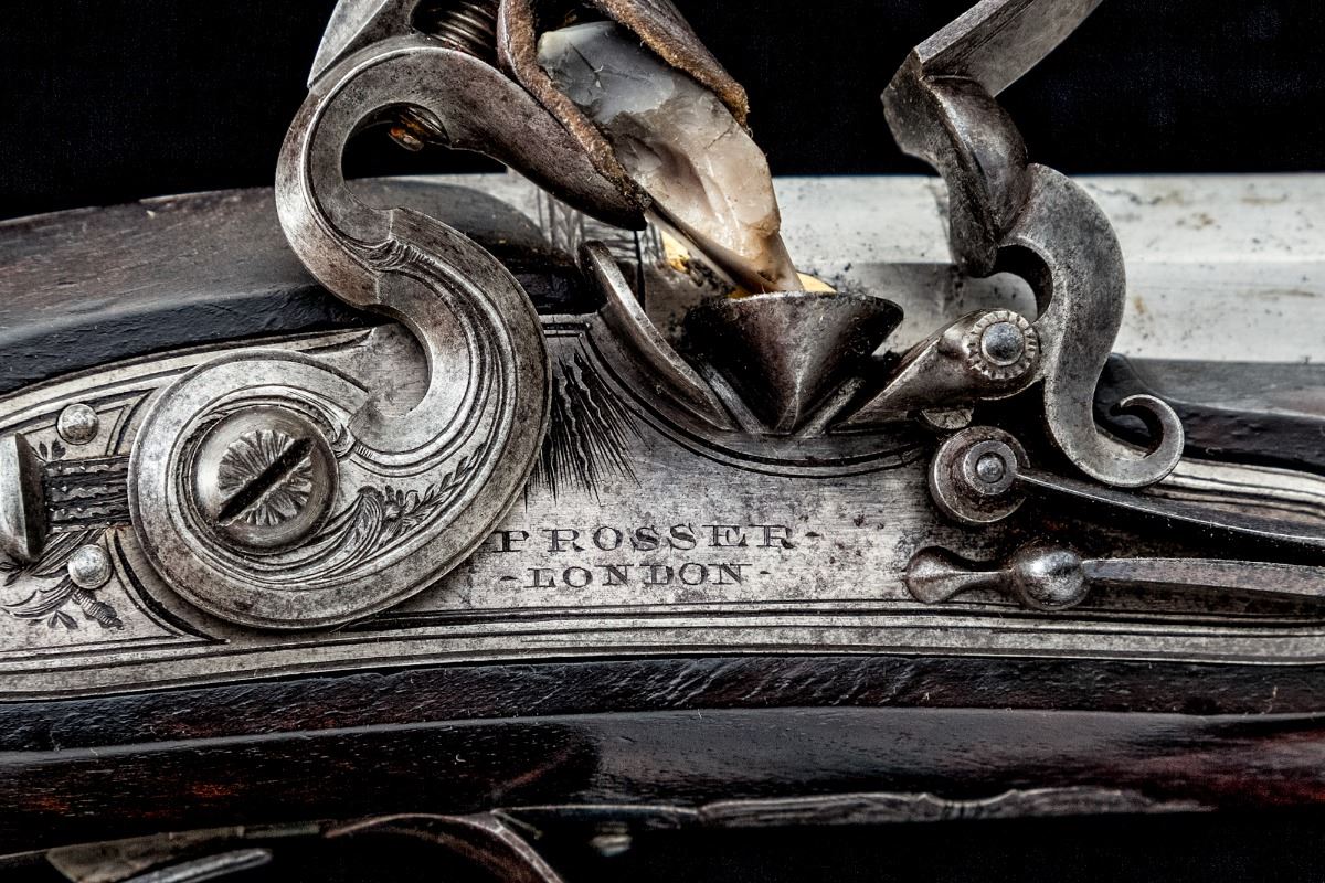 Exceptionally Fine Cased Pair of Early 19th Century Flintlock Dueling Pistols, by John Prosser, made for Edward Wyer (1803), .58 cal., 9-1/2'' bright octagonal barrels with gold bands, gold touch holes, and front sight blades; lightly engraved lockplates marked ''Prosser / London'' and are fitted with hammer safeties and frizzen roller springs; both hammers and frizzens with light border detail; breech plugs and upper tangs are finely engraved with reeding, Stand of Arms, and floral design, with top barrel flats just above touch holes marked ''Made for Edward Wyer 1803''. Fine half-length saw-handled walnut stocks with coarse style pineapple checkering; silver butt caps engraved ''Prosser's Improvement'' with decorative borders and central screw areas; blank silver ovoid escutcheons to top of saw handles. Fine English blue triggerguards engraved with nicely detailed Stand of Arms, reeded edges, with forward portions engraved in a pumpkin-shaped finial. Finely swept-back forend caps exhibit sunburst motifs, as well as vine style termination to rear points. Nicely cased in an early 19th Century furniture-grade mahogany case with black cotton velveteen lining, one oiler, 24 bore bullet mold, Dixon & Sons bag flask, cleaning rod, and two compartments containing both balls and flints. Condition is excellent to both pistols, with one pistol missing the actual safety tab to the hammer lock, bluing on triggerguards has thinned to approx. 50%, and ramrods being slightly different types, one with worm end. Bottom barrel flat at breech plug with ''(crown)/V'', ''(crown)/CP'', and the number ''82'' to both pistols. Stocks show minor impressions near wedge escutcheons and very light general marks from handling. Lockplate screws to left side of both pistols with mild corrosion from storage. Interior of case with light soiling and minor impressions, but no real losses to lining. Key is missing. Exterior of case with several well-accomplished repairs, probably done during the service life of these pistols, with recessed brass Regency style pull to lid. These particular pistols may have been made for Edward Wyer (1777-1839), who entered the U.S. Naval Academy in 1800 and resigned his commission in 1805. He served as U.S. Consulate to Riga, Lativa, Hamburg, Germany, and was the assistant doorkeeper of the U.S. Senate until his death. Prosser was active from about 1797-1860, having shops at several addresses throughout his career. His work is encountered with less frequency than the more well-known makers, such as Egg, Moore, and Nock, but when found, it is often of finer quality. Est.: $18,000-$24,000/pair. (Antique)