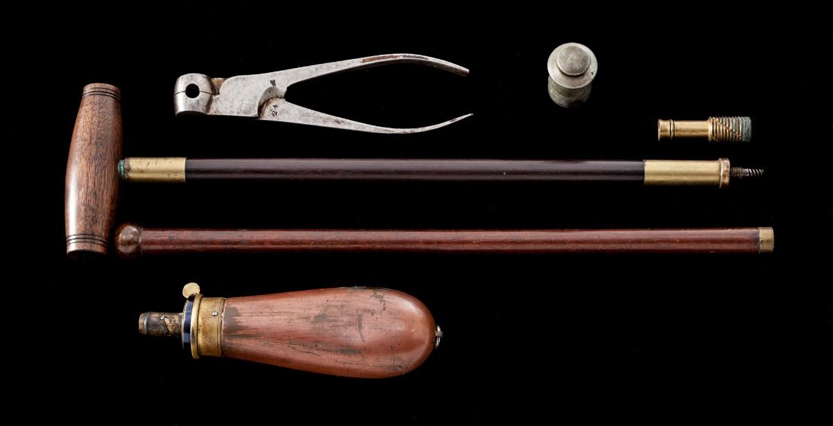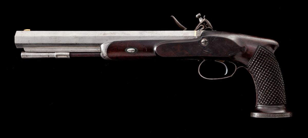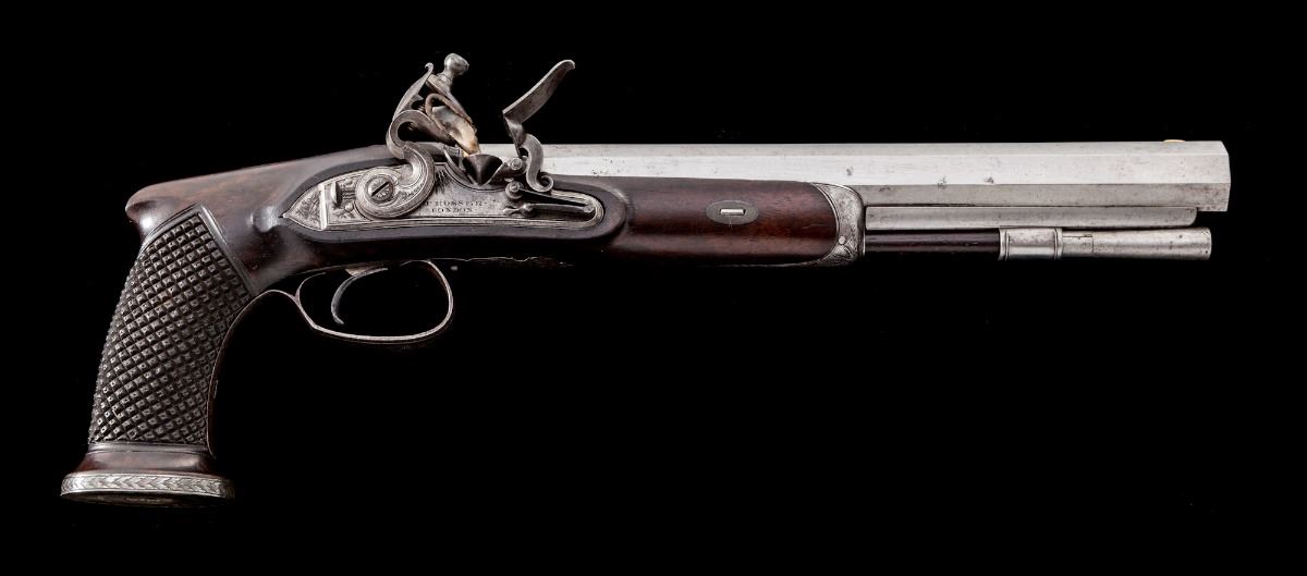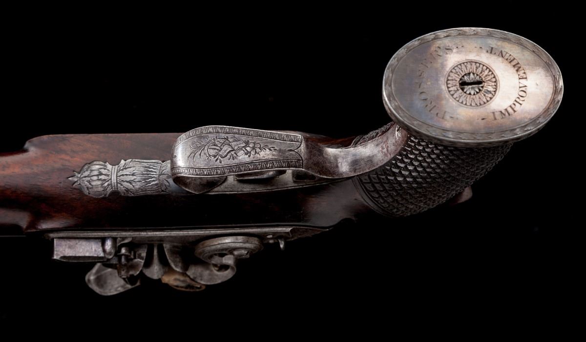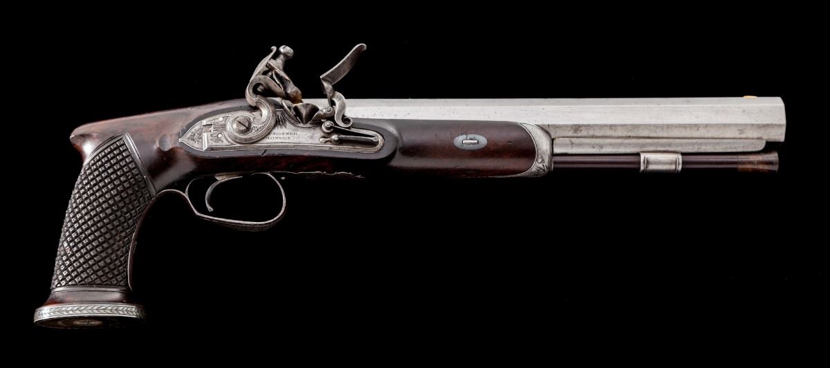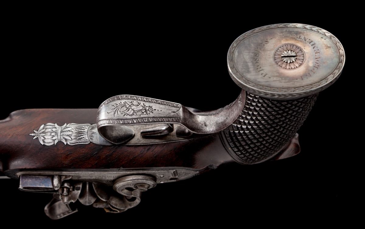 Exceptionally Fine Cased Pair of Early 19th Century Flintlock Dueling Pistols, by John Prosser, made for Edward Wyer (1803), .58 cal., 9-1/2'' bright octagonal barrels with gold bands, gold touch holes, and front sight blades; lightly engraved lockplates marked ''Prosser / London'' and are fitted with hammer safeties and frizzen roller springs; both hammers and frizzens with light border detail; breech plugs and upper tangs are finely engraved with reeding, Stand of Arms, and floral design, with top barrel flats just above touch holes marked ''Made for Edward Wyer 1803''. Fine half-length saw-handled walnut stocks with coarse style pineapple checkering; silver butt caps engraved ''Prosser's Improvement'' with decorative borders and central screw areas; blank silver ovoid escutcheons to top of saw handles. Fine English blue triggerguards engraved with nicely detailed Stand of Arms, reeded edges, with forward portions engraved in a pumpkin-shaped finial. Finely swept-back forend caps exhibit sunburst motifs, as well as vine style termination to rear points. Nicely cased in an early 19th Century furniture-grade mahogany case with black cotton velveteen lining, one oiler, 24 bore bullet mold, Dixon & Sons bag flask, cleaning rod, and two compartments containing both balls and flints. Condition is excellent to both pistols, with one pistol missing the actual safety tab to the hammer lock, bluing on triggerguards has thinned to approx. 50%, and ramrods being slightly different types, one with worm end. Bottom barrel flat at breech plug with ''(crown)/V'', ''(crown)/CP'', and the number ''82'' to both pistols. Stocks show minor impressions near wedge escutcheons and very light general marks from handling. Lockplate screws to left side of both pistols with mild corrosion from storage. Interior of case with light soiling and minor impressions, but no real losses to lining. Key is missing. Exterior of case with several well-accomplished repairs, probably done during the service life of these pistols, with recessed brass Regency style pull to lid. These particular pistols may have been made for Edward Wyer (1777-1839), who entered the U.S. Naval Academy in 1800 and resigned his commission in 1805. He served as U.S. Consulate to Riga, Lativa, Hamburg, Germany, and was the assistant doorkeeper of the U.S. Senate until his death. Prosser was active from about 1797-1860, having shops at several addresses throughout his career. His work is encountered with less frequency than the more well-known makers, such as Egg, Moore, and Nock, but when found, it is often of finer quality. Est.: $18,000-$24,000/pair. (Antique)