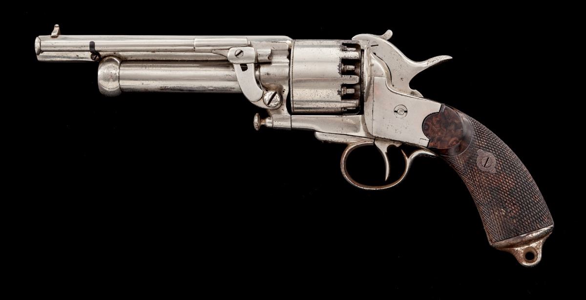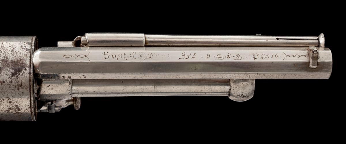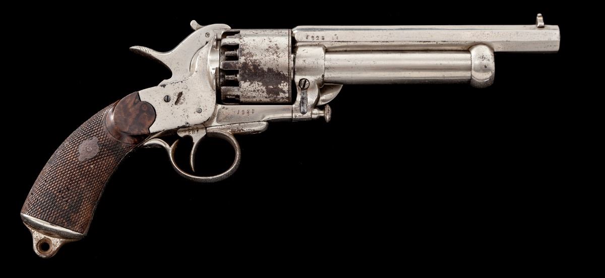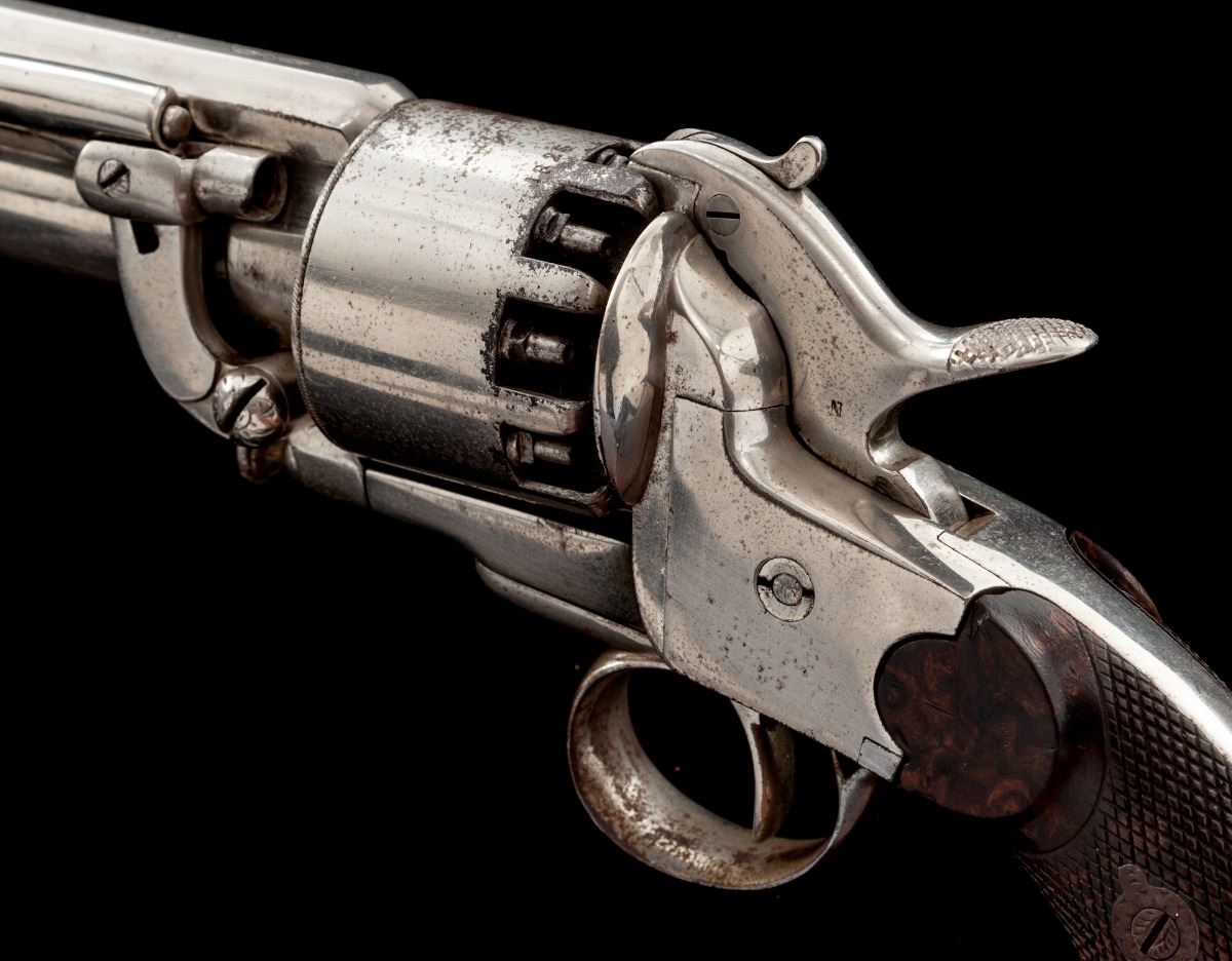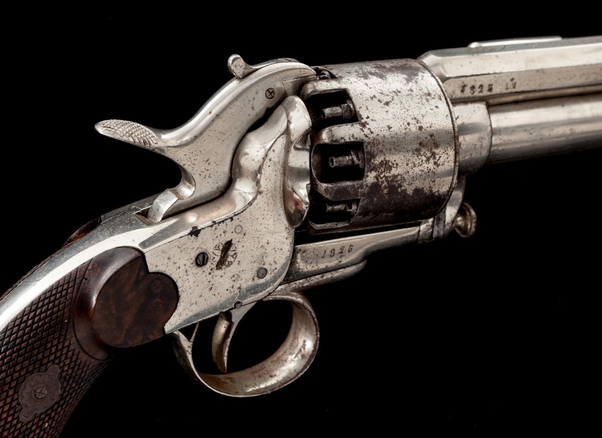 French LeMat Single Action Combination Percussion Revolver, #1825, .42 cal. 9-shot cylinder with centrally positioned 20 ga. smoothbore barrel, 6-1/2'' pistol barrel, 5'' shotgun barrel, nickel finish, checkered burl walnut grips. Top of barrel marked ''Syst. LeMat Bre C.F.G.S.'' (Charles Frederic Girard & Son of Paris). Condition is near excellent retaining approx. 85% of an old nickel finish with almost all the losses to cylinder. Grips are excellent with beautiful burl pattern. Good functioning action, working hammer switch, very good bores. Est.: $10,000-$15,000. (Antique)