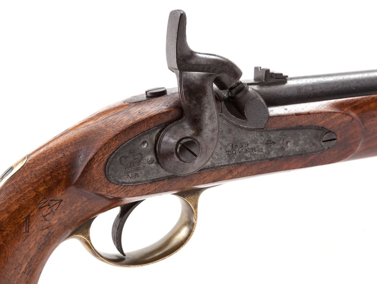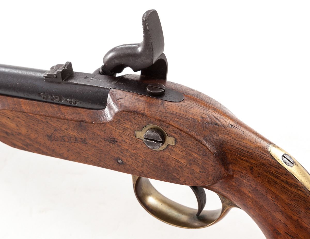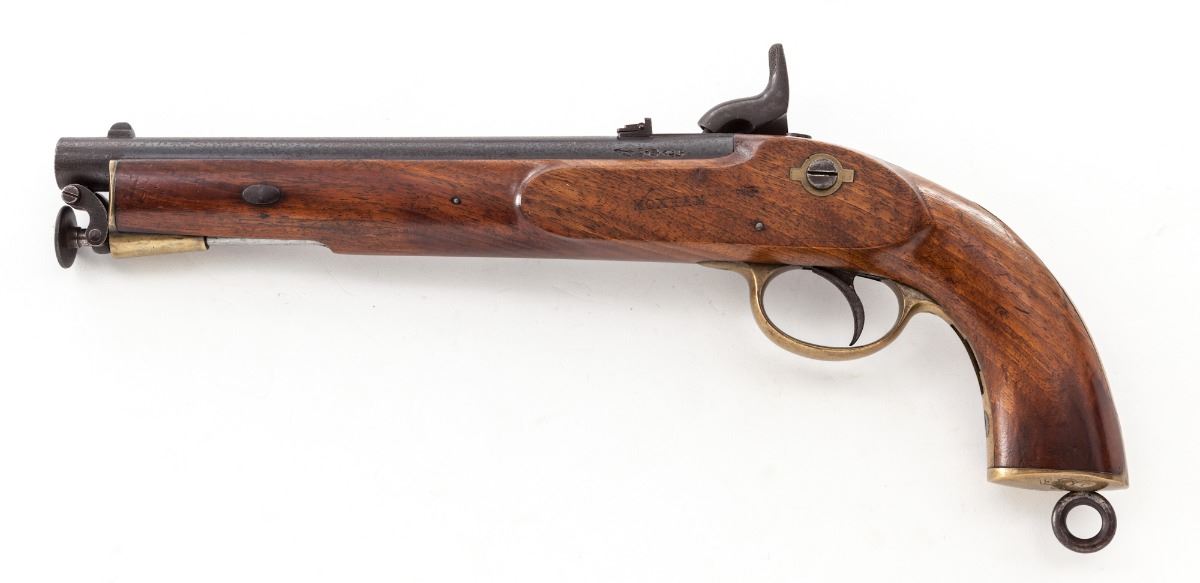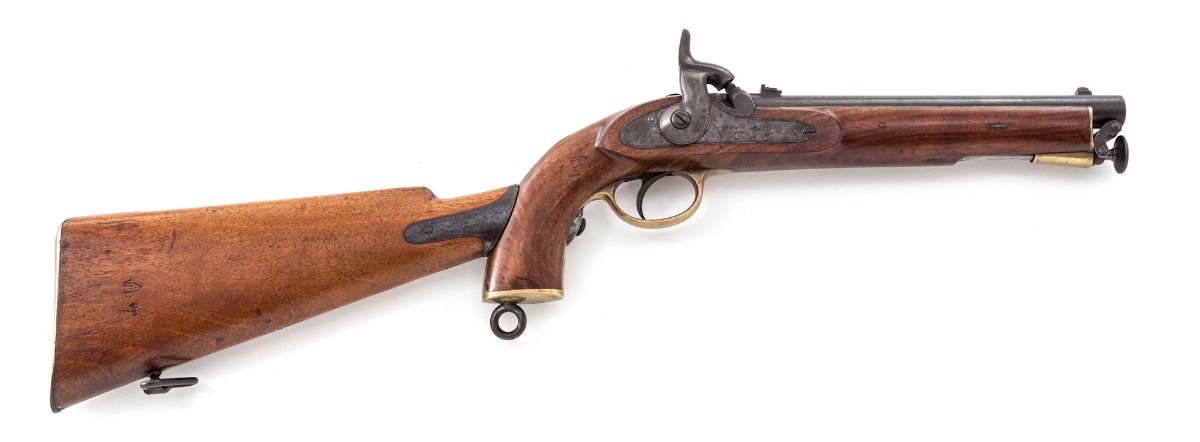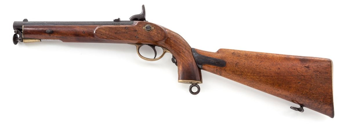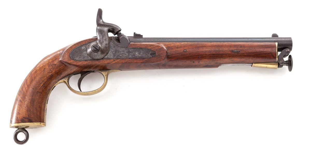 Stocked British Military Model 1856 Percussion Pistol, by Tower (1859), NVSN, .56 cal., 10'' blue barrel, case hardened frame and hammer, ''(crown)/VR'' and ''1859/Tower'' to lockplate, 3-leaf rear sight, cartouched walnut full-length stock and detachable shoulder stock, with iron mount. Stock is extensively cartouched with London proofmarks ''(broad arrow)/WD'' markings; right side of stock marked ''Moxham''. Captive swivel type ramrod, brass triggerguard, forend cap and butt cap, as well as brass buttplate and tang unit marked ''ELYC 2nd / T-14'' (East Lothian Yeomanry Cavalry Regiment), which was part of the British Territorial Army active between 1797-1956, and similarly marked on butt of pistol grip. Condition is fine with light surface corrosion to blue portion of barrel, much of which should clean. Light marks to stock from handling, but crisp markings throughout. Action and bore are good. Est.: $2,500-$3,500. (Antique)