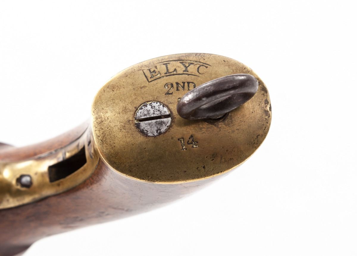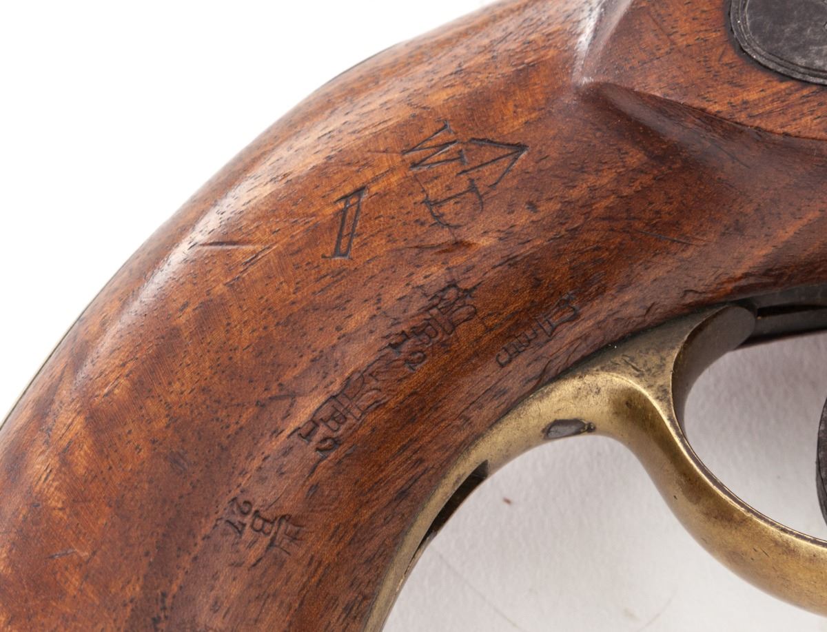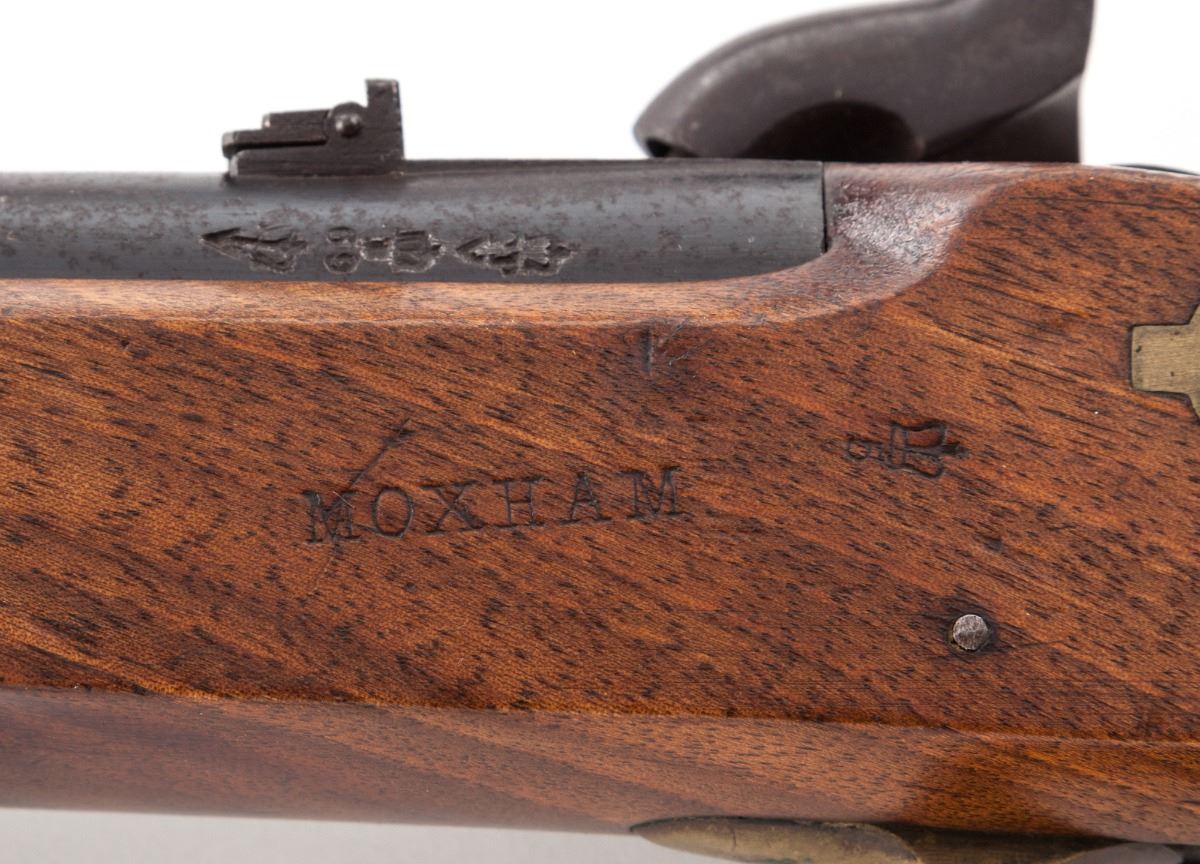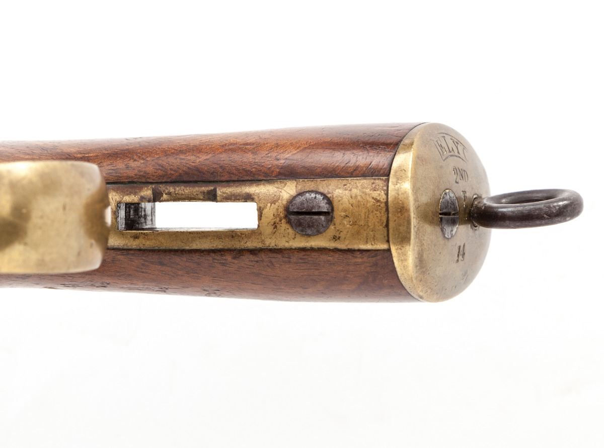 Stocked British Military Model 1856 Percussion Pistol, by Tower (1859), NVSN, .56 cal., 10'' blue barrel, case hardened frame and hammer, ''(crown)/VR'' and ''1859/Tower'' to lockplate, 3-leaf rear sight, cartouched walnut full-length stock and detachable shoulder stock, with iron mount. Stock is extensively cartouched with London proofmarks ''(broad arrow)/WD'' markings; right side of stock marked ''Moxham''. Captive swivel type ramrod, brass triggerguard, forend cap and butt cap, as well as brass buttplate and tang unit marked ''ELYC 2nd / T-14'' (East Lothian Yeomanry Cavalry Regiment), which was part of the British Territorial Army active between 1797-1956, and similarly marked on butt of pistol grip. Condition is fine with light surface corrosion to blue portion of barrel, much of which should clean. Light marks to stock from handling, but crisp markings throughout. Action and bore are good. Est.: $2,500-$3,500. (Antique)