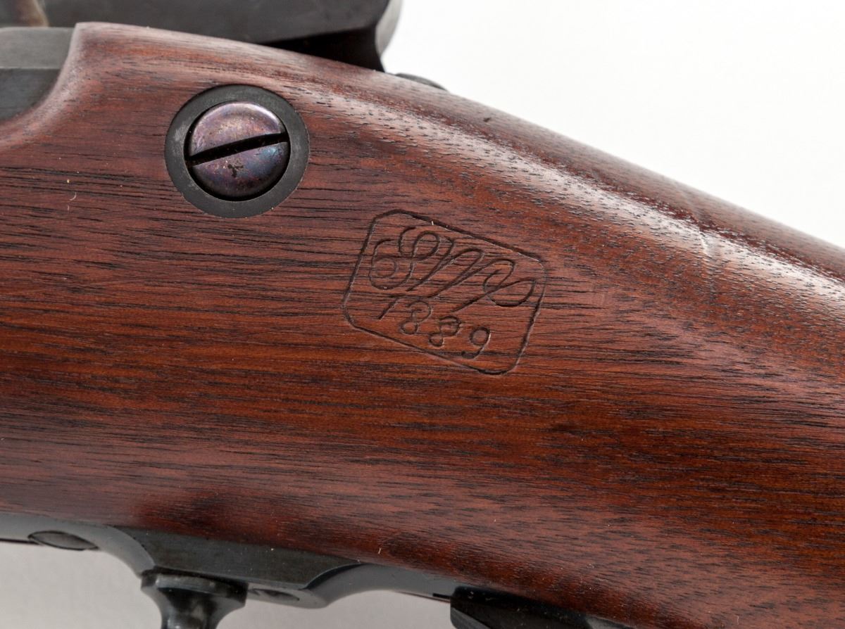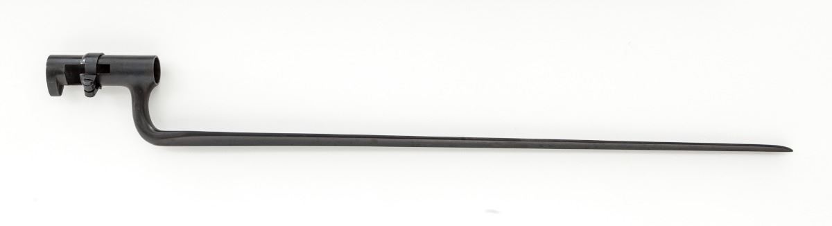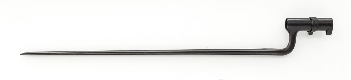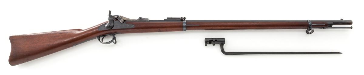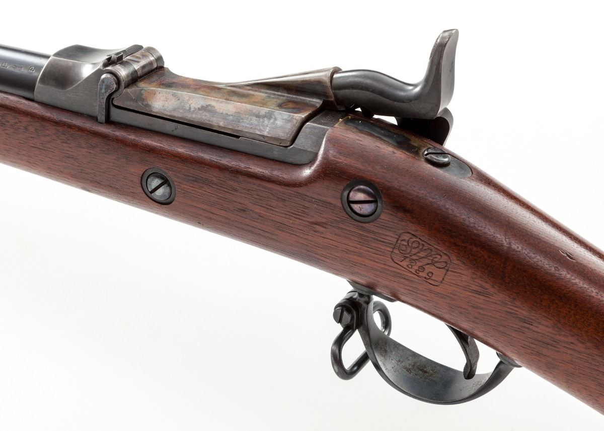 Model 1884 Trapdoor Rifle, by Springfield, #453632, .45-70 cal., 32-1/2'' barrel, blue and case hardened finish, 1889 cartouched walnut stock, with correct U.S. marked socket bayonet. Condition is excellent showing very minor impressions to stock from handling, retaining approx. 98%+ original factory blue finish. Action is good, bore is mirror bright. Est.: $1,200-$1,800. (Antique)