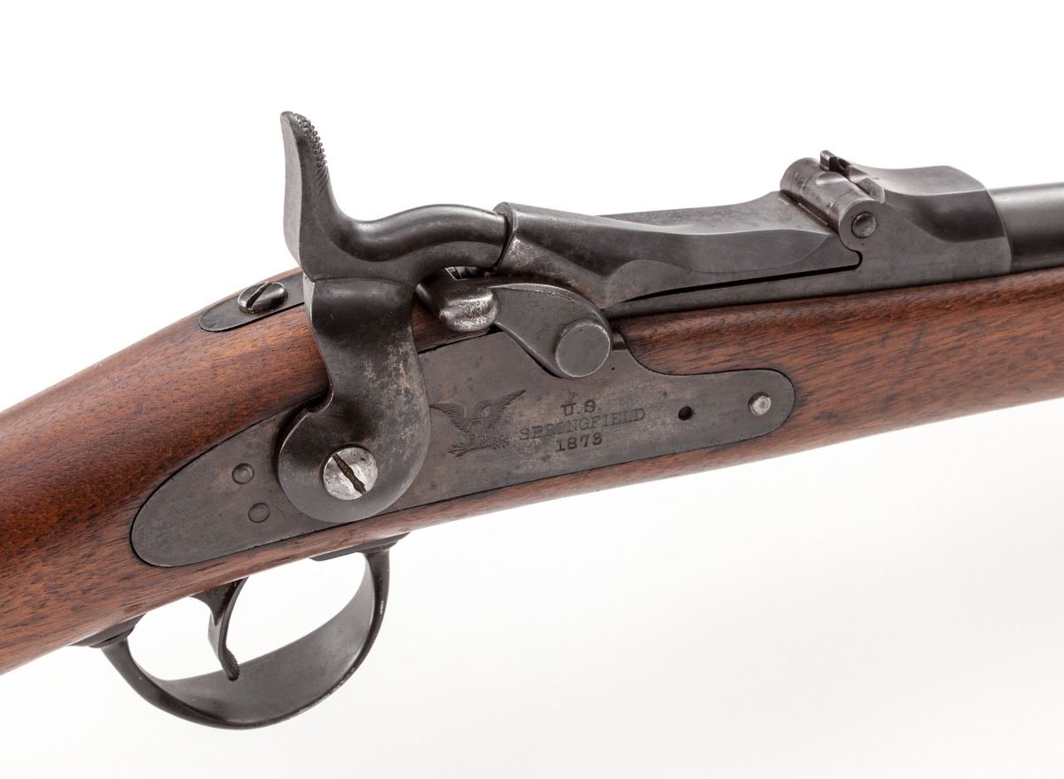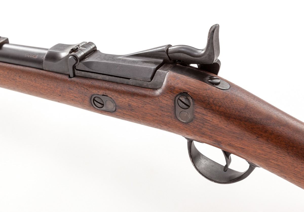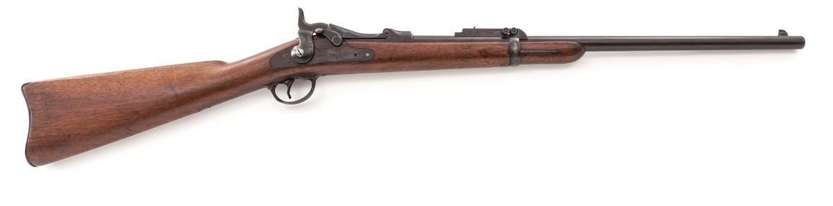 Springfield Trapdoor Model 1890 Carbine, #189166*, .45-70 cal., 22'' barrel, arsenal blue finish, walnut stock, with cleaning rod in butt. This carbine features the front barrel band hump to protect the front sight when inserted into the carbine boot. Saddlering bar has been neatly removed. This particular carbine began life as a Model 1879 variant with 1873 dated breechblock and lockplate. Condition is excellent as arsenal modified, retaining approx. 98% arsenal charcoal blue. Uncartouched stock with two light fissure emanating from left side ring bar hardware. Action is good, bore is fine. Est.: $1,800-$2,400. (Antique)