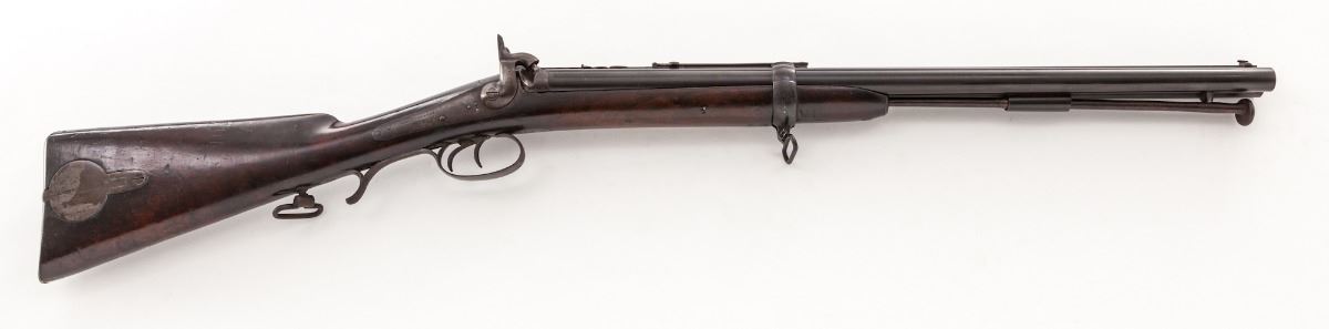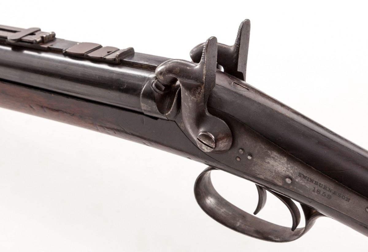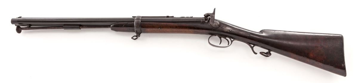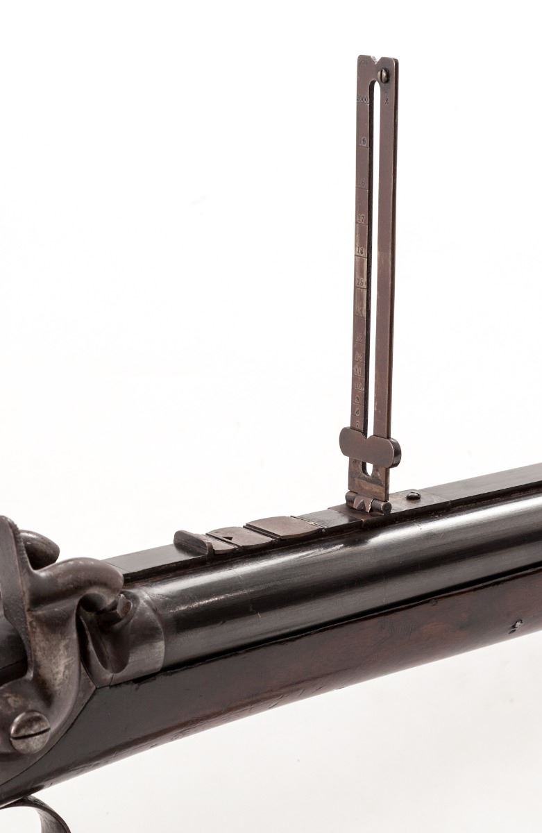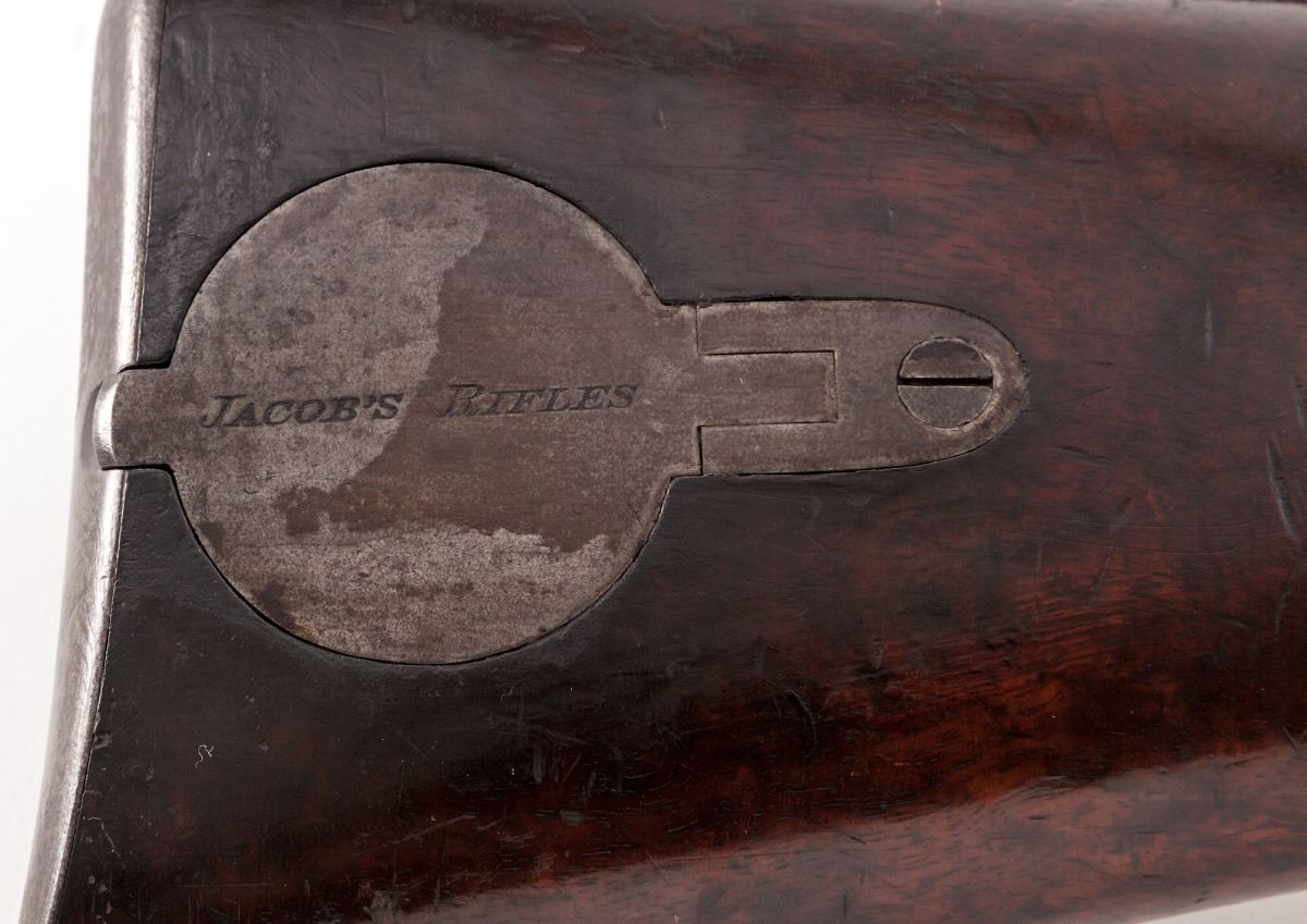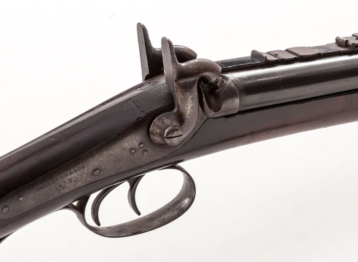 Rare Jacob's Military Side-by-Side Percussion Double Rifle, by Swinburn & Sons, #246, 32 ga., 24'' blue finish steel barrels with .585'' bores and wide 4-groove rifling, rear sights are in-line mounted along a 5/8'' full length flat rib and are a combination of two folding 100 and 200 yard V-notch leafs with a third blank 300 yard leaf and a folding ladder in increments of 300 to 2000 yards; front sight is a dovetailed blade with a large top bead; barrels have commercial and military Birmingham proofs on the lower chambers with serial numbers on both hooks; inspection marks are also visible on the breech plugs, ladder sight and barrel band; a large single pipe on bottom rib retains a tight friction fit 23'' steel and brass ramrod with a raised brass neck flange; back-action locks are case colored and feature the maker's name over an ''1859'' date. The half stock is dense walnut with a straight grip and heavy gloss varnish and is attached to the barrels with a single barrel band incorporating a 1-3/8'' sling swivel; reinforced triggerguard has a checkered recoil extension just ahead of the rear sling swivel; a deep circular patchbox is inset in the right side of the stock with ''Jacob's Rifles'' engraved in the lid. Length of pull is 14-1/4'' to a contoured steel buttplate; weight is 10-1/4 lbs. Designed by Brigadier Gen. John Jacob for use in India, the rifle fired an explosive conical round with four raised lands that engaged the deep rifling grooves. The theory being that a well-placed shot into enemy positions would ignite black powder or other combustible materials. In actual practice, the rifle suffered from heavy recoil and rapidly decreasing functionality as each successive shot was fired and burned powder and grease fouled the bores. Production ceased after approx. 1,000 units with minor variations encountered. Condition of this early Jacob's rifle remains good with strong mainsprings and functional triggers. Action, patchbox, barrel band and sights are drifting to an oxidized brown patina with areas of accumulated surface corrosion. Barrel blue is 70% and thinning with oxidation along the top rib seams. Bores are oxidized brown, muzzles are pitted with a mottled brown patina, breech plugs have verdigris and pitting. Stock is generally dented and scratched; the re-varnish is darkening to black along the wrist and forend tip. Est.: $3,000-$5,000. (Antique)