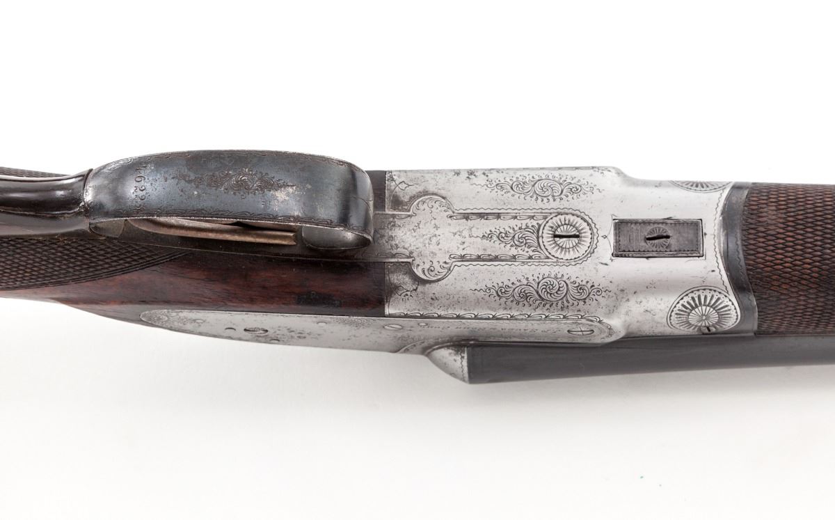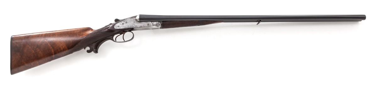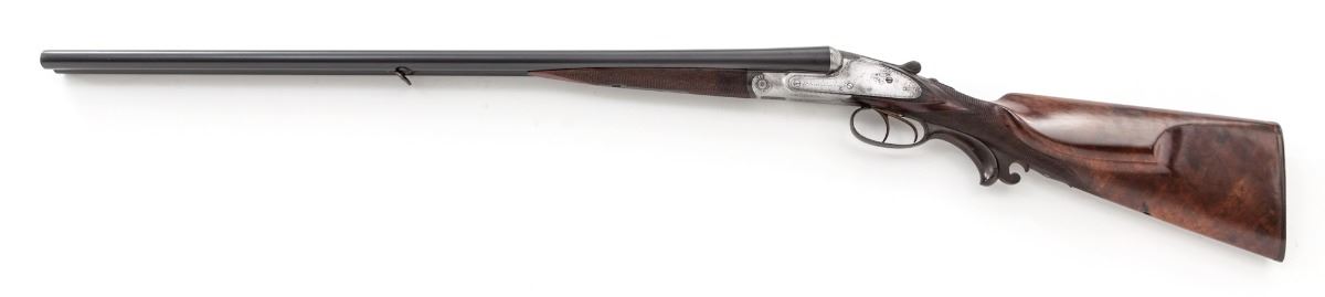 J. P. Sauer & Sohn, Suhl, Side-by-Side Sidelock Shotgun, #46223, 16 ga., 2-9/16'' chs., 29'' blue finish barrels with 7/16'' concave matted rib and front white bead, IC. chokes, 7/8'' sling swivel, third fastener and extractor; proofmarks are pre-1891. Case-colored frame has light scroll engraved borders with double triggers, cocking indicators, manual top tang safety and horn triggerguard extension. Checkered straight-grip stock and splinter forend are lightly figured French walnut with a semi-gloss varnish; stock has a saddle cheekpiece and a length of pull of 13-7/8'' over a checkered horn buttplate; weight is 6-3/4 lbs. Condition is fair to good showing light use. Frame has 10% remaining case-colors with scattered oxidation and pitting under a polished in-the-white finish; lockplates are slightly wavy with pry marks. Barrels are refinished over earlier pitting that is partially filled in the top rib; forend iron and triggerguard have light rust; screw slots are marred. There is a small split on the triggerguard extension and the rear sling swivel is missing. Action is tight, bores shows patchy oxidation and pitting on the muzzles. Est.: $1,000-$1,500. (Antique)