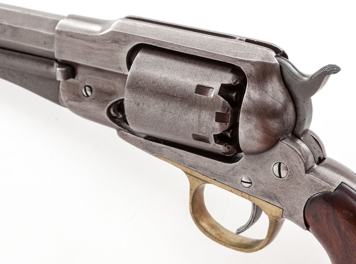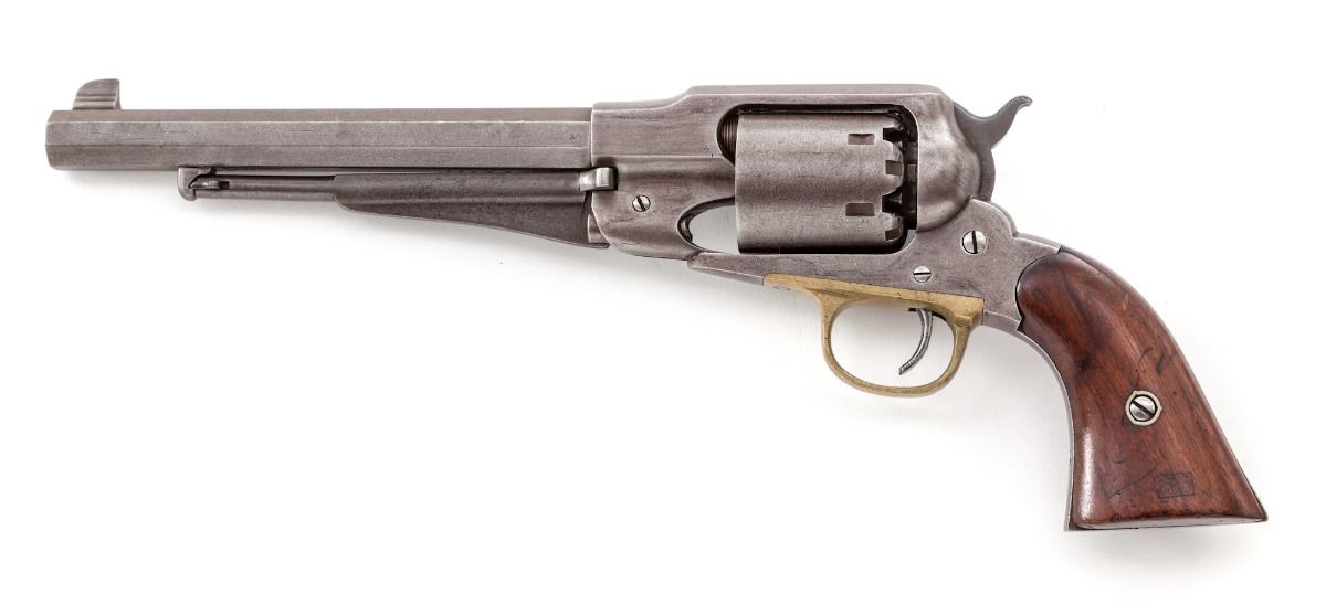 Martial Model 1858 Remington New Model Army Percussion Revolver, #95942, .44 ball, 8'' barrel, originally blue finished, cartouched walnut grips, with ''A'' inspector markings to barrel and frame. Condition is good to very good showing little original finish. Grips with moderate general smoothing and clear cartouche. Action is good but bolt stop spring is weak, replaced front sight, bore is fine and shows bright. Est.: $600-$800. (Antique)