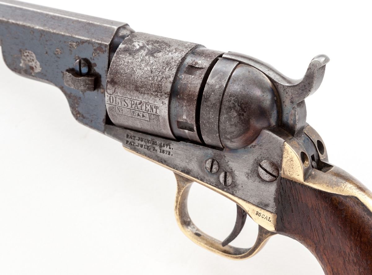 Colt 3rd Type New Model Pocket Breechloading Revolver, #544, .32 RF cal., 4-1/2'' octagonal barrel, blue and case hardened finish, silver-plated brass backstrap and triggerguard, with one-piece walnut grips. Condition is very good to near fine. Barrel assembly retains approx. 80% thinning original blue; cylinder shows 20% in protected areas with approx. 1/3 of cylinder scene with mild to just moderate corrosion; case hardened frame and hammer with about 35% mostly in the protected areas near loading gate. Brass straps show traces of silver. Grips retain approx. 30% original varnish. Good functioning action and fine bore. All visible matching numbers; wedge is unmarked. Est.: $450-$650. (Antique)