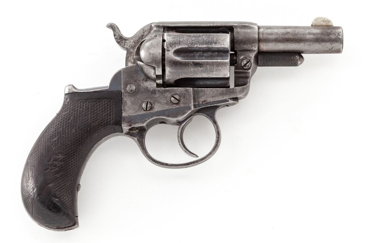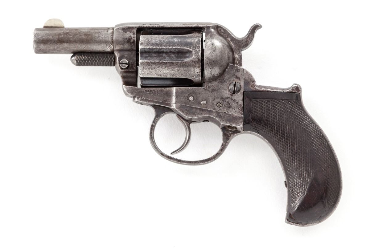 Early Colt Lightning Storekeeper's Model Double Action Revolver, #26323, .38 Colt cal., 2-1/2'' ejectorless barrel, originally blue and case hardened finish, one-piece checkered rosewood grips, with nickel silver front sight. Mfg'd 1880. Condition is about very good with traces of blue in protected areas. Etched panel faintly visible. Grips with moderate flattening, which is more pronounced to right side. Action and bore are good. Est.: $750-$1,000. (Antique)