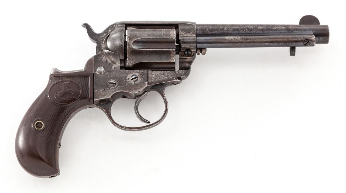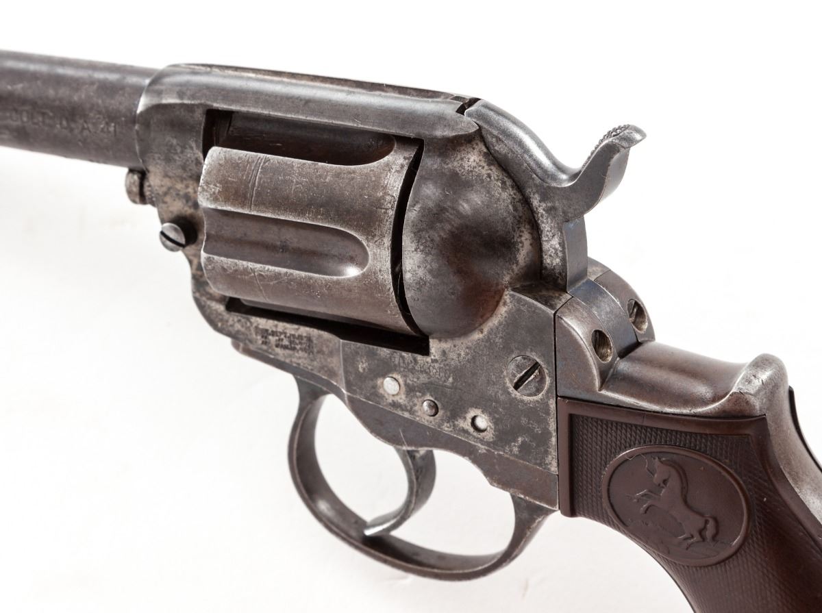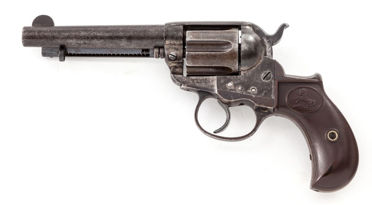 Antique Colt Thunderer Double Action Revolver, with Pinkerton Agency markings, #75389, .41 Colt cal., 4-1/2'' barrel, blue and case hardened finish, factory checkered hard rubber grips. Shipped to E.C. Meacham Arms Co., St. Louis, MO, on April 29, 1890, with factory letter confirming all features. Left side of frame neatly stamped ''Pinkerton Agency - 389''; right side marked ''John P. McPharland / Denver''. It is interesting to note that one of the most famous of all Pinkerton agents was James McPharland, who was also active in Denver during the 1890s. Condition is about very good retaining approx. 70%-75% thinning and toning blue. Ejector rod tab may be a later replacement. Grips are mostly smooth. Action and bore are good. Est.: $750-$1,000. (Antique)