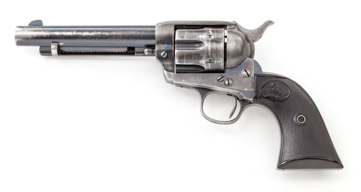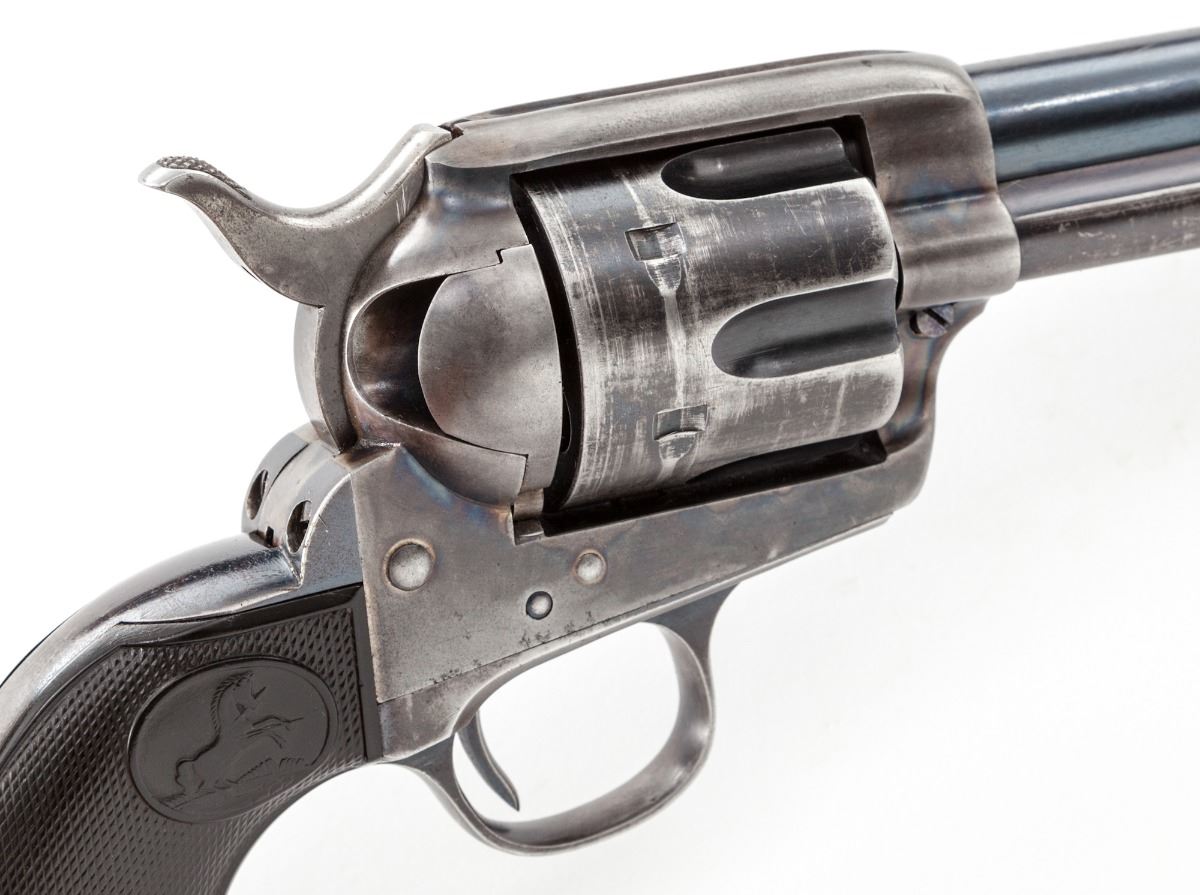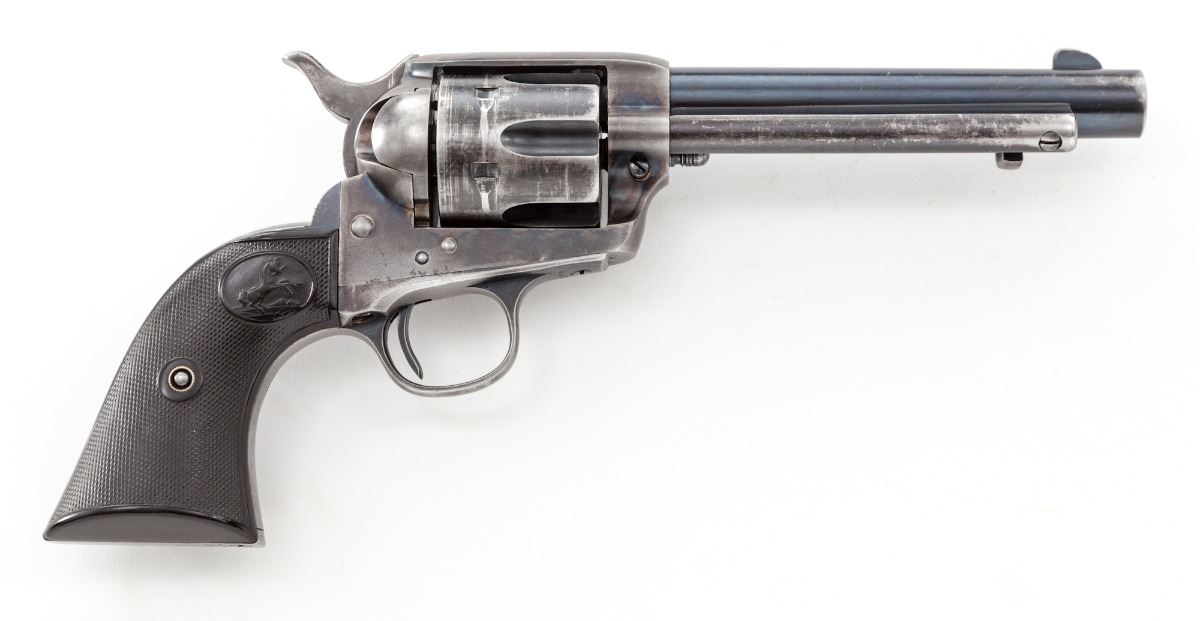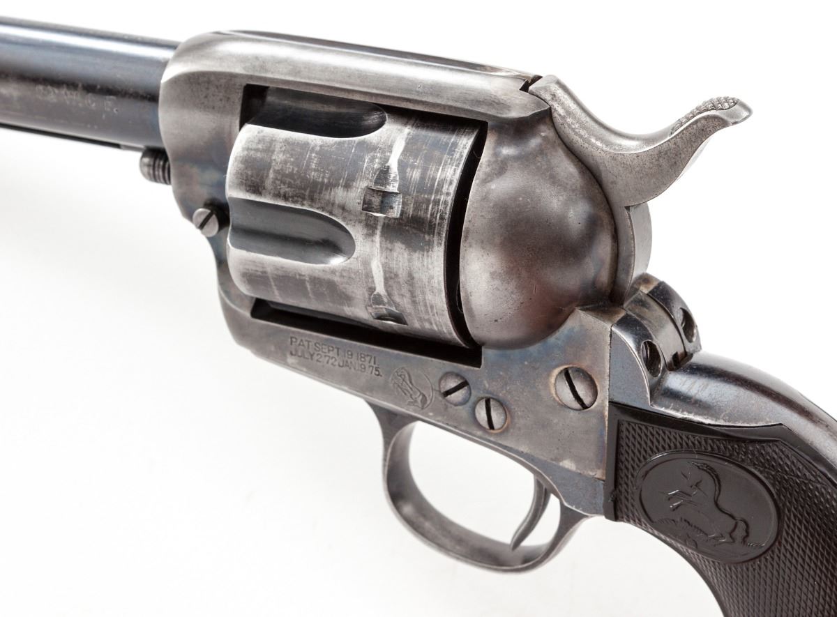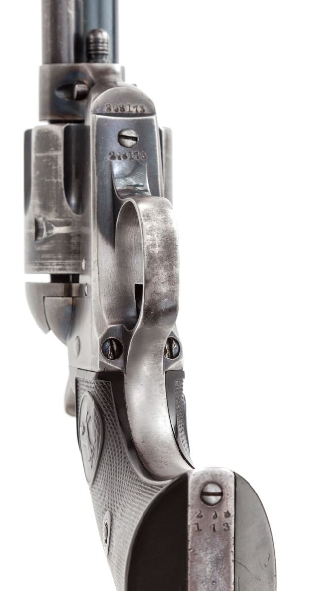 San Francisco shipped 1st Generation Colt Single Action Army Revolver, #298173, .32-20 cal., 5-1/2'' barrel, blue and case hardened finish, factory checkered hard rubber grips. Shipped to Pacific Hardware & Steel Co., San Francisco, CA, on Sept. 3, 1907, two guns in shipment, with all features verified by factory letter. Condition is very good. Barrel and cylinder retain about 70% blue. Front and backstrap have thinned considerably. Case hardened frame with approx. 30%-40% vivid colors. Grips with mild flattening. Action is good, bore is bright. Est.: $2,000-$3,000. (C&R)