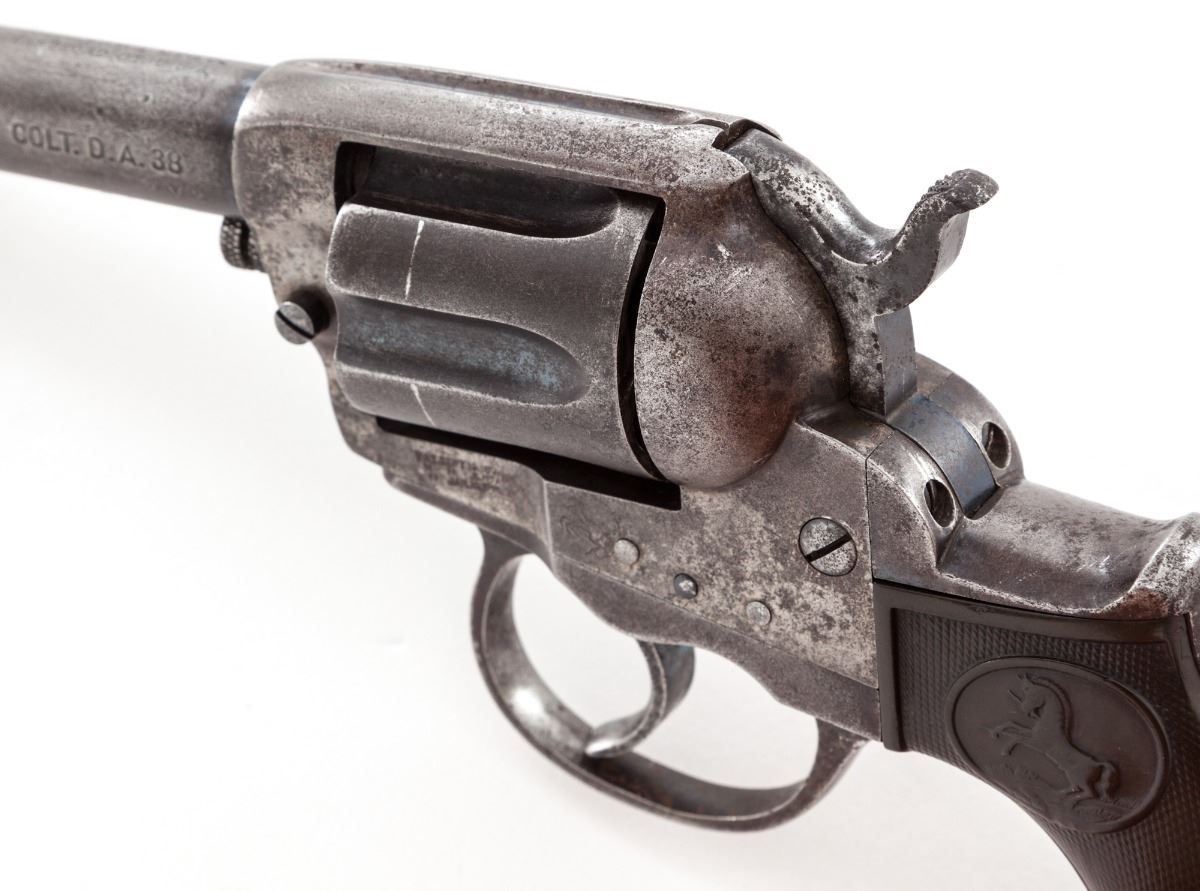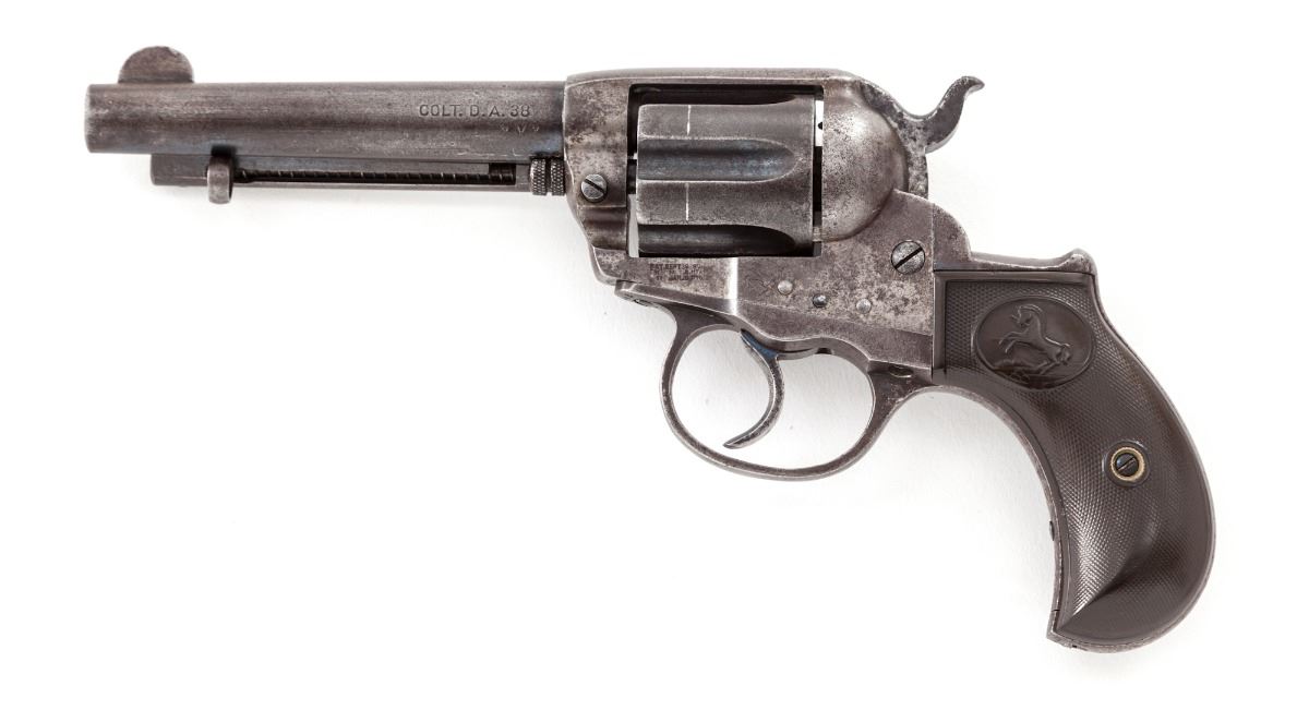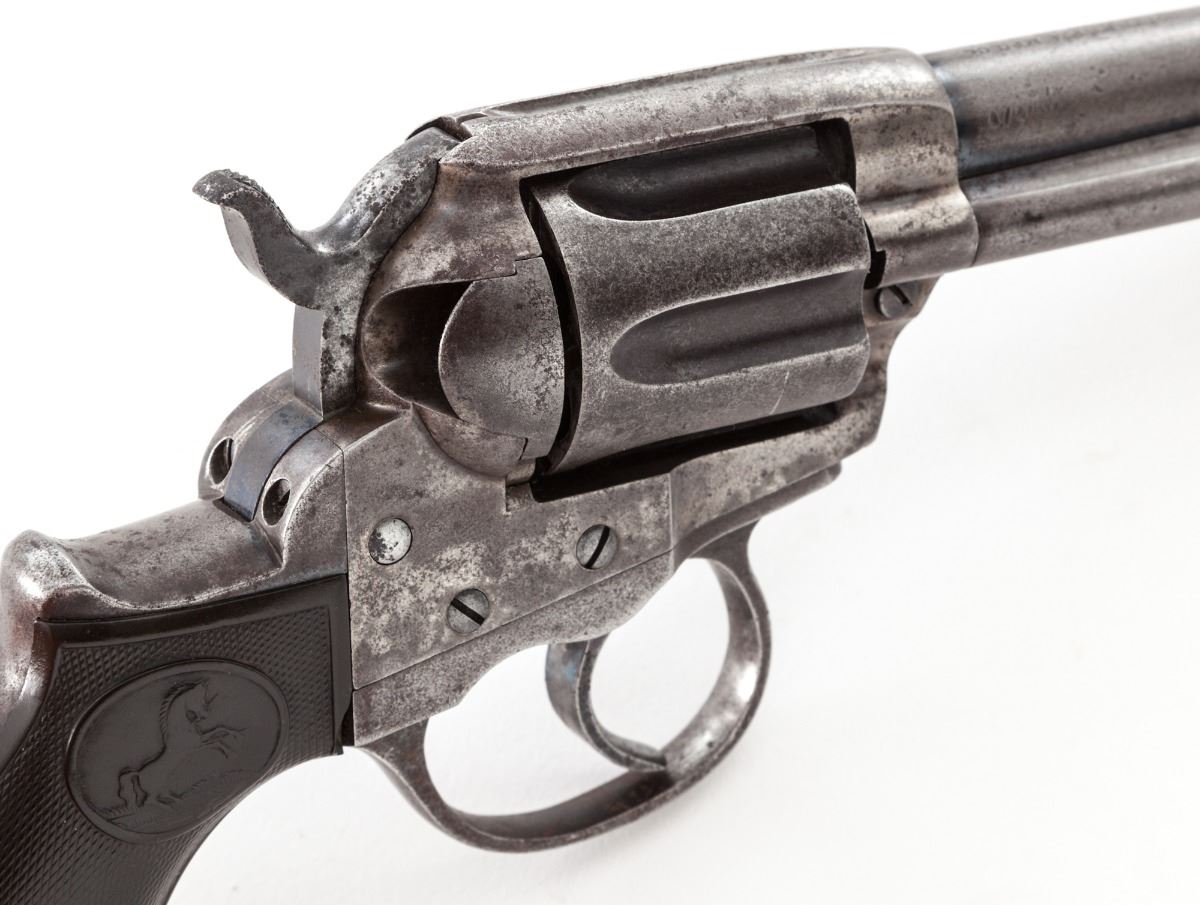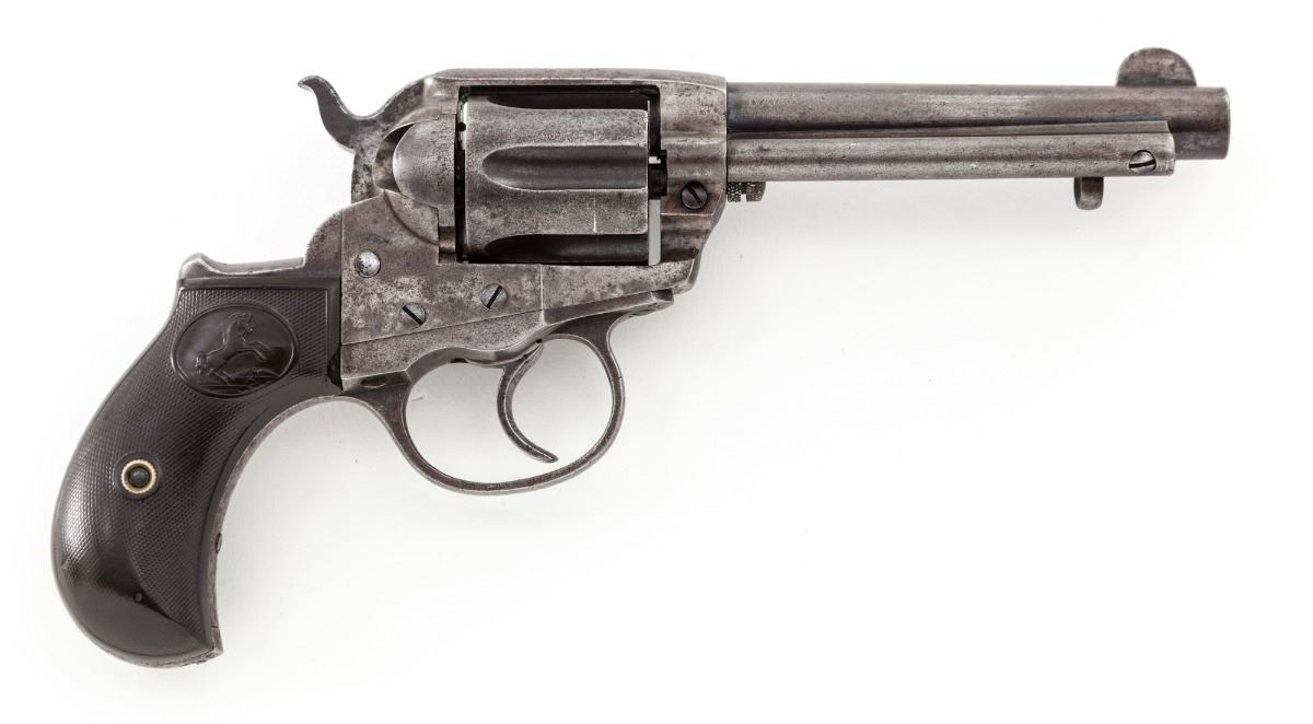 Factory Inscribed Colt Model 1877 Double Action Revolver, #151905, .38 Colt cal., 4-1/2'' barrel, blue and case hardened finish, factory checkered hard rubber grips. Backstrap marked ''AM Exp Co 1904''. Shipped to Wm. Read & Sons, Boston, Mass., on June 15, 1904, in a 50-gun shipment, with factory letter confirming all features. Condition is very good retaining approx. 50%-60% thinning and toning finish, with carbon spotting to hammer and traces of niter blue remaining to trigger, grip screw, and backstrap of hammer. Grips with mild to just moderate flattening. Action is good, bore is fine. A factory verified American Express Lightning revolver. Est.: $1,000-$1,500. (C&R/PPT)