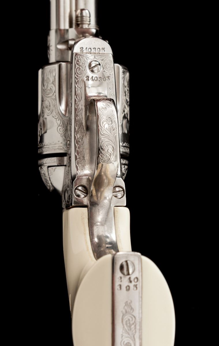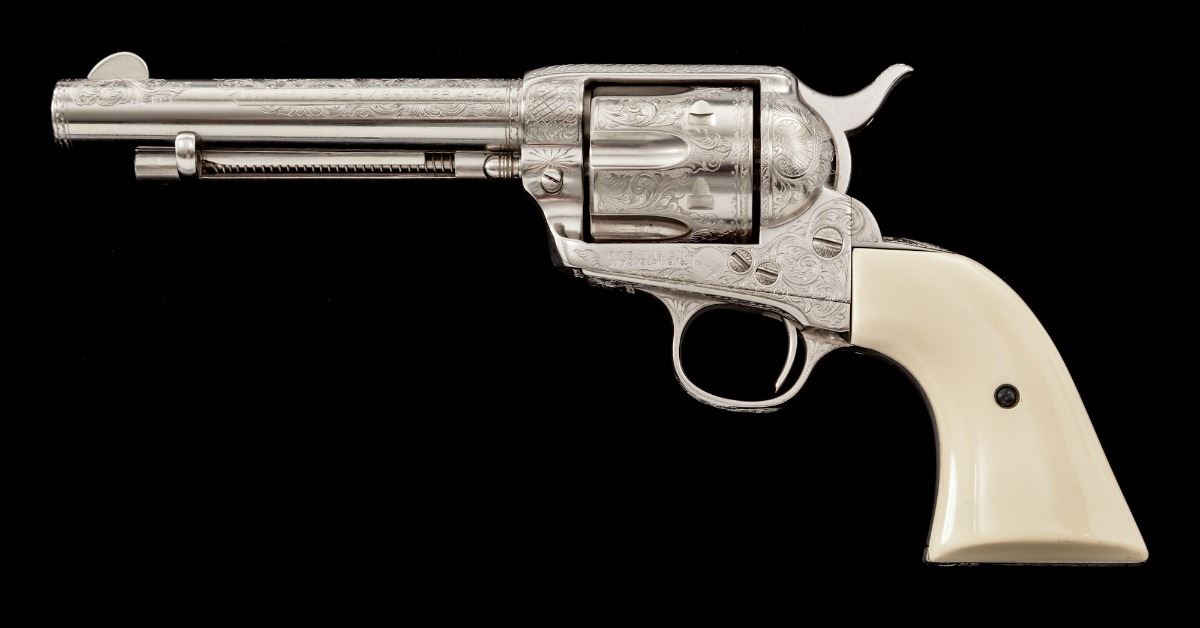 Contemporary Engraved Colt Single Action Revolver, #240395, .44-40 cal., 5-1/2'' barrel, New York style engraving, nickel finish, faux ivory grips. Mfg'd 1903. Condition is excellent as enhanced, retaining approx. 98%+ modern nickel finish. All visible matching numbers. Grips and action are good, bore is about good to very good. Shows very well. Est.: $2,000-$4,000. (C&R/PPT)