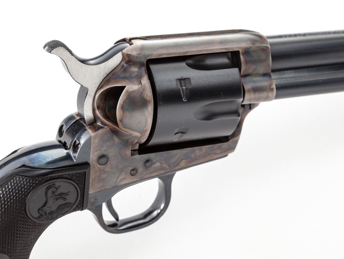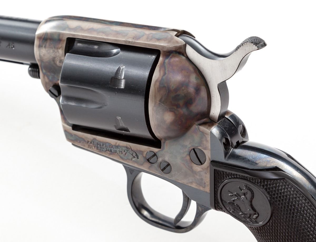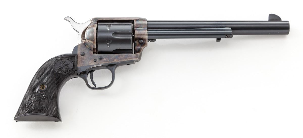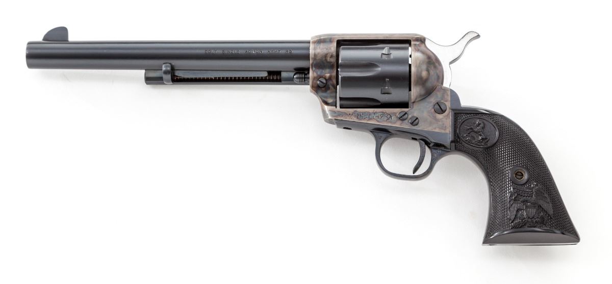 2nd Generation Colt Single Action Army Revolver, #55377SA, .45 Colt cal., 7-1/2'' barrel, blue and case hardened finish, factory checkered black plastic eagle grips. Condition is excellent retaining approx. 97% factory blue with minor thinning to finish at cylinder and muzzle. Grips and action are crisp, bore is bright. Est.: $1,750-$2,250. (C&R/PPT)