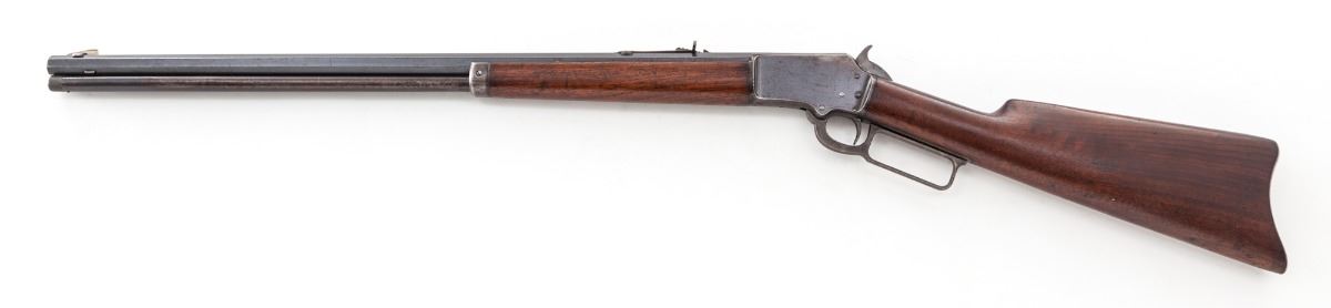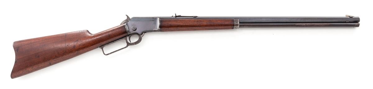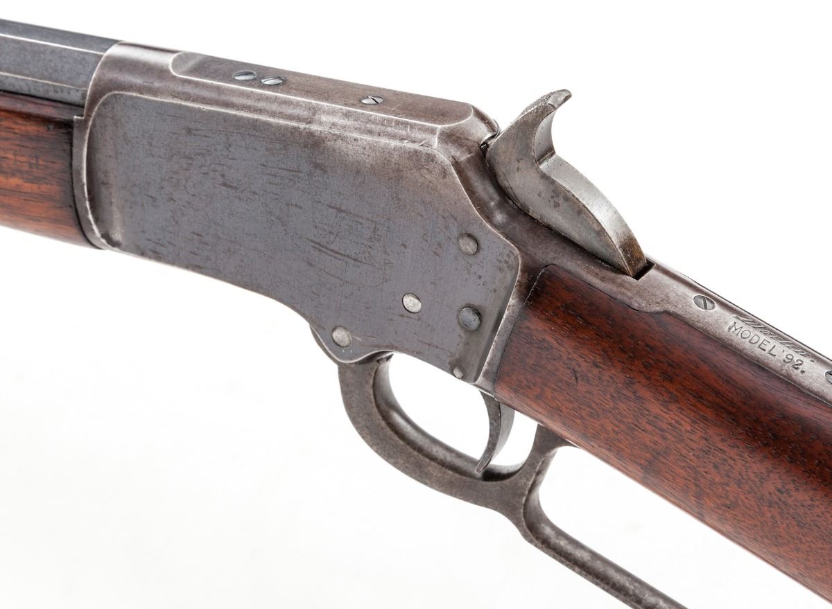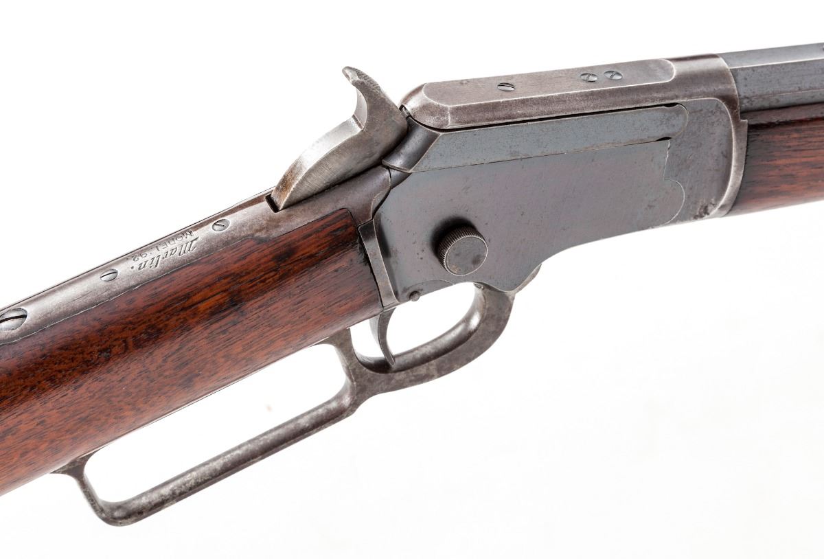 Marlin Model 92 Lever Action Rifle, #333971, .32 RF cal., 24'' octagonal barrel, blue finish, walnut stock, case hardened hammer and lever. Mfg'd 1906. Condition is about fine retaining approx. 80%-85% blue with most of the losses to the mag tube and upper portion of frame. Stock shows marks from handling, oil darkening near metal surfaces, and possibly an additional coat of linseed oil. Action is good, bore is very good. Est.: $500-$750. (C&R)