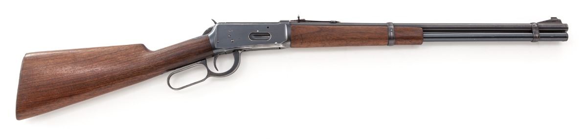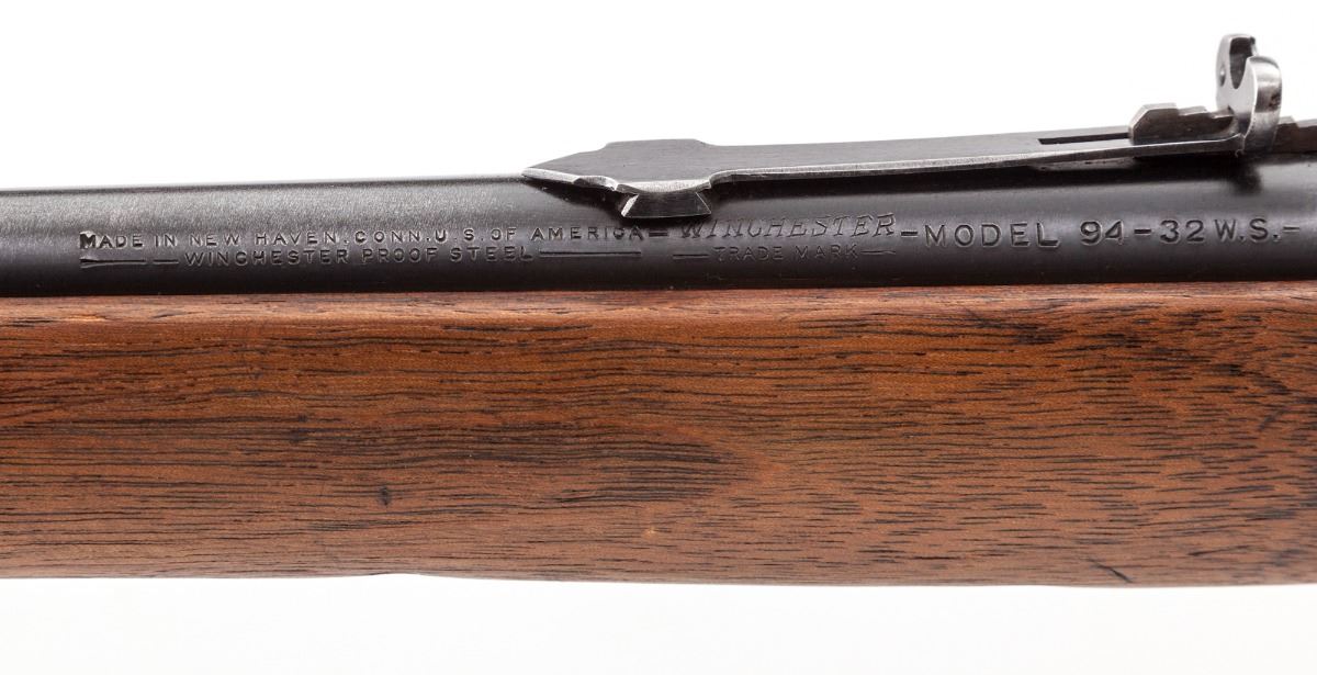 Winchester Model 94 Lever Action Carbine, #1327024, .32 WS cal., 20'' barrel, blue finish, walnut stock and forend. Mfg'd between 1943-1948. Condition is fine retaining approx. 90% lightly thinning factory blue. Stock with just light scuffs. Action is good, bore is mirror bright. Est.: $500-$750. (C&R)