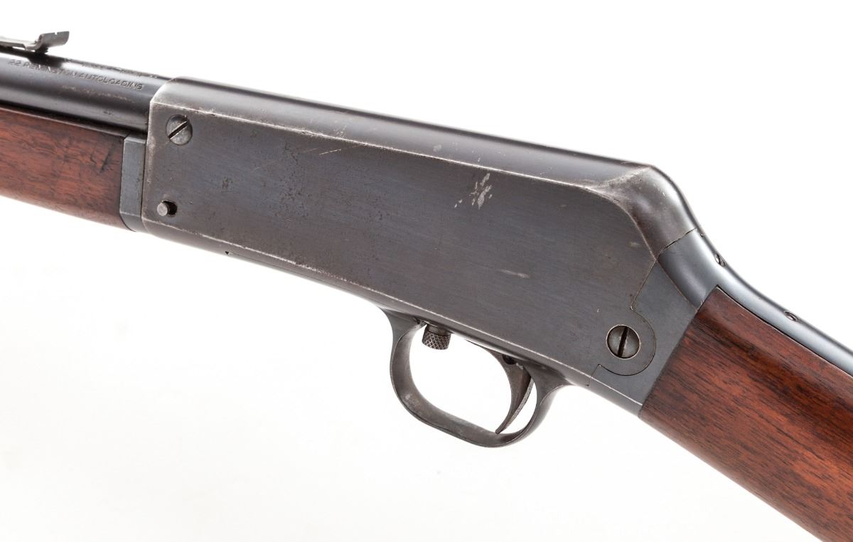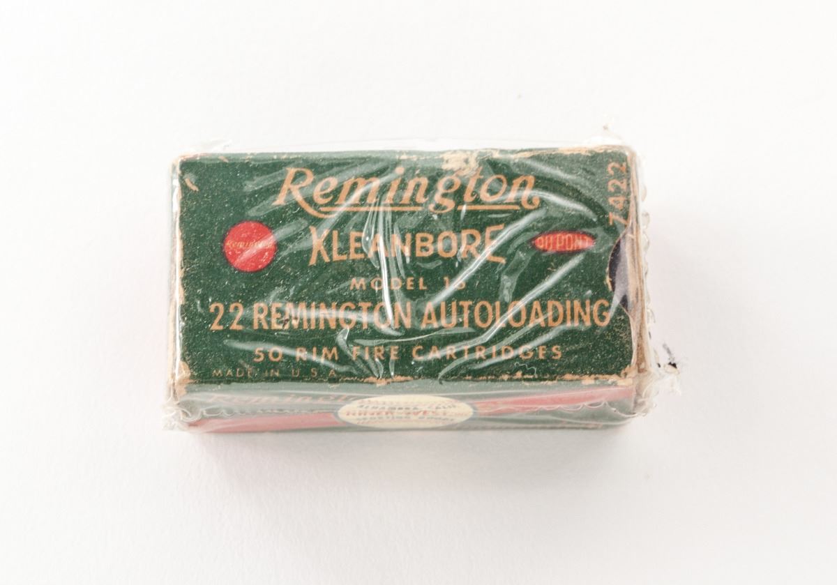 Remington Model 16 Semi-Automatic Rifle, #3045, .22 Rem. Auto cal., 22'' barrel, blue finish, walnut stock, with one box of Kleanbore Remington ammo. Condition is near fine retaining approx. 85%-90% factory blue with scratches to flat sides of frame and wear to highpoints. Stock with scuffs and pressure dings to left side, and thinning to finish at wrist and forend. Action is good, bore is bright. Est.: $600-$800. (C&R)