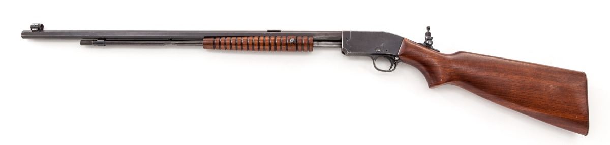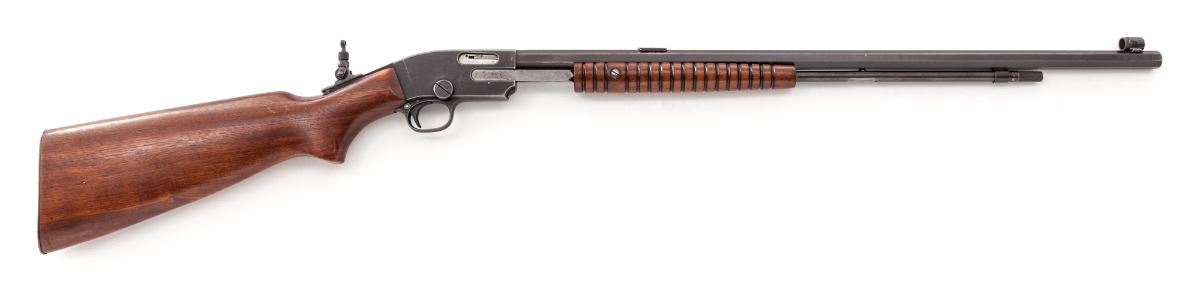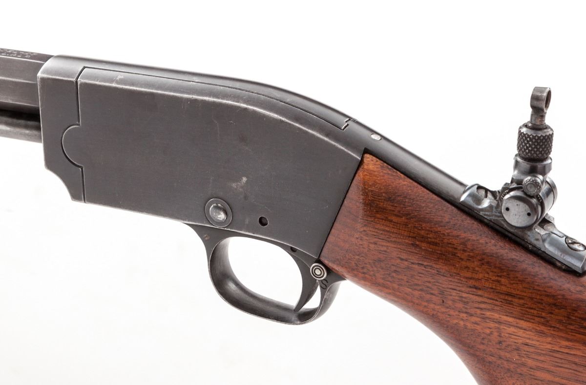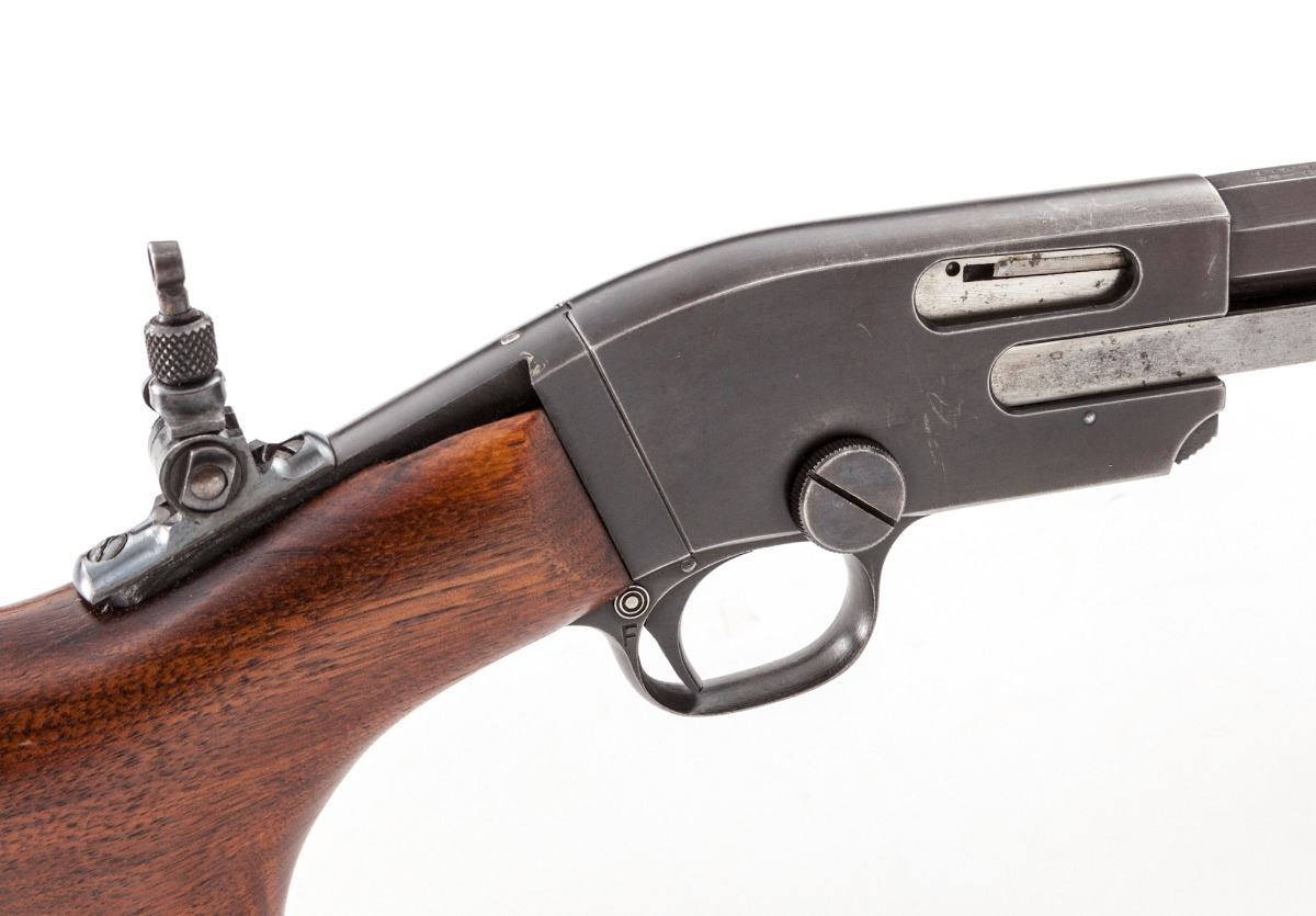 Savage Model 25 Takedown Pump Action Rifle, #3120, .22 S-L-LR cal., 24'' octagonal barrel, matte blue finish, walnut stock and forend, with globe front and Marbles type tang rear sight. Mfg'd approx. 1925. Considered scarce as only mfg'd from 1925-29. Condition is fine retaining approx. 92%-94% thinning and very lightly toning blue. Stock with small loss to right side of upper tang. Action is good, bore is fine. Est.: $400-$600. (C&R)