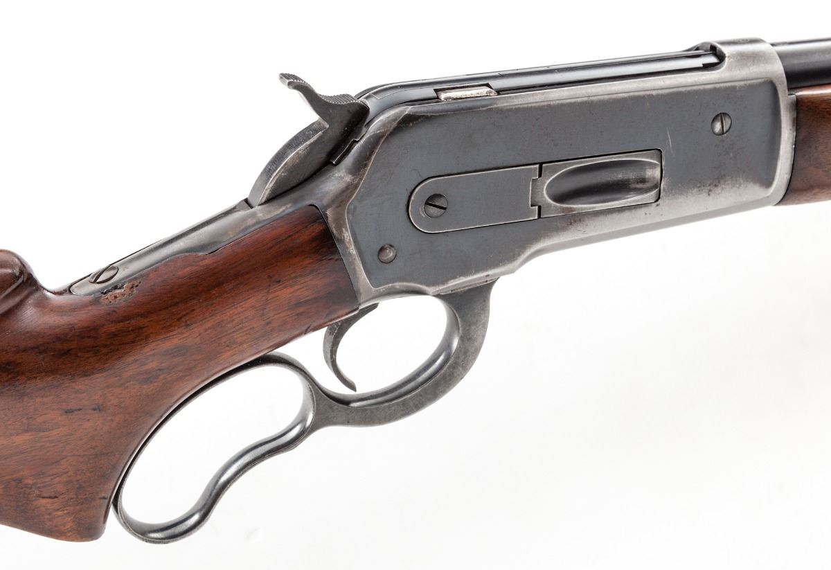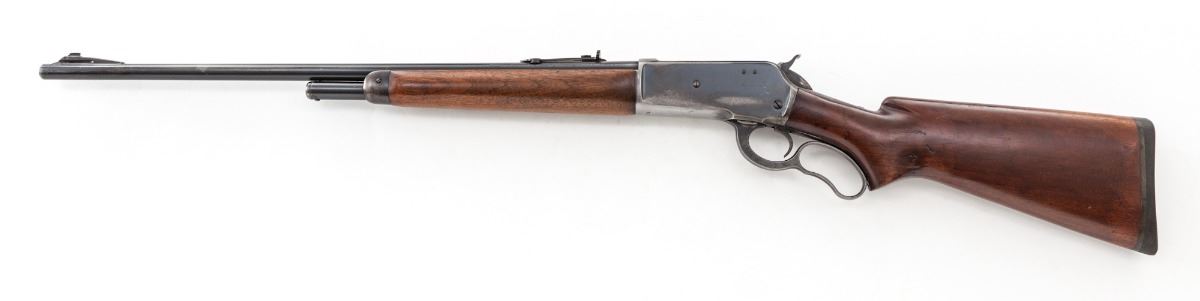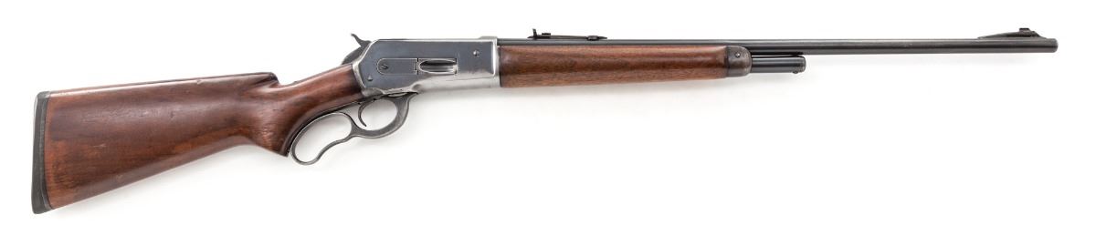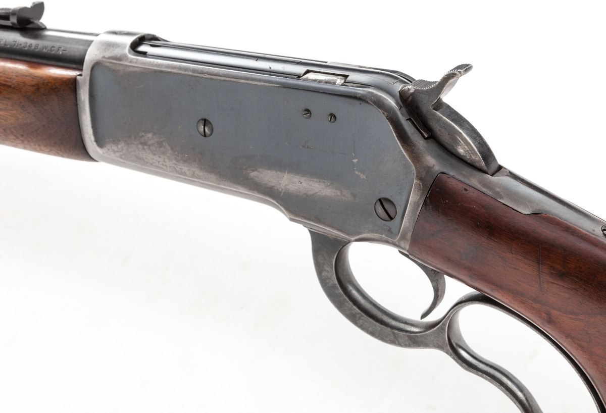 Winchester Model 71 Lever Action Rifle, #30056, .348 WCF cal., 24'' barrel, blue finish, smooth pistol-grip walnut stock. Mfg'd 1950. Condition is very good retaining approx. 75% blue, showing evidence of left side of frame of old peep sight installation. Black Winchester Repeating Arms rubber butt pad appears to be a later addition. Stock with scuffs and scratches and possible light refinishing. Action is good, bore is bright. Est.: $1,000-$1,500. (C&R)