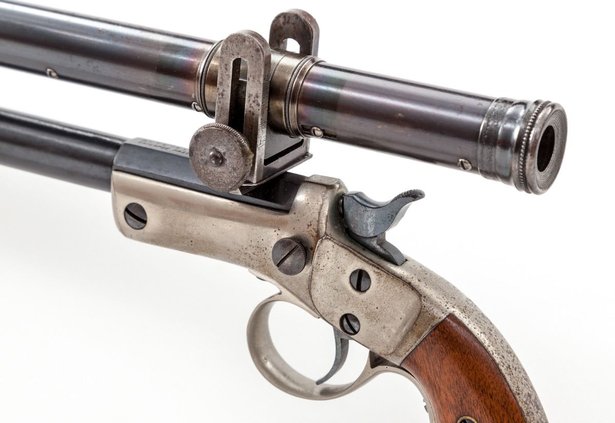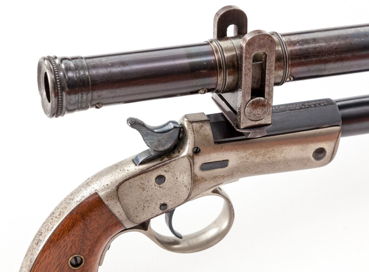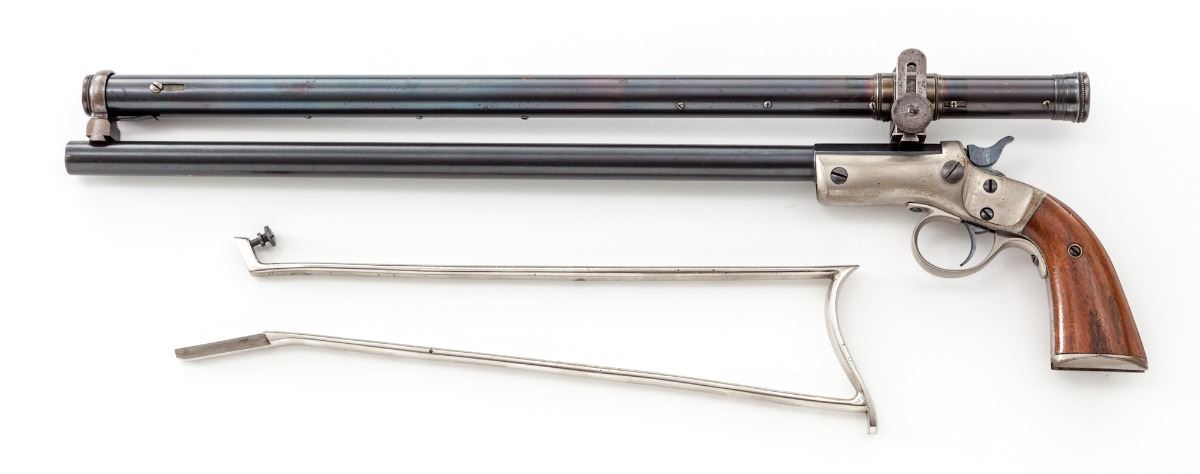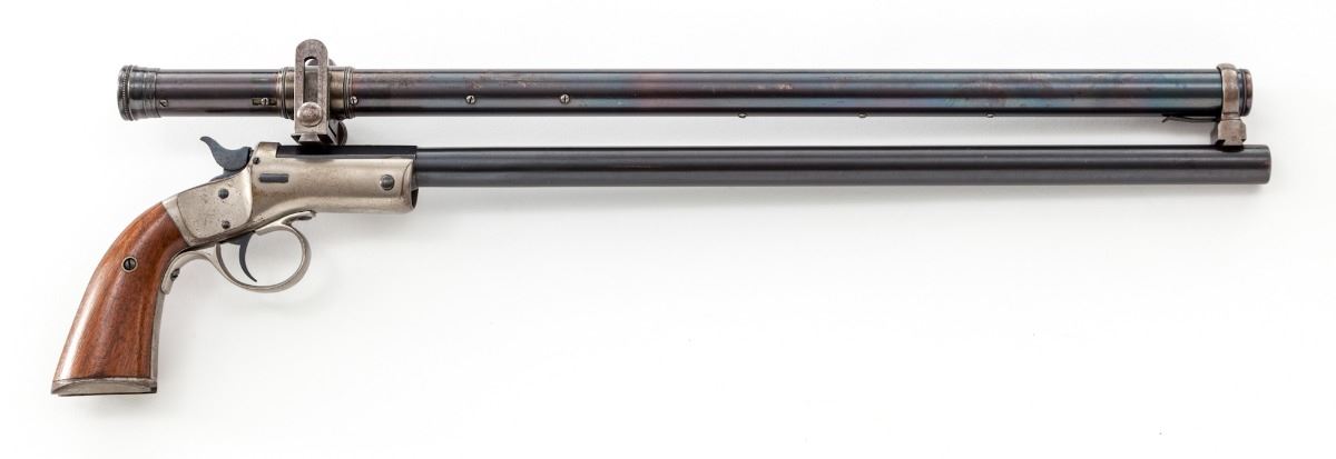 Stevens New Model No. 40 Single Shot Pocket Rifle, #18939, .22 LR cal., 15'' blue barrel, nickel frame, triggerguard, and unnumbered shoulder stock; two-piece walnut grips. Sights have been replaced with dovetail scope mounts fitting into original slots, and topped with a 4-power William Malcolm pistol scope, marked ''Wm. Malcolm, Syracuse, NY''. Mfg'd 1896-1916. Condition is about fine. Barrel assembly retains approx. 96% thinning and lightly toning blue. Nickel components with some toning and mild losses at high edges. Grip panels are fine to near excellent, with some finish loss to left panel. Action, bore and optics are fine. Est.: $1,200-$1,800. (C&R/PPT)