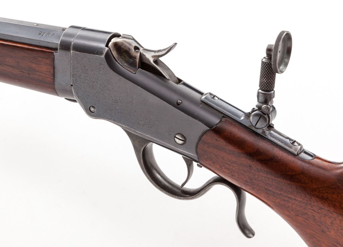 Winchester Takedown Low-Wall Single Shot Rifle, #114592, .25 RF cal., 26'' octagonal barrel No. 1 weight, factory single set trigger, blue finish, smooth pistol-grip walnut stock with Swiss style buttplate, hooded front ghost ring sight, Marbles tang sight, top barrel flat drilled and tapped for dovetail scope blocks. Mfg'd 1919. Condition is fine retaining approx. 92% lightly thinning blue with speckling to both sides of frame. Stock with light general scratching. Action is good, bore is bright. Est.: $1,500-$2,000. (C&R)