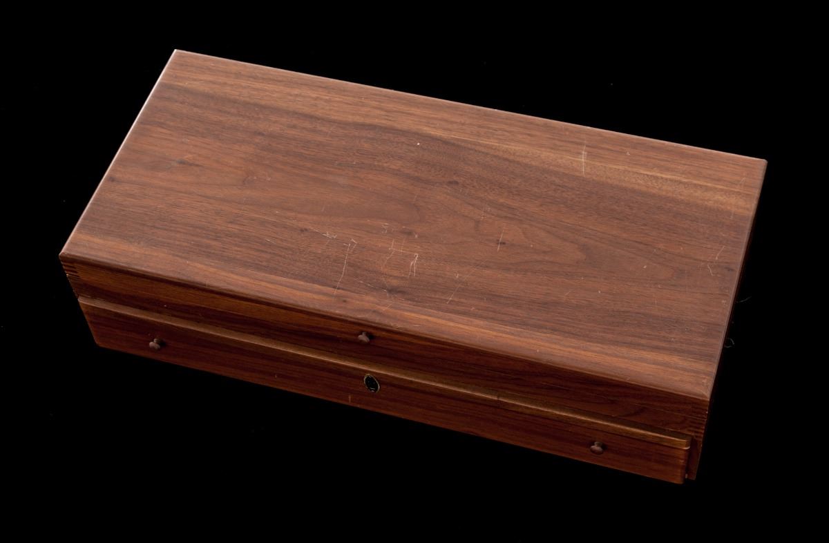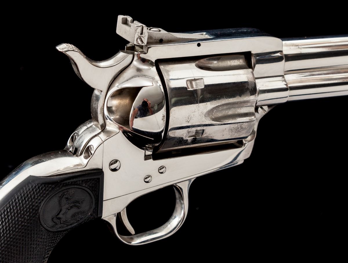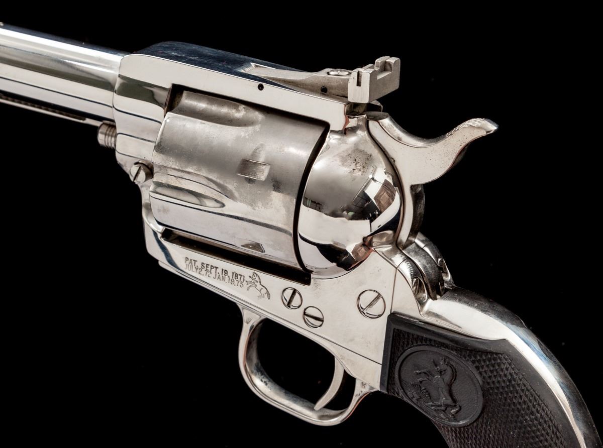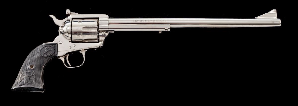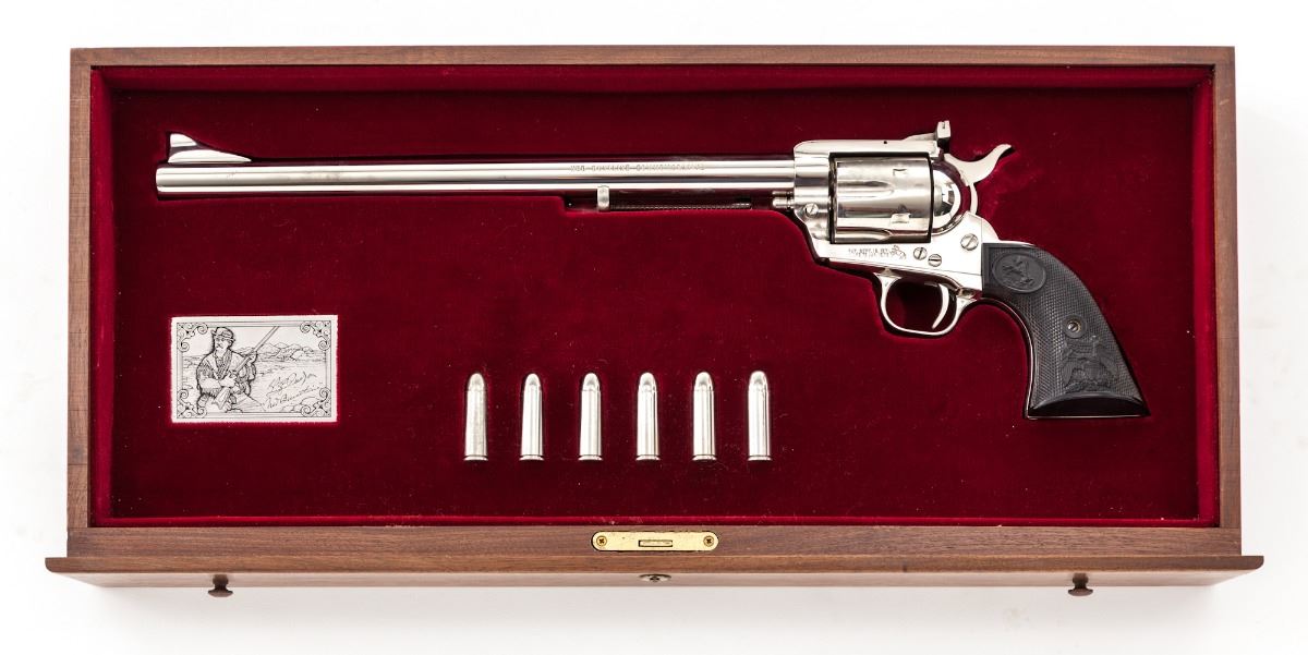Colt Ned Buntline Commemorative New Frontier Single Action Army Revolver, #NB2964, .45 Colt cal., 12'' barrel, nickel finish, factory checkered black plastic eagle grips, with high front and adjustable rear sight. In red velvet French-lined walnut presentation case. Condition is excellent, appearing as new and unfired. However, part of the finish has fogged and should clean with a good quality polish. Grips and action are crisp, bore is mirror bright. Exterior of case with light scuffs. No key. Est.: $1,800-$2,400. (Modern/PPT)