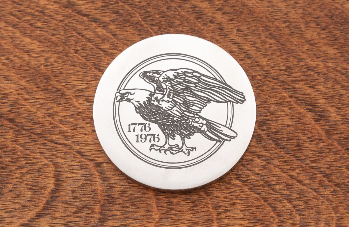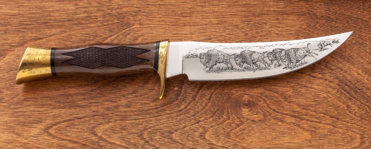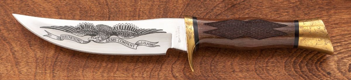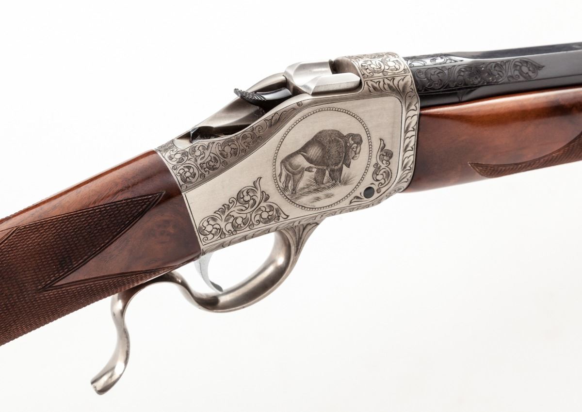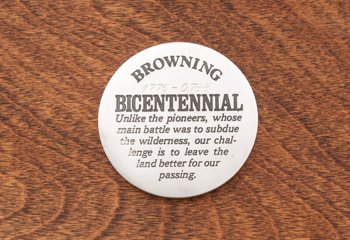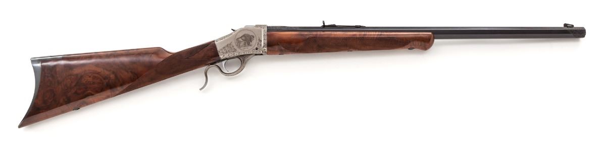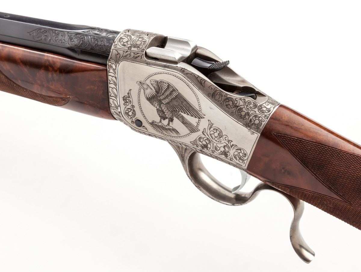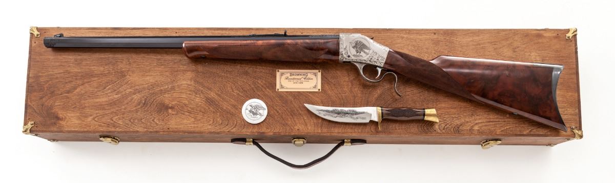Browning Model B-78 BiCenntenial Edition 1 of 1000 (1776-1976) Single Shot Rifle, 1776#0788, .45-70 cal., 24'' octagonal barrel, coin finished frame, beautifully scroll engraved with bison and bald eagle scene to receiver flat, fancy checkered walnut stock with engraved blue buttplate. Muzzle and breech area of barrel additionally scroll engraved. Mfg'd in Japan, finished in Belgium. In presentation case with similarly adorned Browning USA skinning knife, and individually numbered commemorative coin. Condition is excellent showing only the slightest marks from handling, with small areas of wood lightly lifting to heaviest burl portion. In original red velvet-lined pine case with external plaque. One small area of very light corrosion to upper portion of buttplate area. Left edge of lever with minor carbon spotting. Original factory box and instructions are included. Exterior of original box with light water damage that shows as mild wrinkling. Est.: $2,000-$3,000. (Modern)