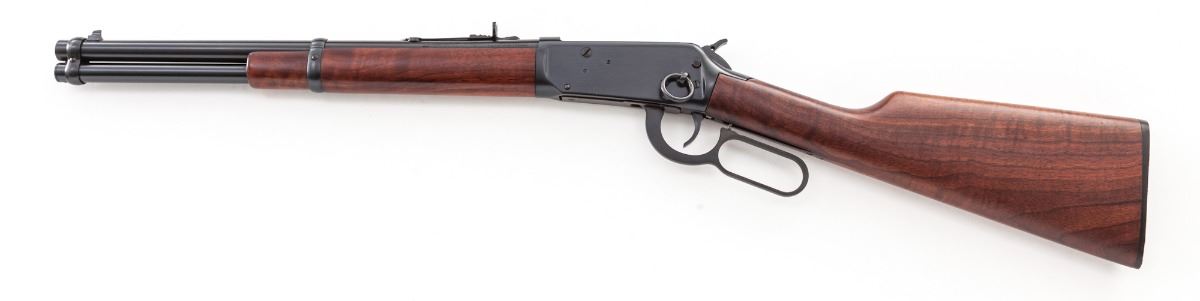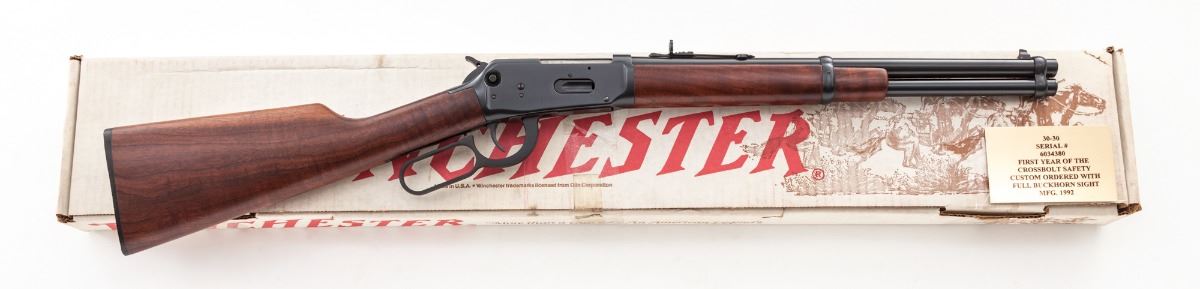 Winchester Custom Shop Model 94AE Lever Action Carbine, #6034380, .30-30 cal., 16'' barrel, blue finish, walnut stock, with crossbolt safety, lanyard ring, and angle eject receiver. First year of crossbolt safety, custom ordered with full buckhorn sight. Mfg'd 1992. Condition is excellent, appearing as new, in its original white/red box with associated paperwork. Est.: $750-$1,000. (Modern)(Consecutive to Lot )