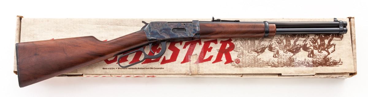 Winchester Model 94AE Lever Action Carbine, #5256575, .30-30 cal., 16'' blue barrel, case hardened frame, smooth walnut stock and forend. This version lacks later safeties, with saddlering and angle eject frame. Condition is excellent, appearing as new, in original white/red box with paperwork. Box shows some soiling and tape residue. Est.: $750-$1,000. (Modern) (Consecutive to Lot 166.)