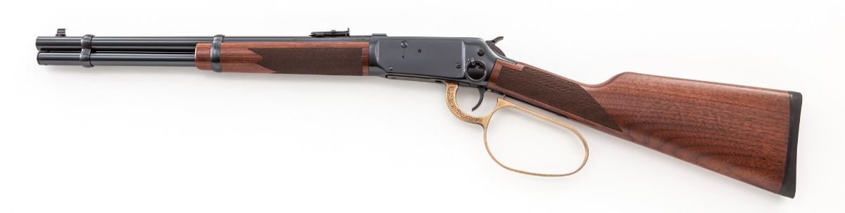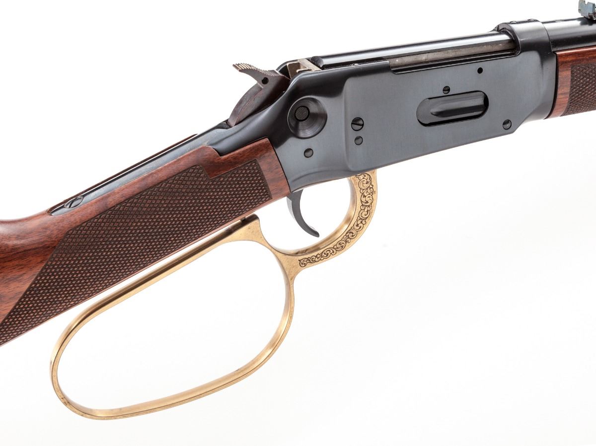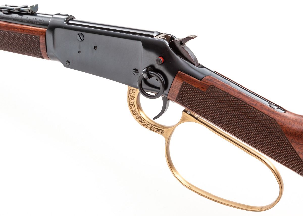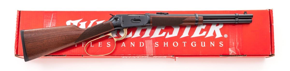 Winchester Custom Shop Deluxe Model 94AE Big Bore Large Loop Lever Action Trapper, #6061633, .307 Win. cal., 16'' barrel, blue finish, antique gold-plated roll engraved large loop lever, checkered walnut stock, Trapper style rear sight, with crossbolt safety, lanyard ring, and angle eject receiver. Condition is excellent, appearing as new, in its original red box (no end label). Box with some tape residue and instructions present. Est.: $1,000-$1,500. (Modern)