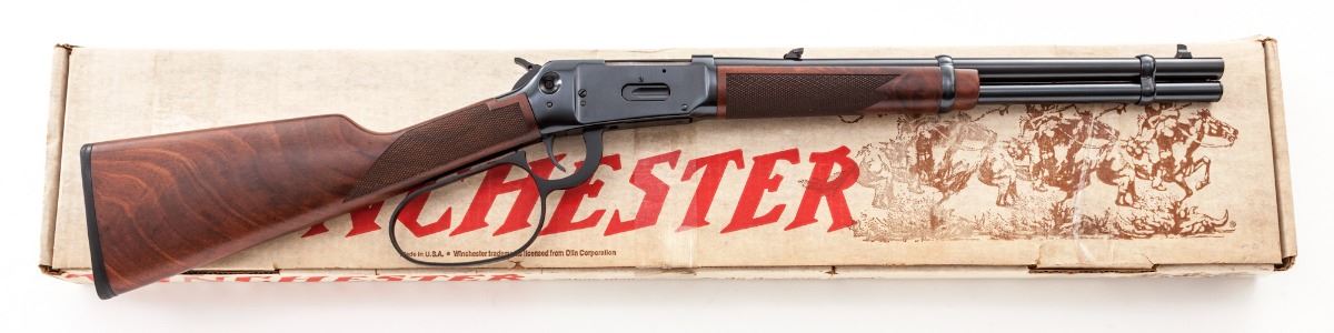 Winchester Custom Shop Model 94AE Big Bore Large Loop Lever Action Carbine, #6067985, .356 Win. cal., 16'' barrel, bright blue finish, factory checkered walnut stock, with crossbolt safety, saddlering, and angle eject frame. Condition is excellent, appearing as new, in original white/red Winchester Custom Shop box dated 9/8/93, ''Special Order 6634''. Box shows some tape residue and retains factory paperwork. Est.: $1,000-$1,500. (Modern)