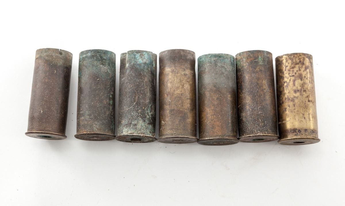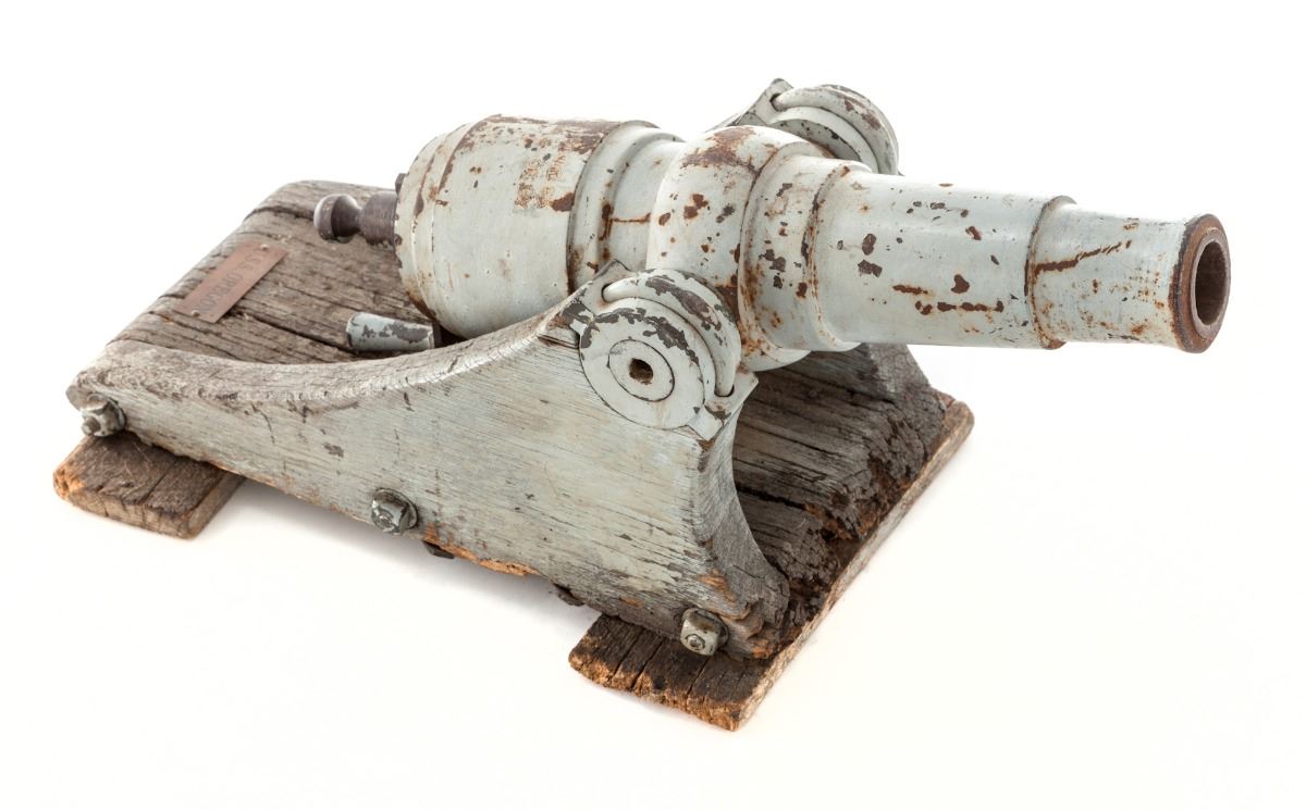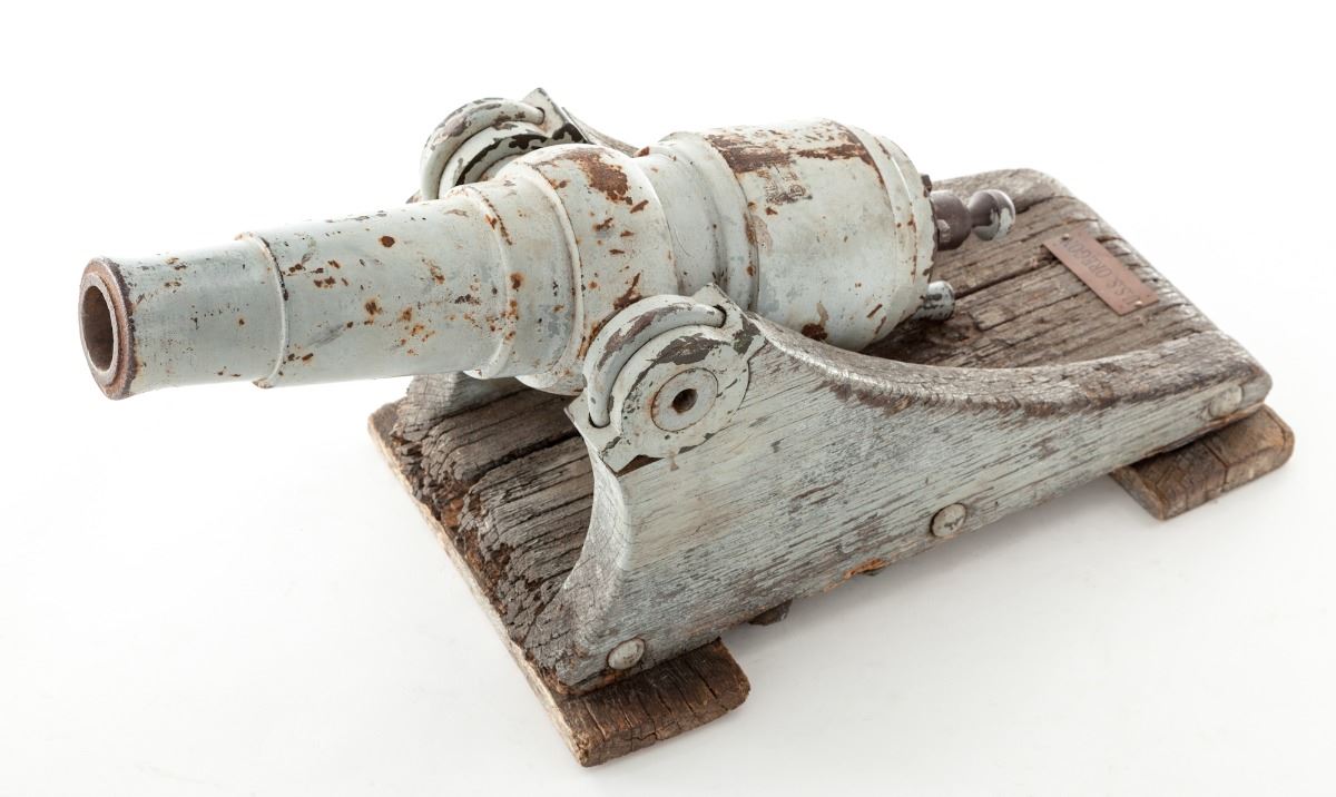 Black Powder Iron Signal Cannon, from the first U.S.S. Oregon Battleship (BB-3) launched Oct. 26, 1893 and scraped on the West Coast in 1956. Cannon take 37mm blanks, with finely made screw breech, measuring 20-1/2'' overall in length by 5'' at widest portion. Cannon features its original carriage and is complete with seven (7) pieces of well-used spent brass casing. Previous owner has added copper plaque that reads ''U.S.S. Oregon''. Condition is very good. Gray paint has been unaltered since salvage approx. 60 years ago. Carriage shows deterioration but is otherwise sound. Good functioning action and bore. Few Great White fleet items remain in private hands. Est.: $2,000-$3,000.