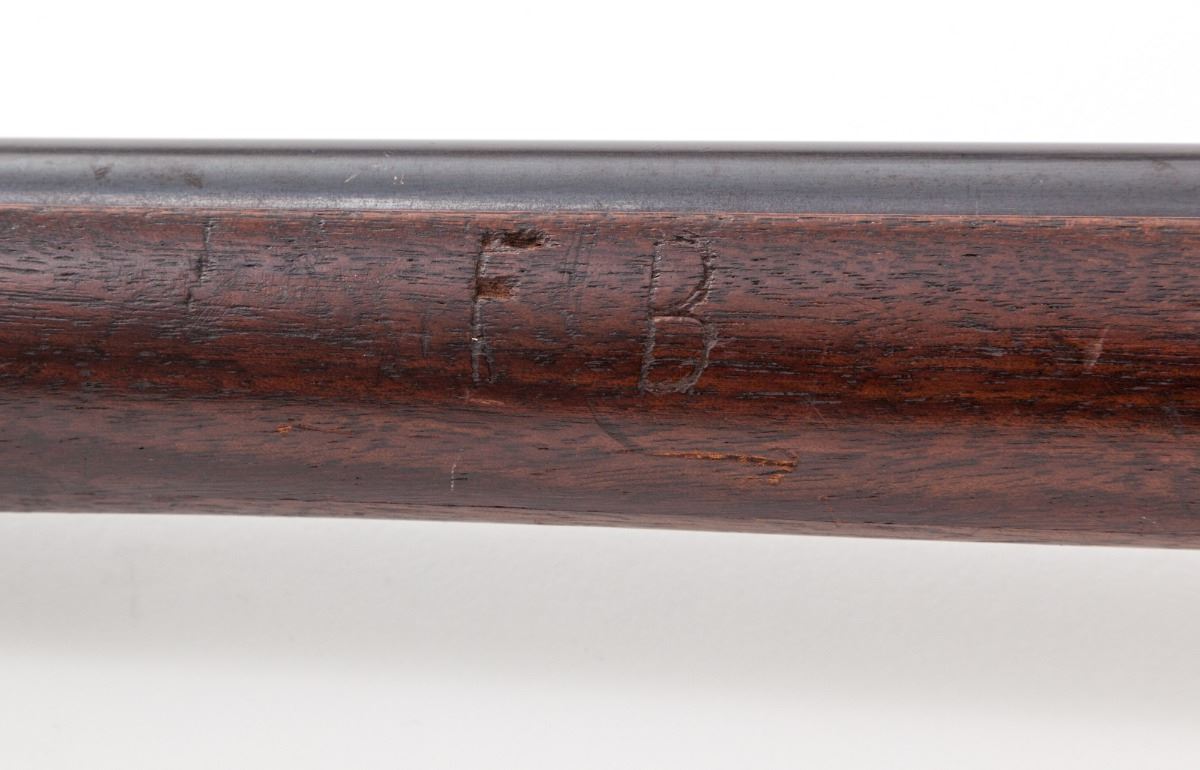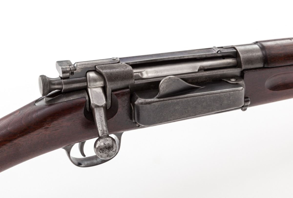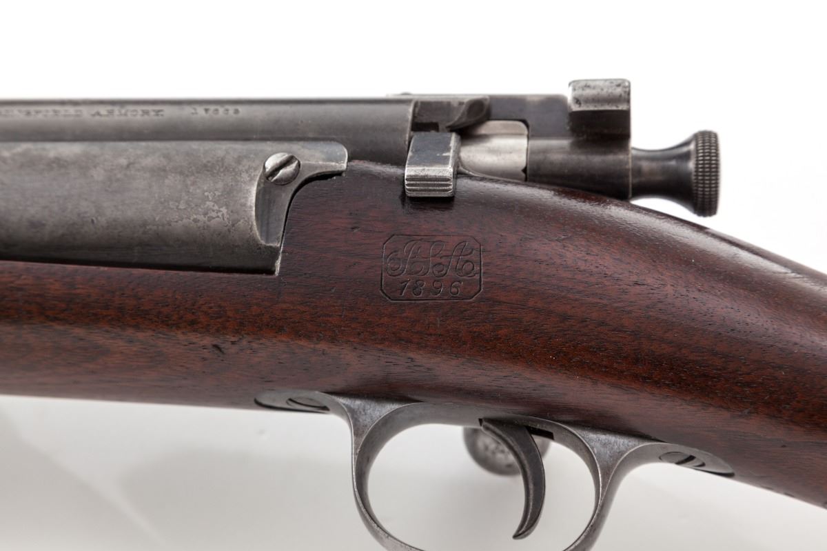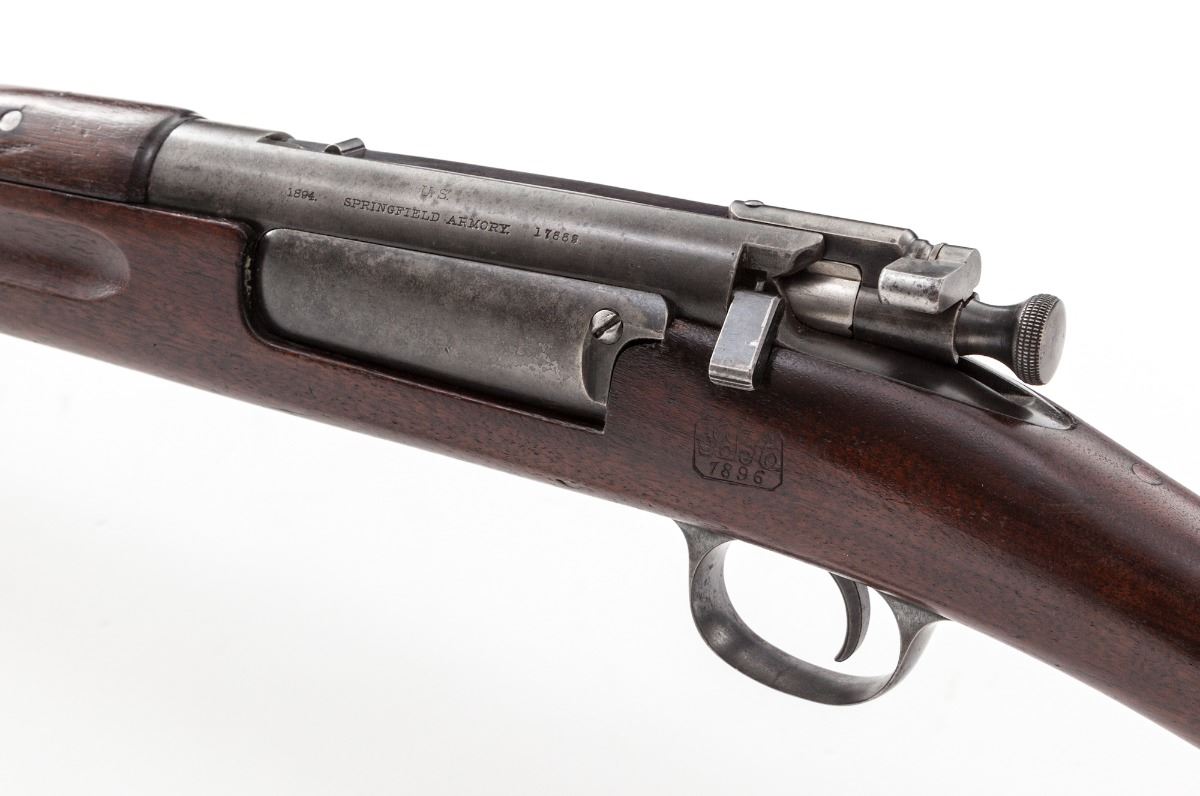 U.S. Model 1894 Krag Bolt Action Rifle, #17889, .30-40 cal., 30'' barrel, blue finish, 1896 cartouched walnut stock. Condition is fine. Case hardened frame retains approx. 70% gray color. Exposed portion of barrel has thinned to approx. 85%. Triggerguard with 40% blue. Stock does not appear to be sanded, with clear cartouches, both to left side and behind triggerguard, as well as company markings to rear portion of comb. Action is good, bore is very good. Est.: $1,200-$1,800. (Antique)