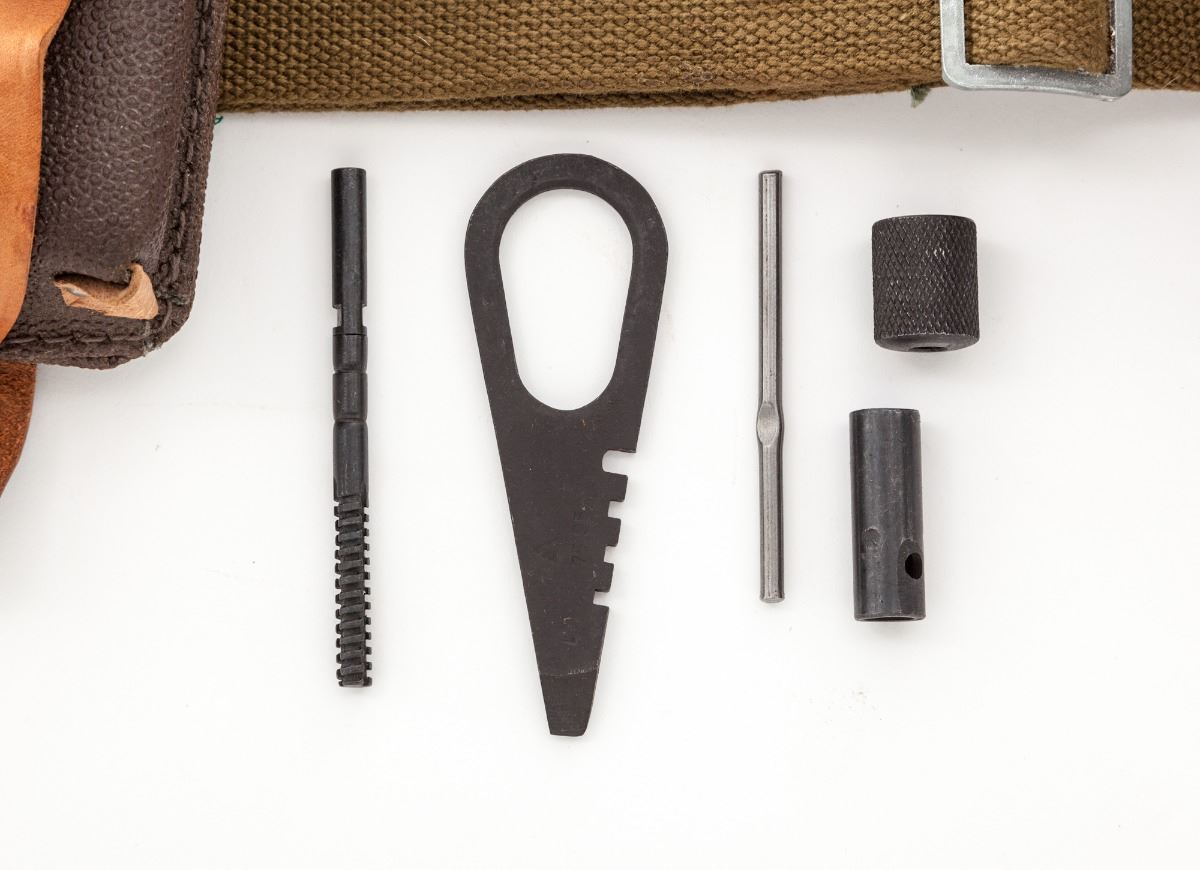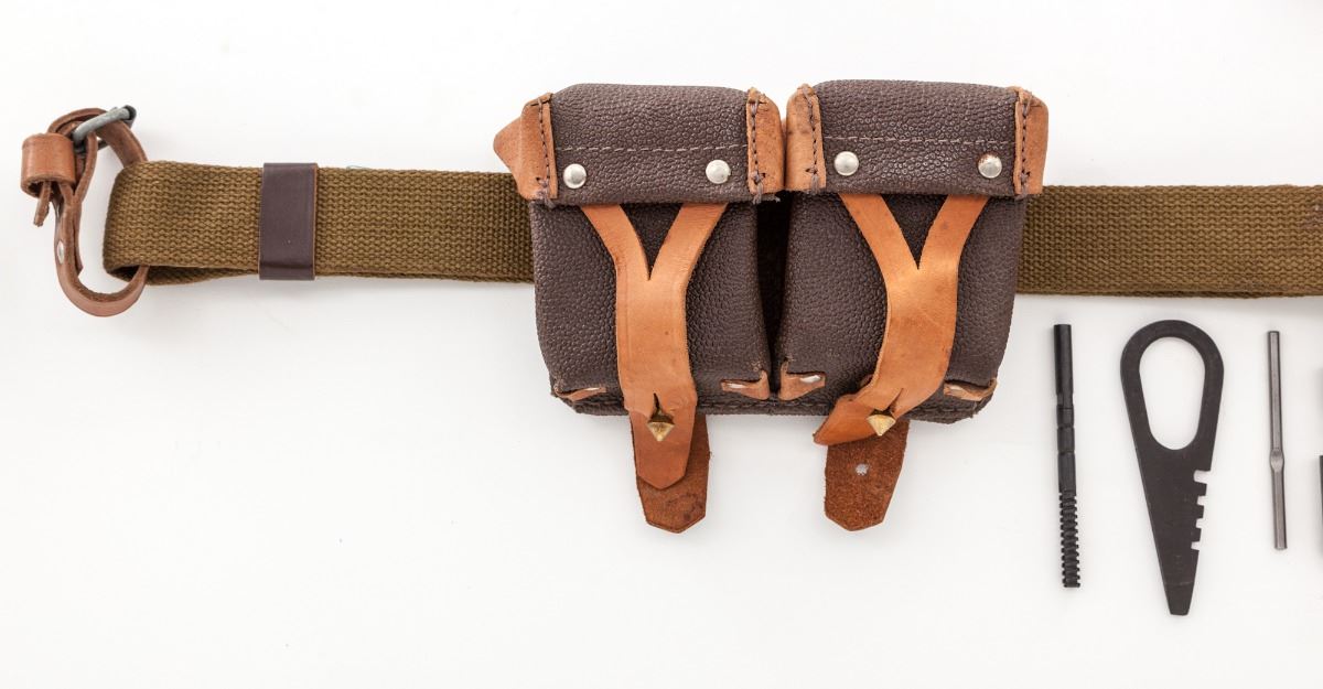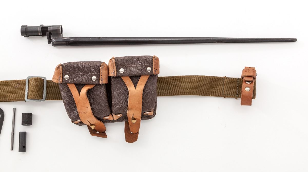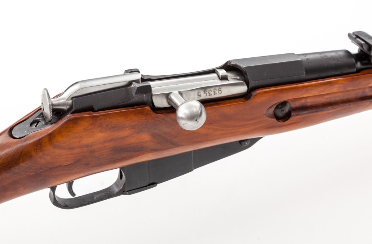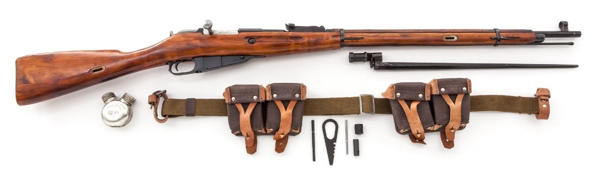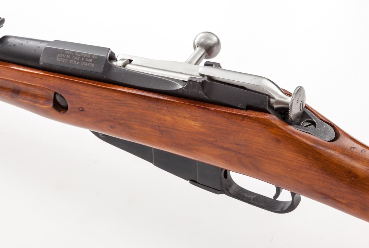 Russian M91/30 Mosin-Nagant Bolt Action Rifle, #014220, 7.62x54Rmm, 29'' barrel, blue finish, bright bolt, beechwood stock, complete with oiler, bayonet, ammo pouches, tools and sling. Condition is excellent as arsenal overhauled. Stock shows light marks from handling. Matching bolt and magazine floorplate. Clearly import marked. Good action and bore. Est.: $300-$500. (C&R)