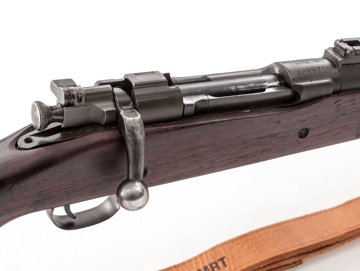 U.S. Model 1903 Bolt Action Rifle, by Remington, #3295715, .30-06 cal., 24'' barrel marked ''RA/10-42'', parkerized finish, walnut Type C pistol-grip stock marked ''RA-P'' that is cut for both Model 1903 and 03-A3 rifles. Includes modern MRT marked M1907 brown leather sling. Condition is very good to near fine. Metal surfaces show approx. 90% finish with thinning in actioning areas. Stock with light general overall pressure dings and darkening at wrist. Action is good, bore is bright. Est.: $500-$750. (C&R)