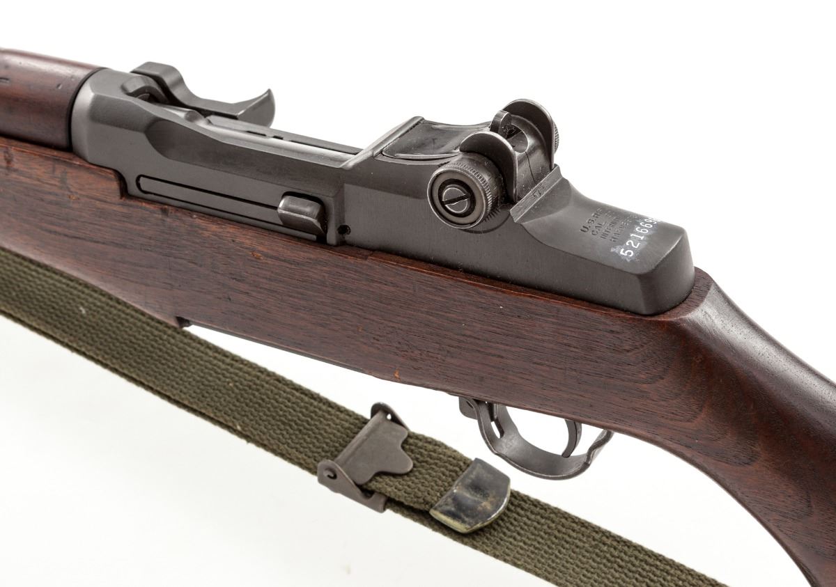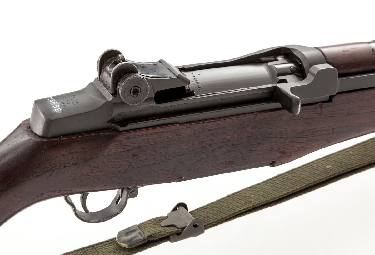 Scarce International Harvester U.S. M1 Garand, with receiver made by H&R, #5216696, .30-06 cal., 24'' barrel by LMR and dated 5-55, DoD cartouched walnut stock, with all internal components by IHC, and all unmarked parts being of the correct late variety. Includes correct post-war green canvas sling. Condition is fine retaining approx. 98% parkerized finish. Stock with light to just moderate handling marks, with visible cartouche. Additional stenciling to right side of cheekpiece is faint. Action is good, bore is bright. Chamber area is parkerized. Est.: $3,500-$5,000. (C&R)