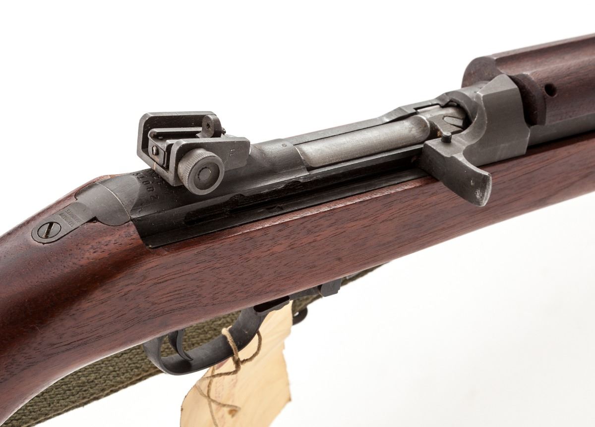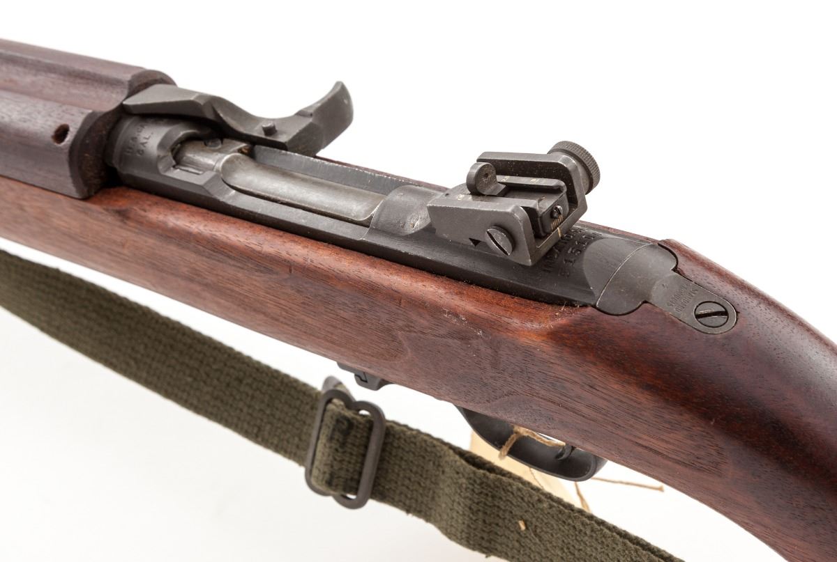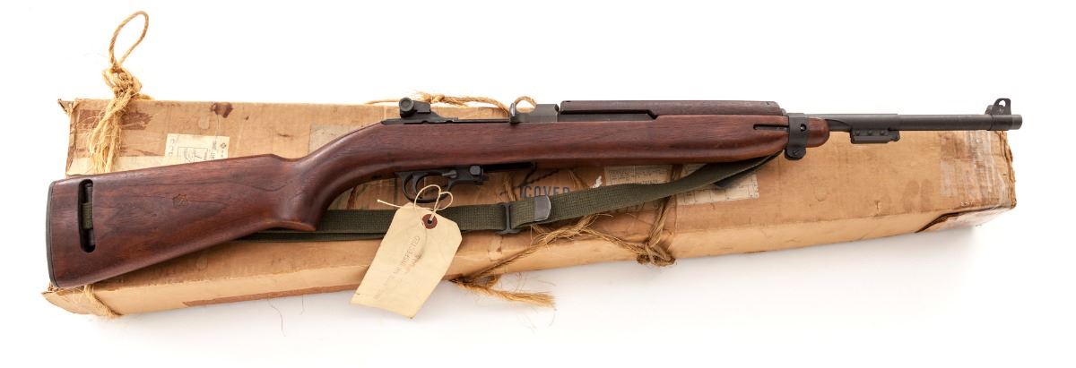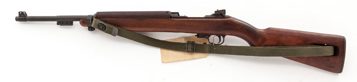 U.S. M1 Carbine, by Inland, #5151002, .30 Carb. cal., 18'' Inland barrel dated 4-44, low wood oval-cut stock marked ''S-HB'', flat bolt, Type 2 milled rear sight, flip safety, standard Products marked recoil lug, post-war green canvas sling, in late 1950s-early 1960s shipping box. No magazine. Arsenal test tag remains in place. Condition is excellent as arsenal reworked. Stock with minor impressions and clear cartouche. Action is crisp, bore is bright. Est.: $800-$1,200. (C&R)