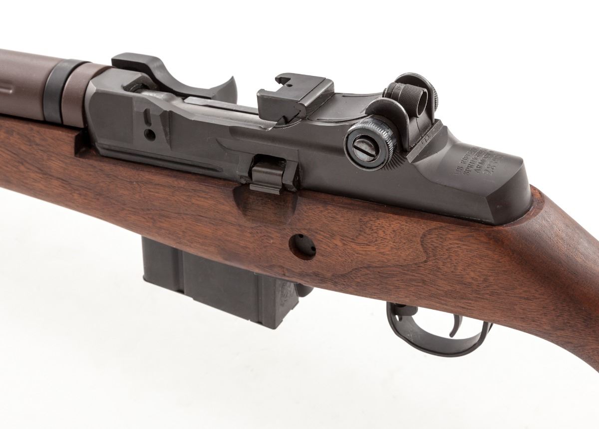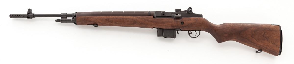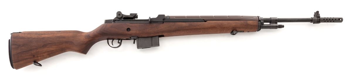Springfield Armory Match Grade M1A Semi-Automatic Rifle, #283981, .308 cal., 22'' barrel with muzzlebrake, parkerized finish, walnut stock, National Match hooded rear sight, and one 10-round magazine. Condition is excellent, appearing as new and unfired, in Springfield hard plastic case with old M14 manual and associated paperwork from the Springfield Armory. Est.: $1,800-$2,400. (Modern)