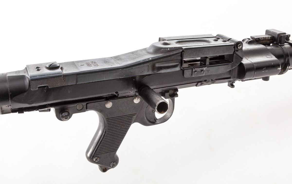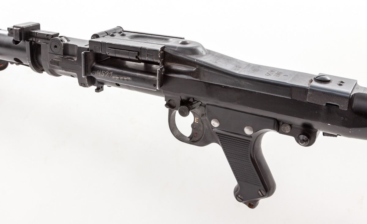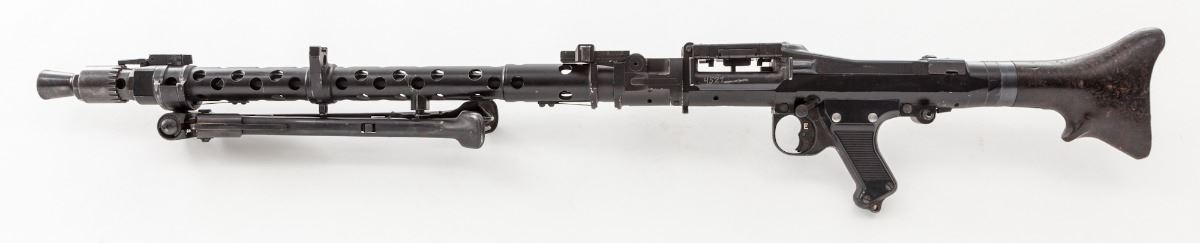 Demilled WWII MG34, mixed numbers, originally 8mm, 28'' barrel, matte finish, Bakelite buttstock, plastic pistol grip. Condition is excellent as completely deactivated, with mixed numbers and good quality parts. Bipod is present. Est.: $1,800-$2,400.