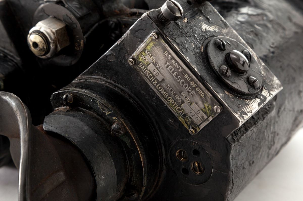 WWII Era Bausch & Lomb Submarine Binoculars, #920, for mounting on the coning tower of a WWII sub. Condition is very good with several coats of black paint. Rubber eye cup shows some deformation and hardening. Optics are very good. Est.: $1,000-$1,500.