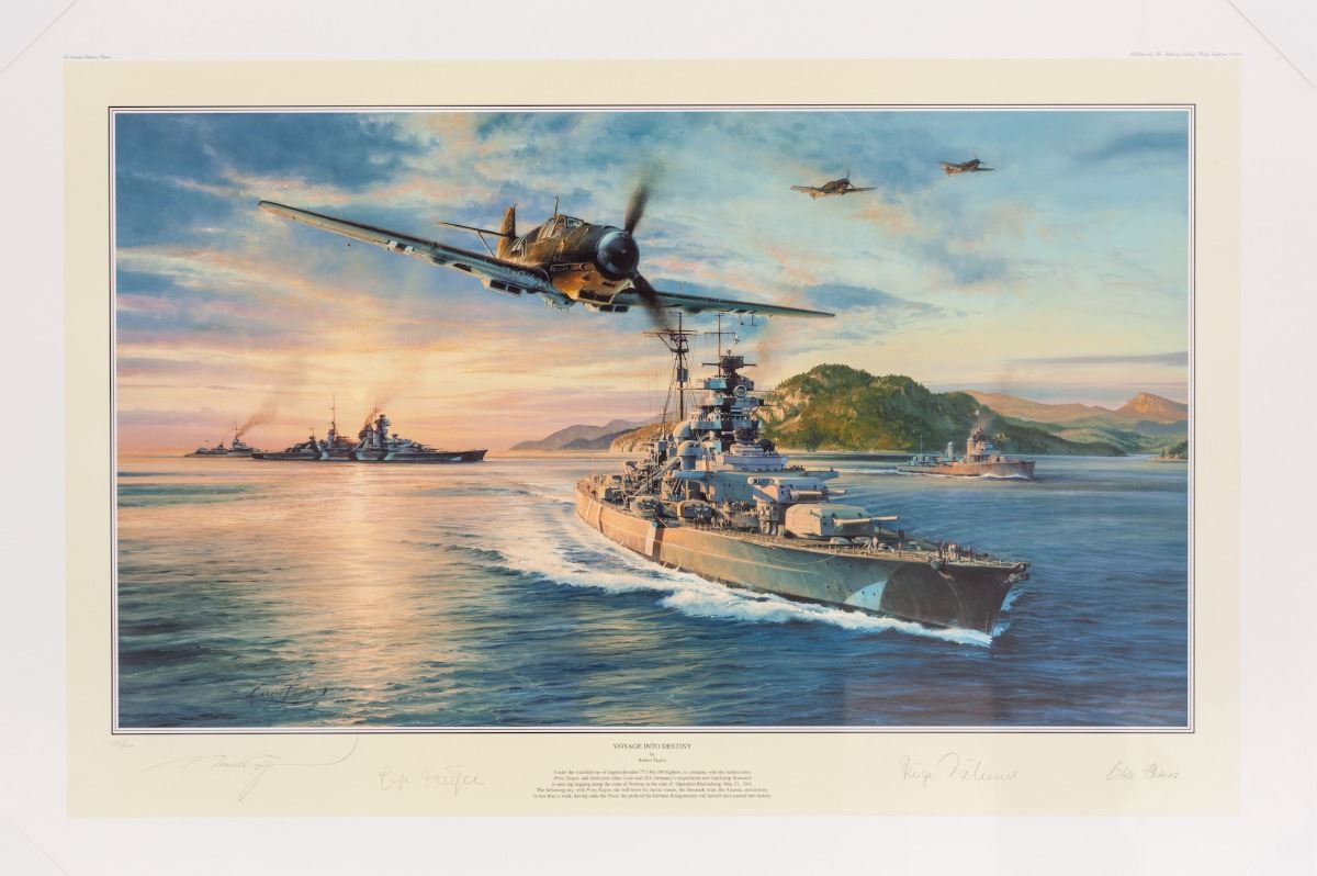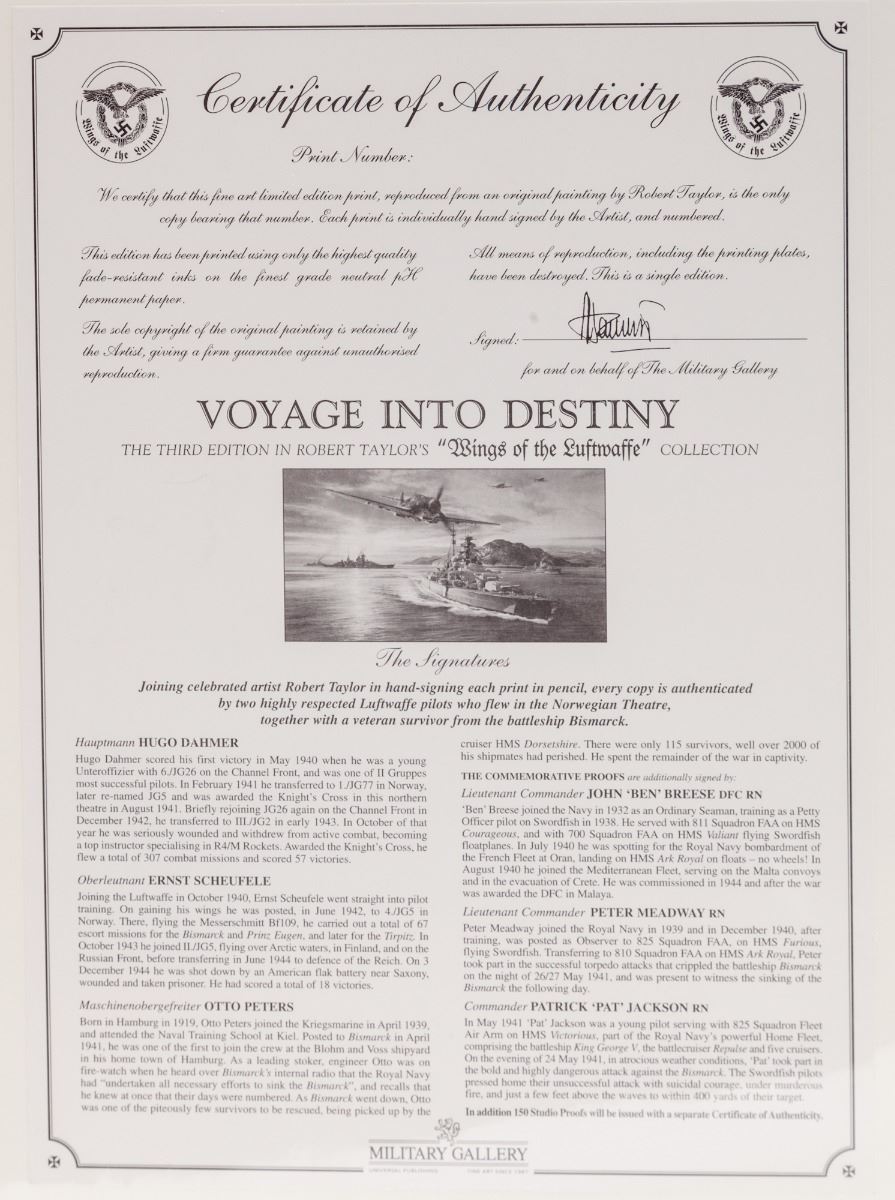 Limited Edition Print, entitled ''Voyage into Destiny'', hand signed by the artist Robert Taylor, #237/500, along with the signatures of two of the Luftwaffe pilots who flew in the Norwegian Theatre. Includes a Certificate of Authenticity and a smaller print entitled ''Thunderbolt'', #67/250, hand signed by 'Gabby' Gabreski and Jim Goodson. Approx. 34''x24'', unframed. Condition is excellent. Est.: $400-$600.