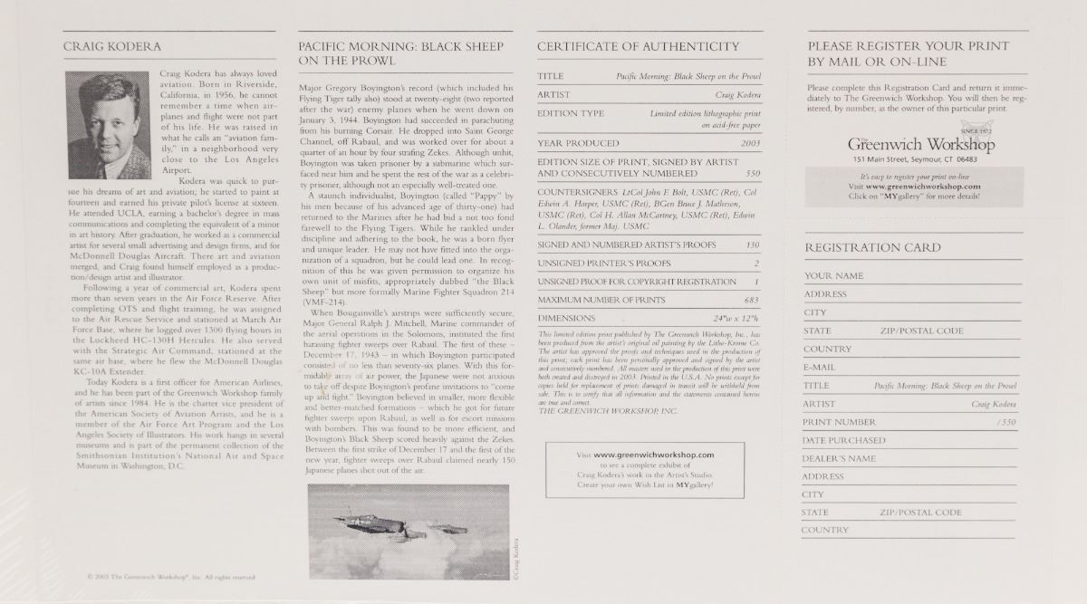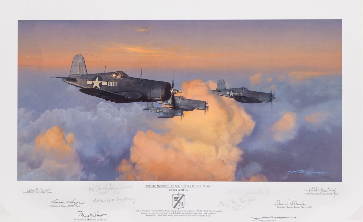 Limited Edition Lithograph Print, entitled ''Pacific Morning: Black Sheep on the Prowl'', hand signed by the artist Craig Kodera, c. 2003, along with the signatures of Lt. Col. John F. Bolt, USMC (Ret.); Col. Edwin A. Harper, USMC (Ret.); BGen. Bruce J. Matheson, USMC (Ret.); Col. H Allan McCartney, USMC (Ret.); Edwin L. Olander, former Maj. USMC. Includes Certificate of Authenticity. Approx. 24''x12'', unframed. Condition is excellent. Est.: $400-$600.