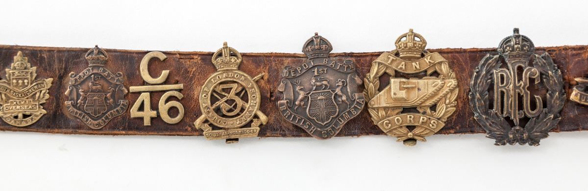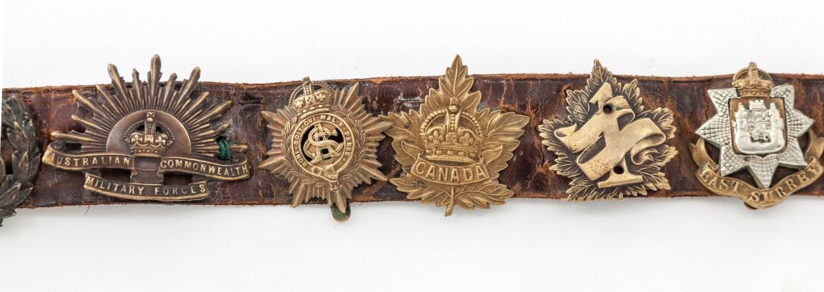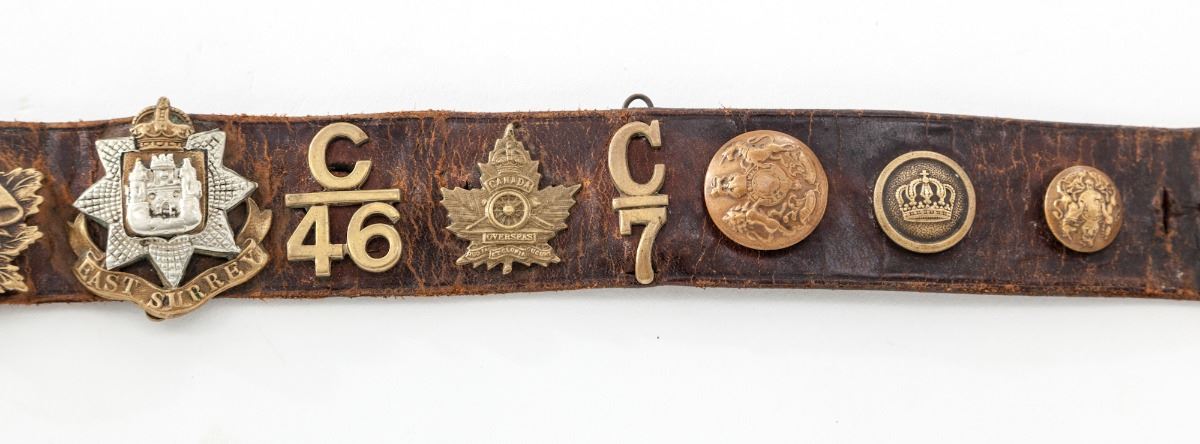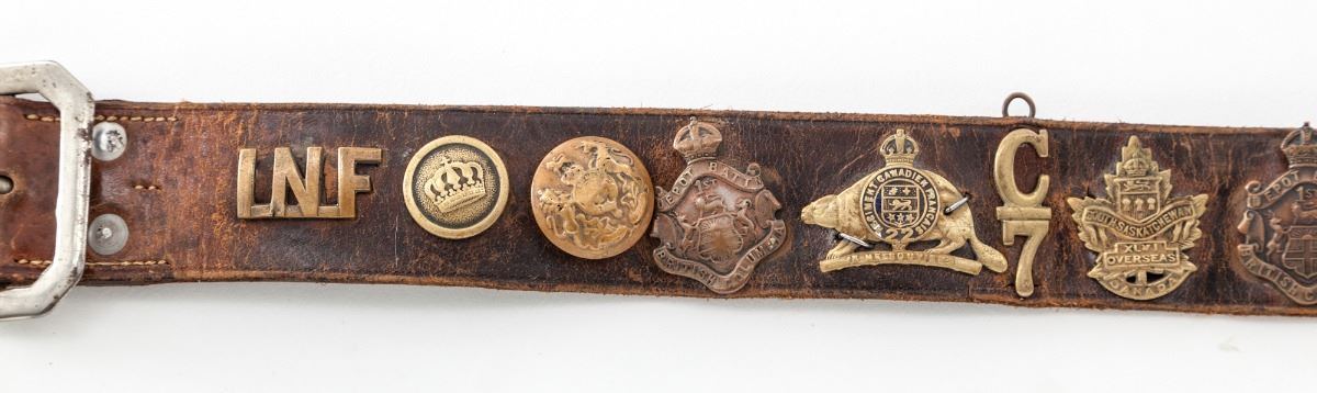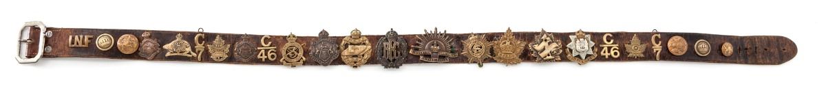 WWI ''Hate'' Belt, made by German guards during WWI using unit badges taken from prisoners. Approx. 24 brass buttons or devices have been applied to this particular strip of leather, including Tank Corps, Australian, Canadian, RFC and County of London Yeomanry devices. Condition is excellent showing patination commensurate with age. Est.: $500-$750.