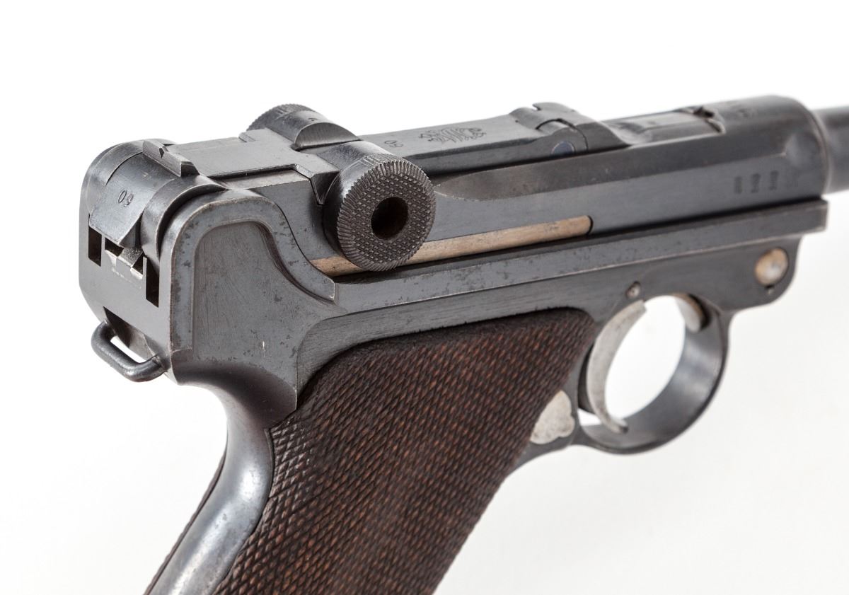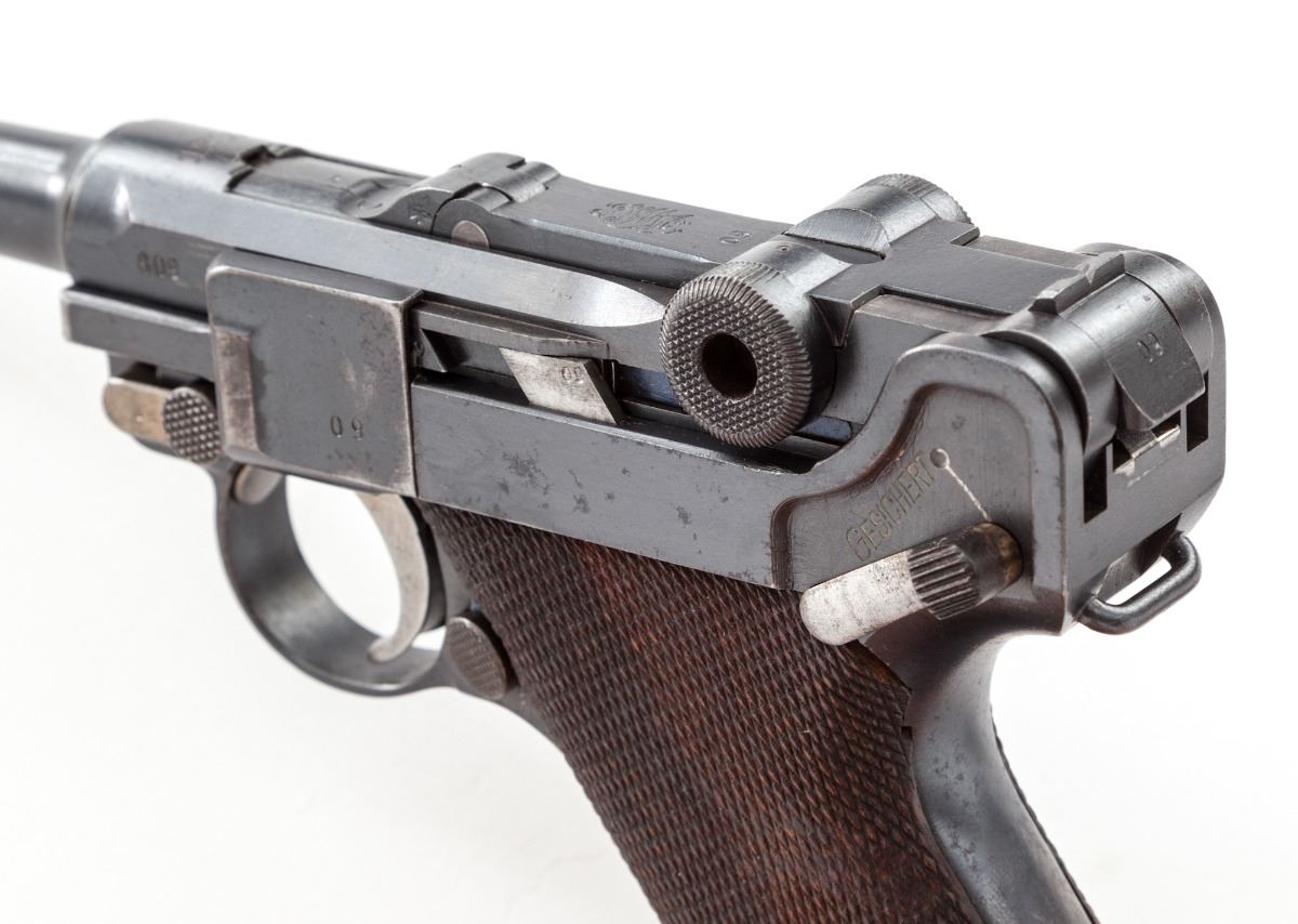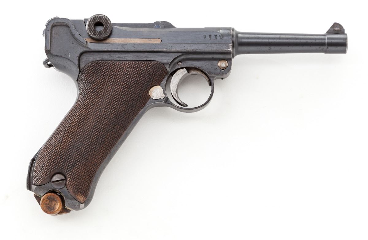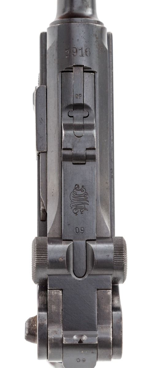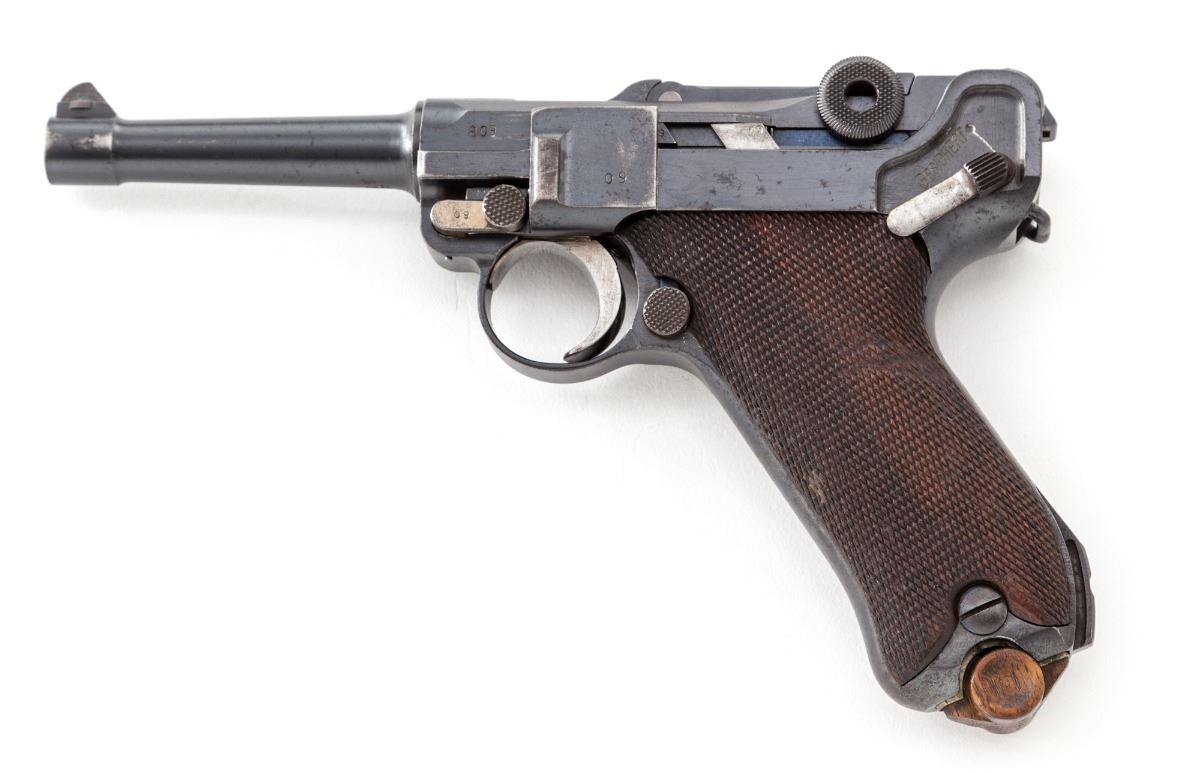 WWI German P.08 Luger, by DWM, #809o, 9mm, 4'' barrel, blue finish, straw colored small parts, factory checkered walnut grips, with mismatched WWI wooden based magazine. Chamber area dated 1916, safety marked ''Gesichert'', extractor marked ''Geladen''. Condition is about fine retaining approx. 90% original finish, with thinning to forward edges and highpoints of sideplate. Straw parts have thinned to approx. 30% with light pitting to thumb safety. Grips with mild to just moderate flattening and one small loss beneath thumb safety. All visible matching numbers, except magazine. Action is good, bore is about very good. Est.: $1,200-$1,800. (C&R/PPT)