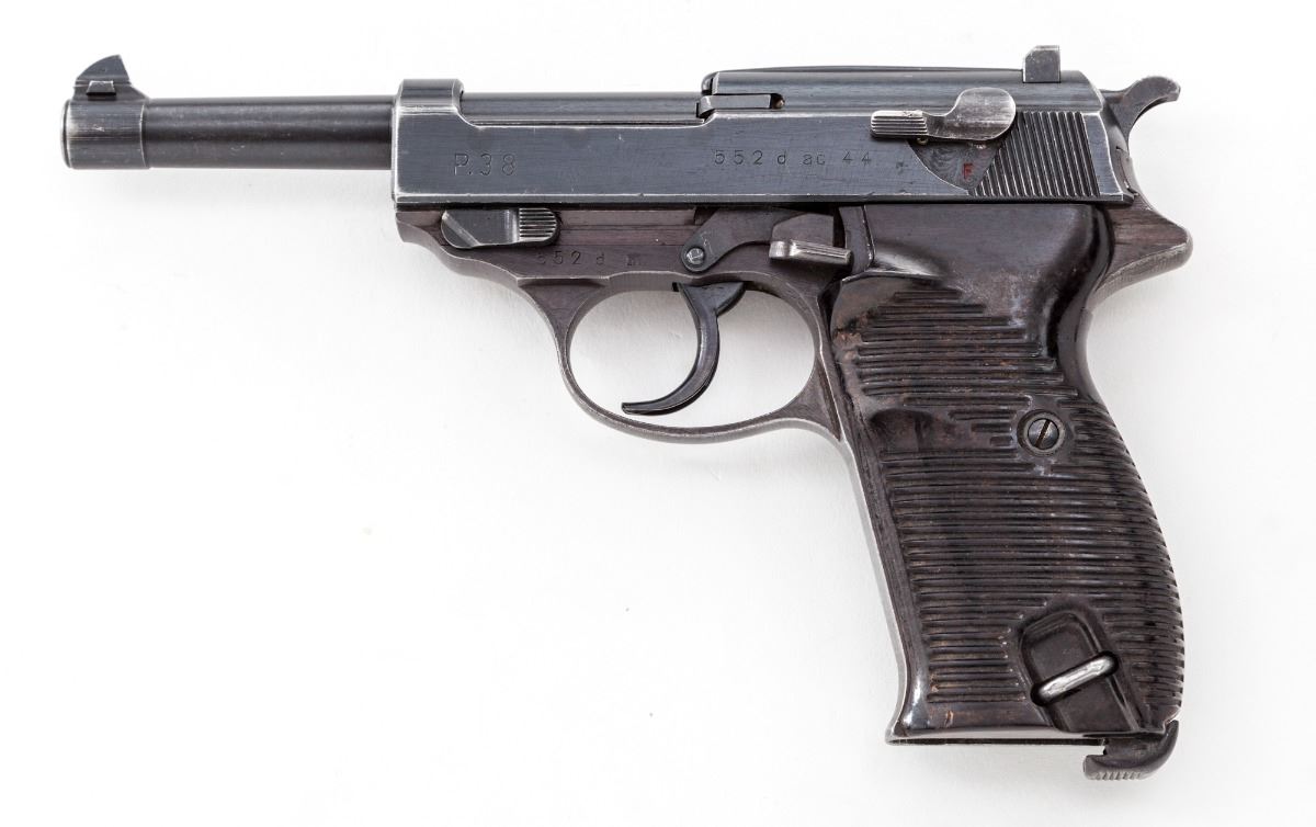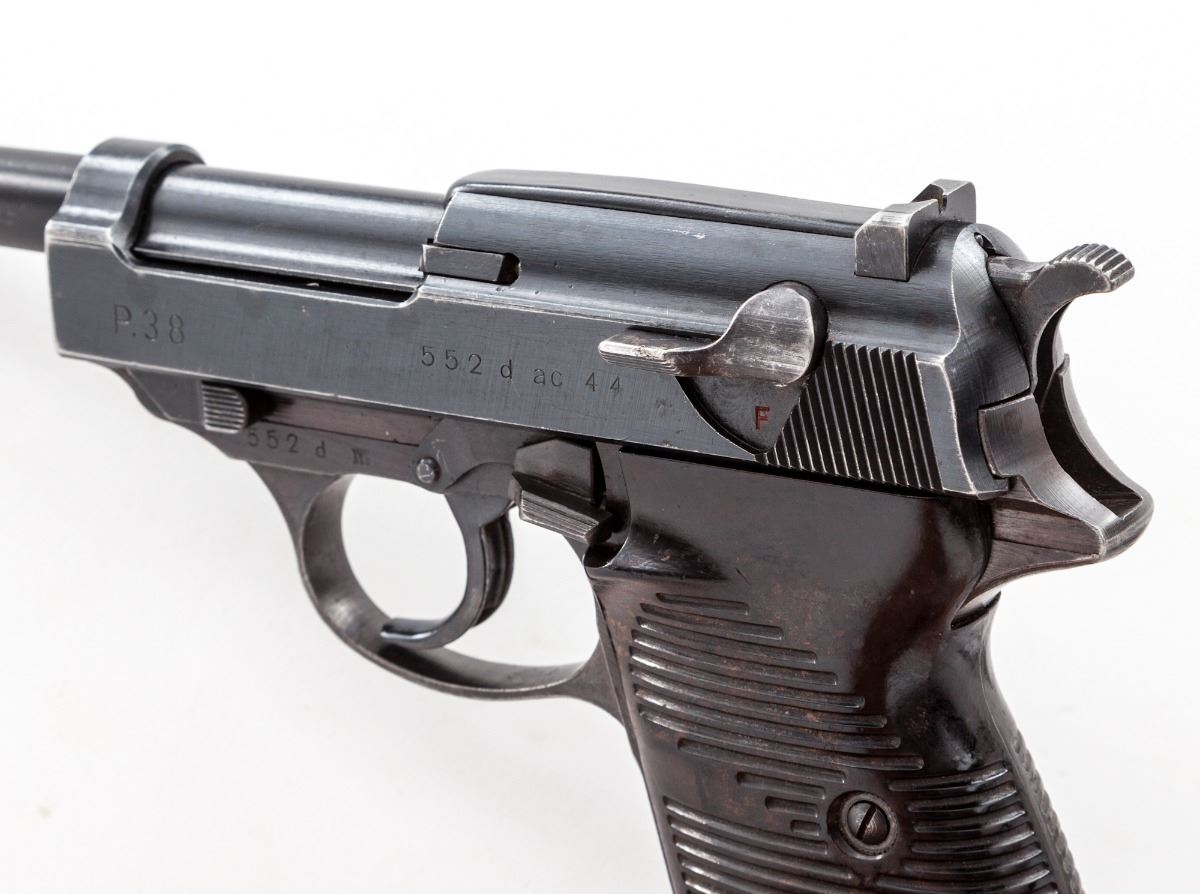 Wartime Walther P.38 Semi-Automatic Pistol (ac-44), #552d, 9mm, 4-7/8'' barrel, blue finish, grooved brown resin grips. No mag. Condition is very good to near fine with all visible matching numbers, including lock block. Approx. 85%-90% wartime finish remains. Grips show light to moderate use. Action is crisp, bore is very good. Est.: $500-$750. (C&R)
